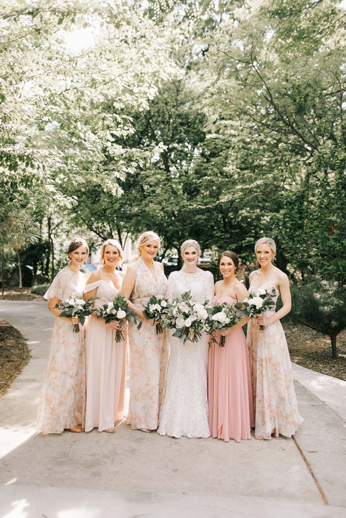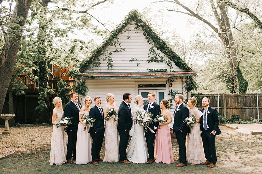 April 2017 came quickly for the couple together ten years before the special day. After a fun rehearsal dinner of swanky barbeque at Iron Star in Oklahoma City, everyone was ready for the main event. By 6:00 on April 15, 2017, loved ones had taken their seats in chiavari chairs surrounded by the soft setting glowing with candlelight and natural light streaming through the windows. Julie and Jared were so ready for the big moment after the first look they had done with Sarah Libby Photography before the ceremony. The bridesmaids wore floor-length gowns in shades of soft pink with varying styles, while the groomsmen wore navy suits and blue ties. The result was a pretty pop of color splashed across the floor-to-ceiling ivory draping at the front of the ceremony. When it was time for the bride’s big entrance, she stood nervously arm-in-arm with her mother before taking her first step down the aisle. “All I could think about was everyone staring at me,” Julie remembers. Her nerves faded away though when the curtains were pulled back and she saw Jared. “I remember feeling a sense of calmness but pure joy. I just saw his big smile and died a little,” Julie says.
