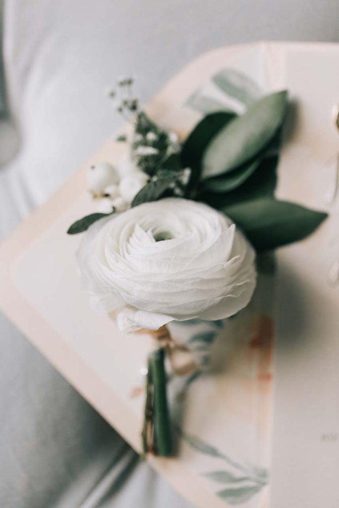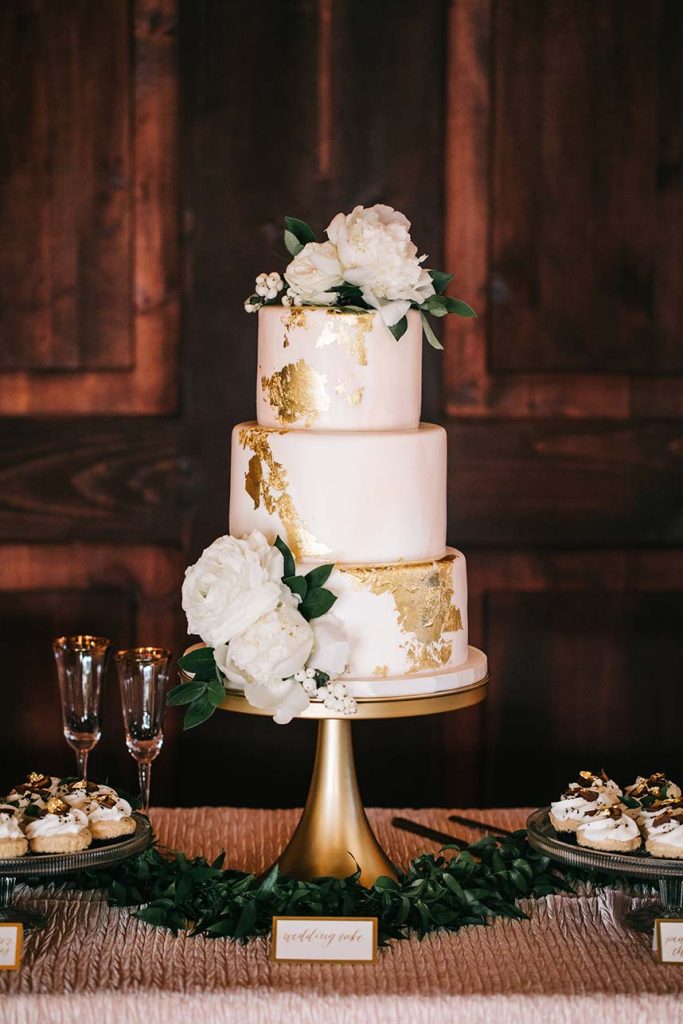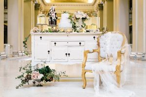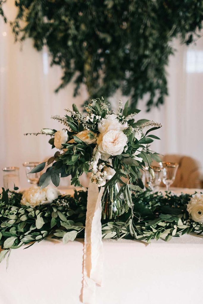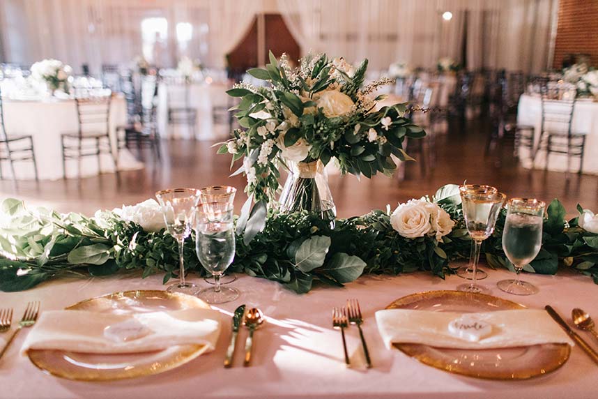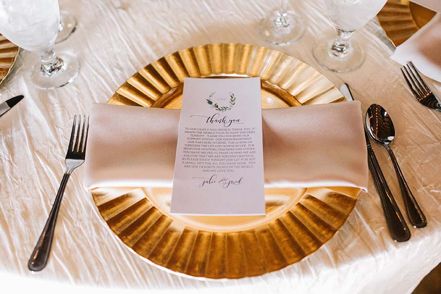 Guests were treated to cocktail hour while the ceremony site was “flipped” for the reception. The area where the rows of chairs had been was transformed into white-covered tables with gold charger plates and creamy centerpieces with table numbers etched on glass. While loved ones sipped wine and mingled, Julie and Jared had some time to themselves to soak in the evening. Then, they made their grand entrance to plenty of smiles and applause, and that unmatched voice of Nat King Cole sounded for their first dance. “We took some time picking out our song, and I knew I wanted something timeless. I knew we got it right when my grandmother said that my great-grandparents would be smiling from ear to ear with the song choice,” Jared says.