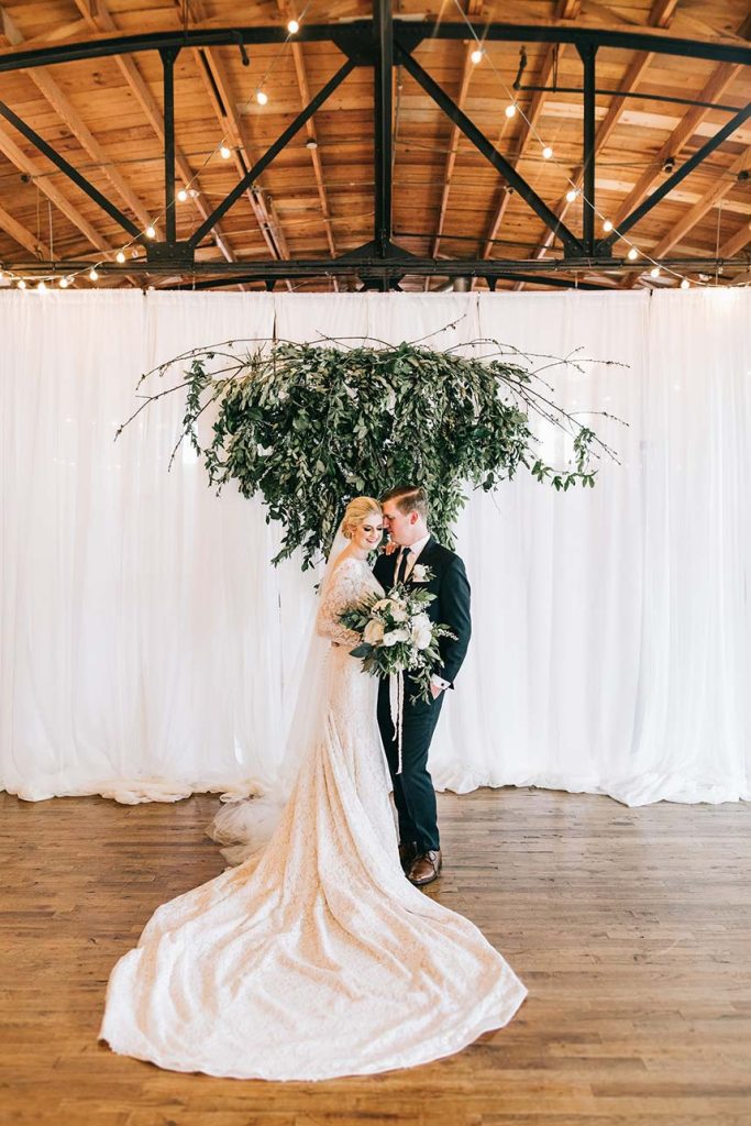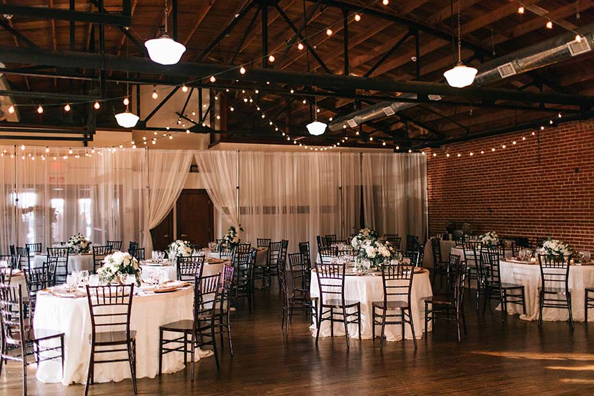 The couple took a couple weeks to soak in the engagement and celebrate with friends and family. But once Julie started emailing venues, she knew she was in for a big undertaking trying to plan a wedding while working full time. That’s when she hired wedding planner Ariana with Aisle Be With You, and everything started clicking. Since the majority of their families live in Ardmore, they didn’t want to pick a venue too far north. Once they visited the Hall at the Railhouse in Norman, they instantly had a favorite venue. Conveniently, Abbey Road Catering owns the venue, and Julie had them at the top of her list for catering the reception. The couple worked with Ariana in selecting colors and fabrics that kept the hall from looking too industrial to capture the romantic look they desired.