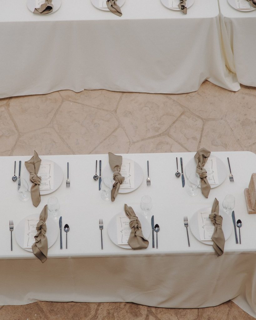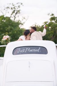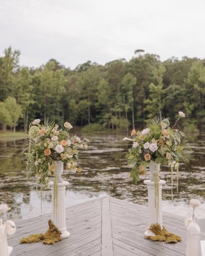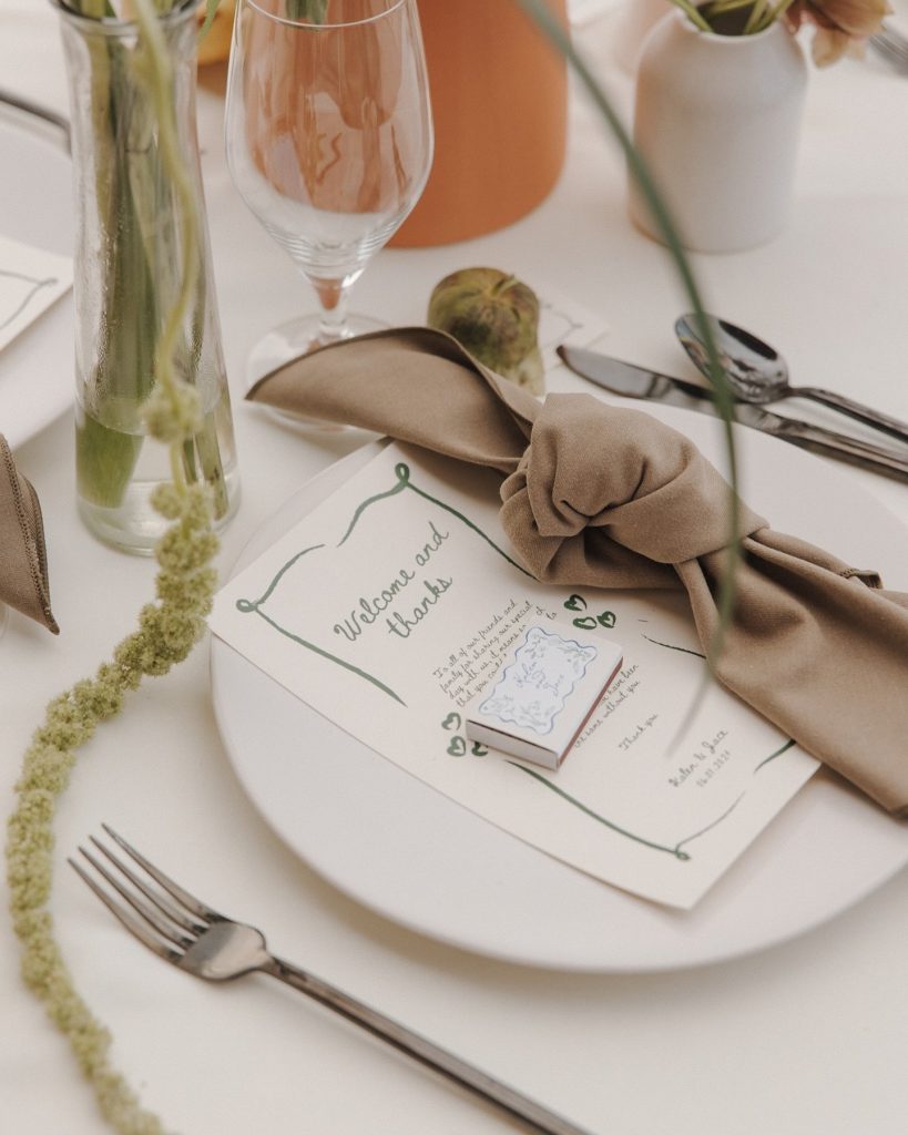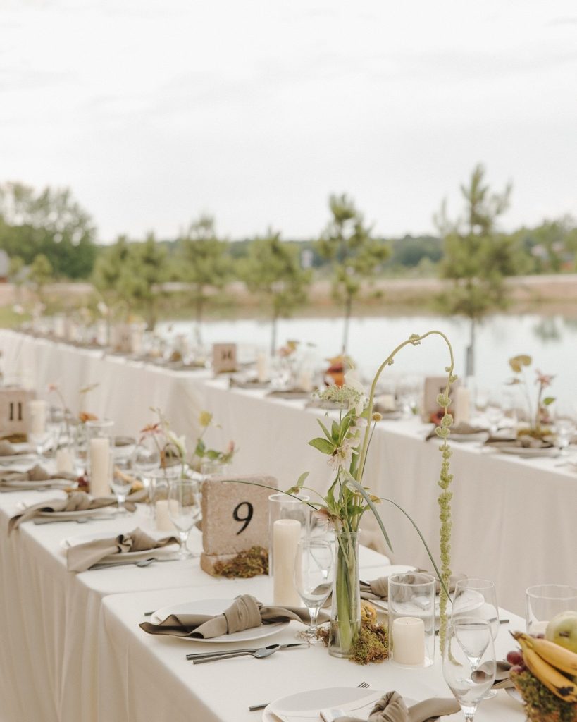 Their goal was to create a reception that had the cozy feel of an intimate family-style dinner party. Guests arrived at the lakeside ceremony greeted by lovely signage from Spratt Signs & Designs. As dusk fell, the atmosphere transformed with the warm glow of countless candles and other beautiful rentals from Party Pro Rents, adding to the magical ambiance. Guests were treated to delightful walk-away favors, including personalized matchboxes, ensuring everyone had a memorable experience to take home.