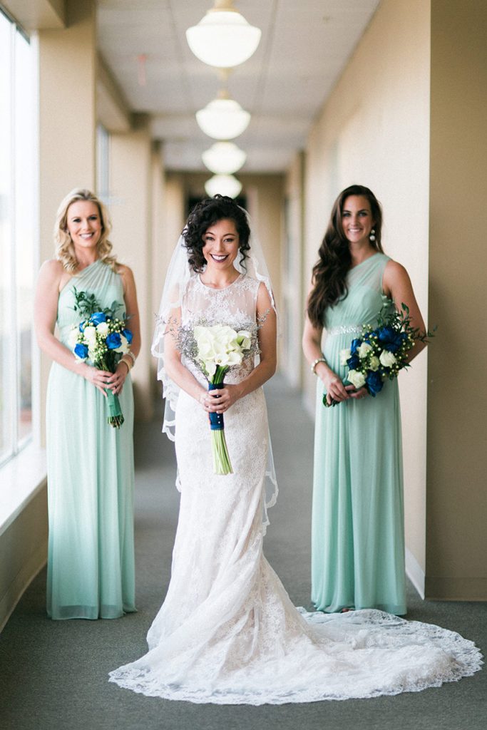 The couple chose rich colors of navy and gold with pops of mint green to embrace their spring wedding. Also in the spirit of spring, the couple chose a gorgeous three-tier, all-white cake that had gold and mint ribbon embellishments at the bottom of each layer with Gerber daisies to complete the look. Their wedding was simply gorgeous from the mint bridesmaids’ gowns and bouquets of white calla lilies – made by the bride and her girls – to Kelly’s stunning sleeveless, ivory Monique Lhuillier gown and matching cathedral veil.