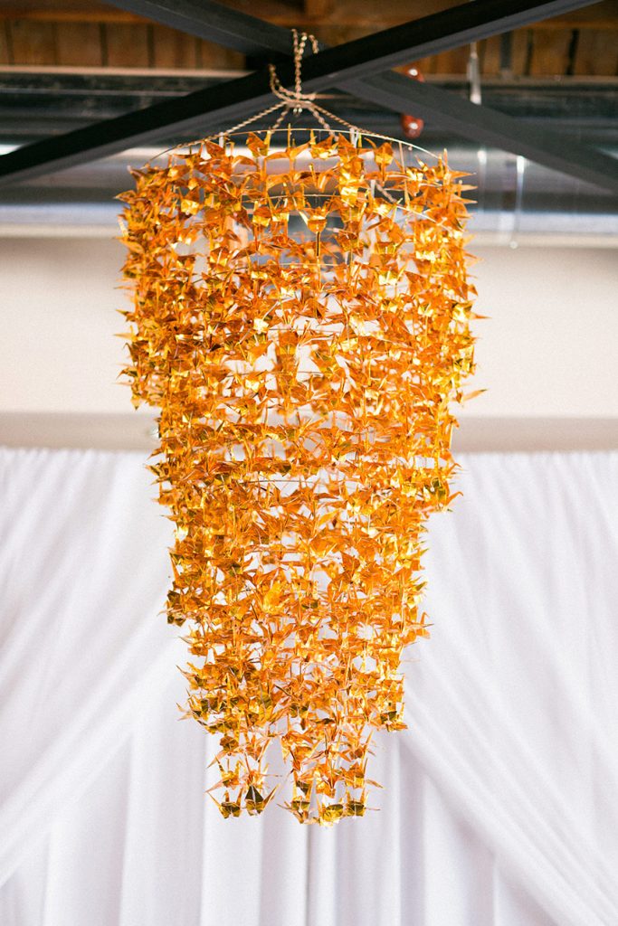On April 8, 2017, Kelly and Turner were married at The Campbell Hotel. Honoring Kelly’s Japanese heritage, she chose to follow the same tradition her mother did when she was a bride, which consisted of constructing 1,000 origami cranes before her wedding day. Kelly and her mom took the folded cranes and formed them into a striking five-foot chandelier that hung from the rafters directly above the couple at the ceremony. Guests were touched by the special meaning and work put into the statement piece. Kelly and her bridal party also created all the silk flower arrangements used as centerpieces.