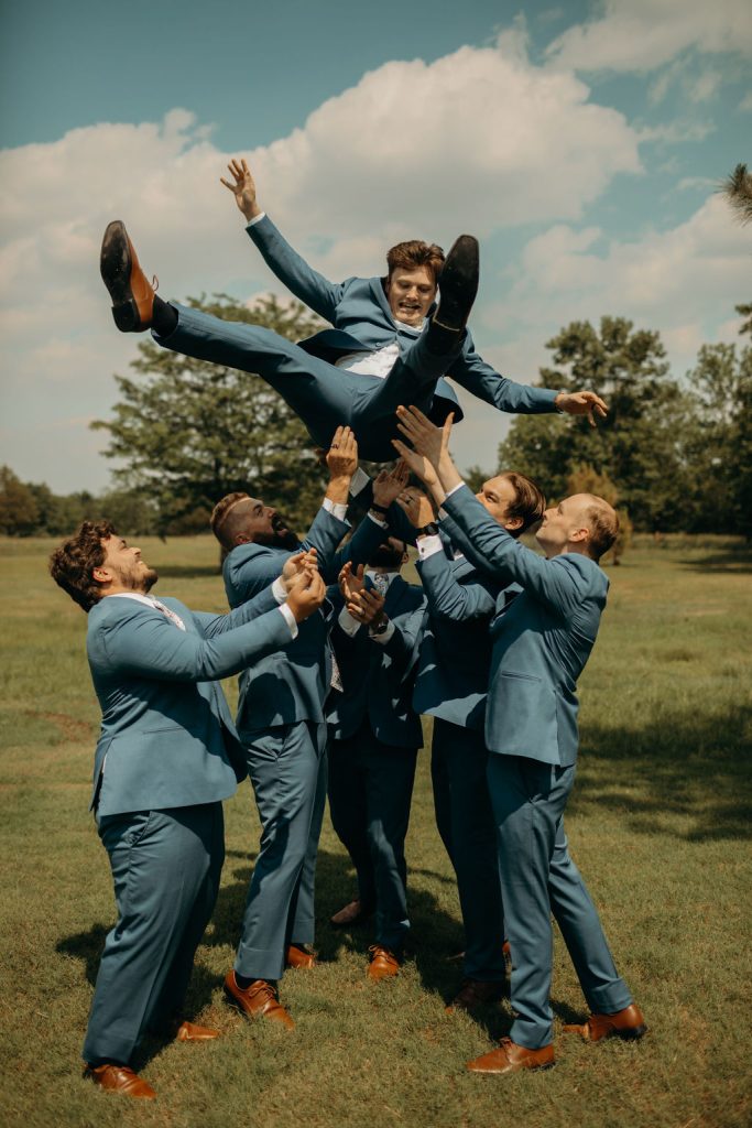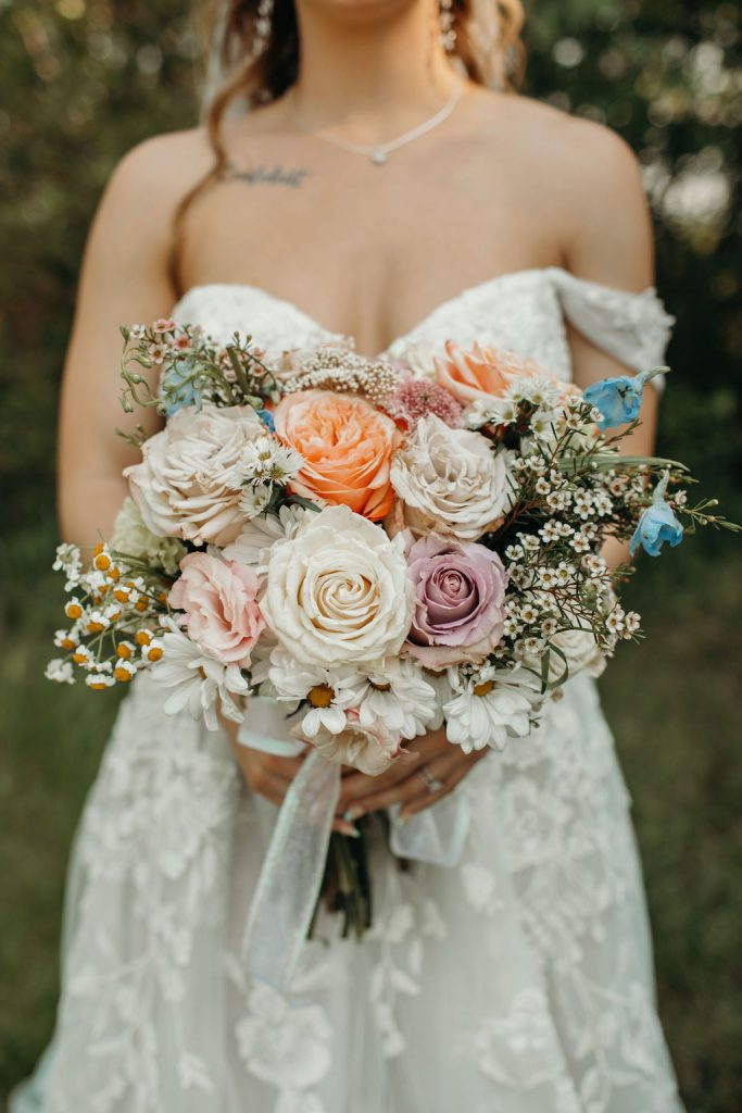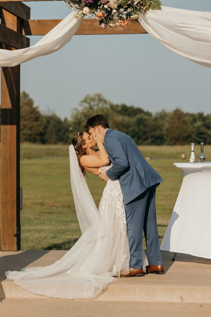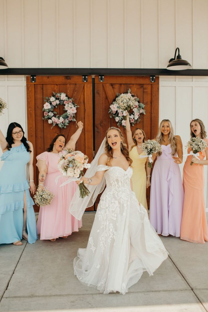 Kiana and Blake’s spring wedding at Eight Ten Ranch and Cattle Co. was a picturesque affair, highlighted by a serene outdoor ceremony beneath the venue’s raised cedar arbor. The wedding party added to the vibrant atmosphere with their stunning multi-colored dresses, reflecting the joyous spirit of the day. Cheers to these newlyweds!