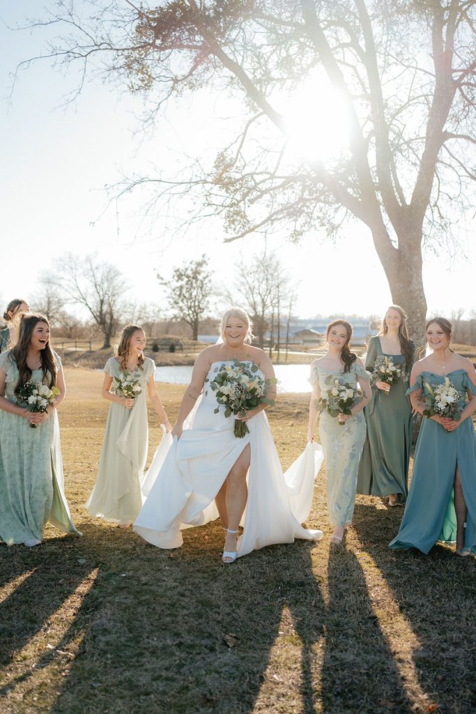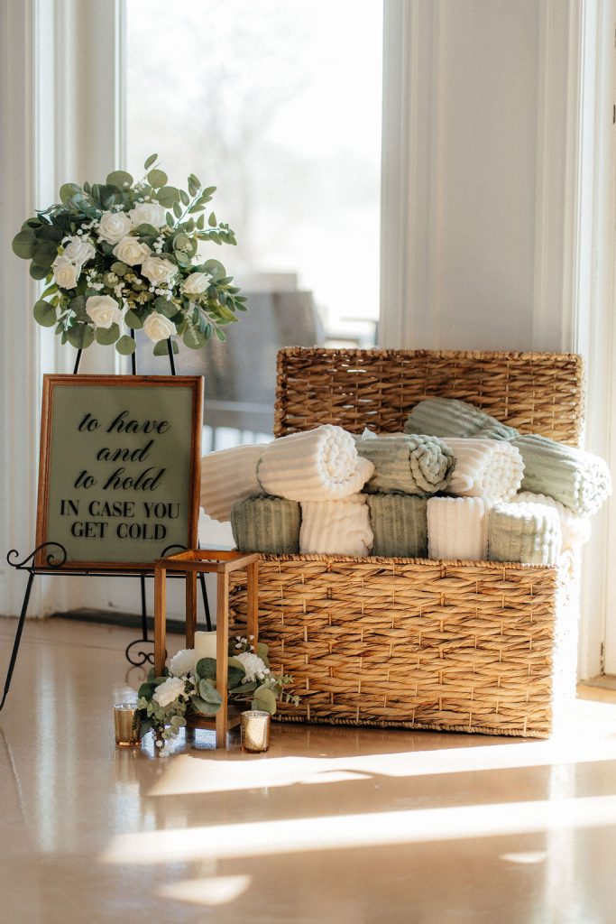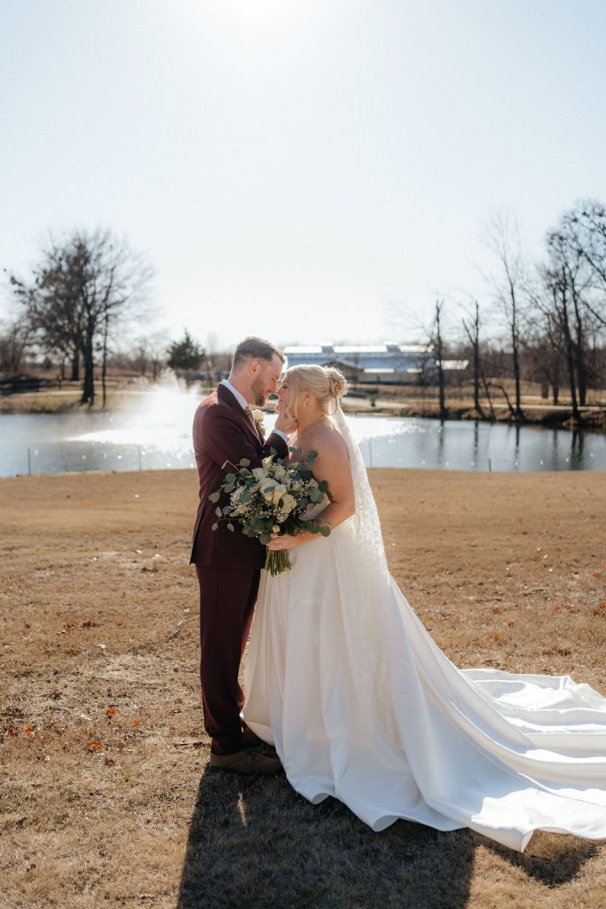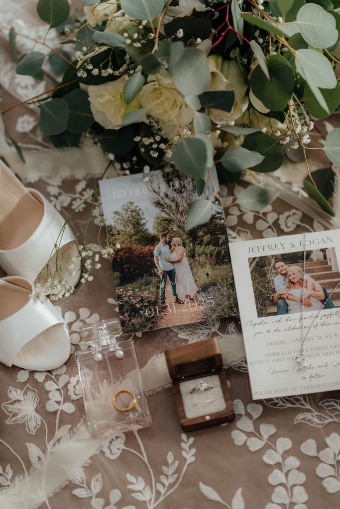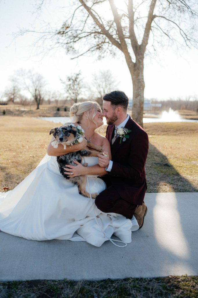 Logan & Jeffrey’s classic winter wedding at Emerald Falls Event Center was absolutely gorgeous! Featuring shades of green, the couple had an indoor ceremony followed by an indoor reception. The bride shared with us some details about the day: “As an anxious person by nature, our wedding day was the most peace-filled day I have ever experienced. We did both a first look and read our private vows, and also read our vows during our ceremony for our guests to hear. We had blankets for our guests to snuggle with as it was a cold evening in Broken Arrow, these were a big hit! We took special photos with our Puppy, Juniper Belle, as she was our little flower girl.” Cheers to the newlyweds!