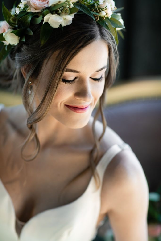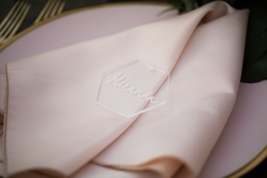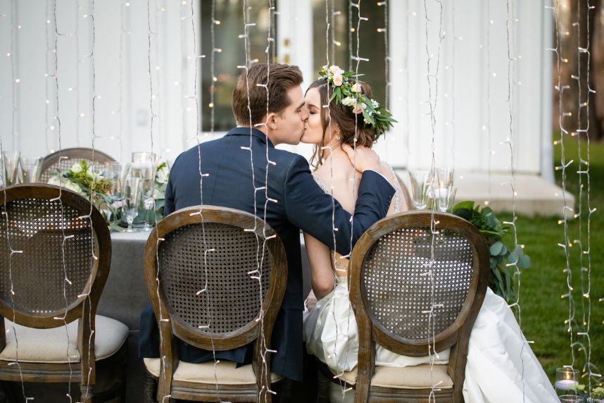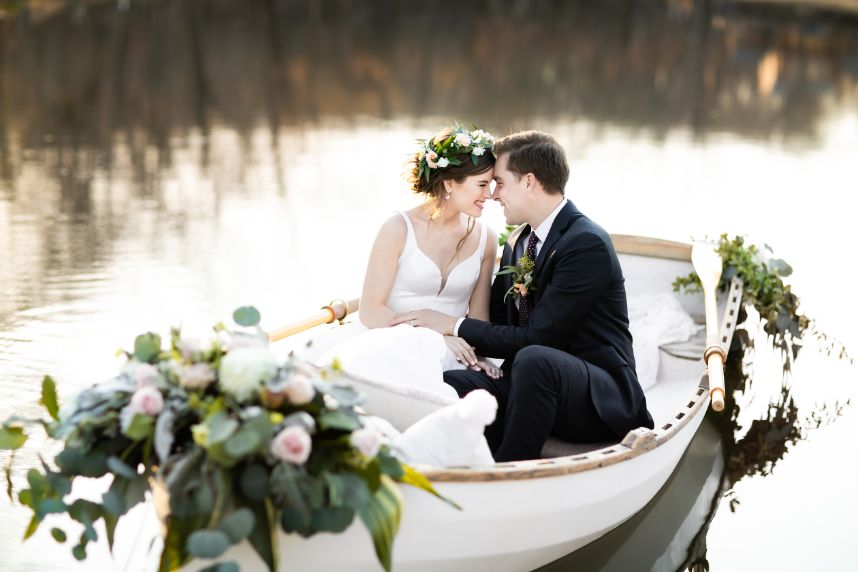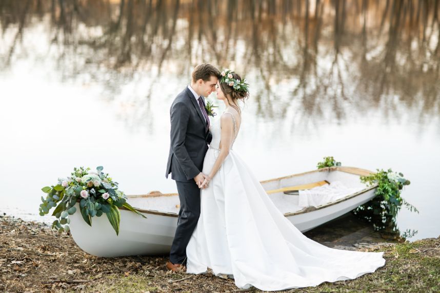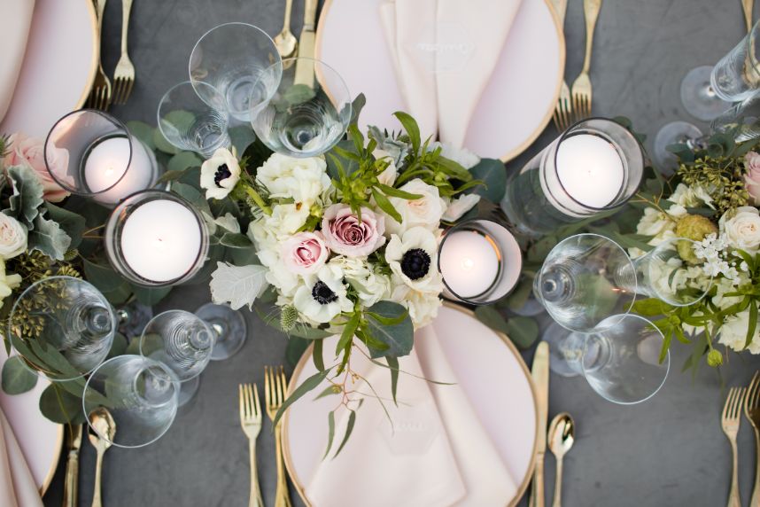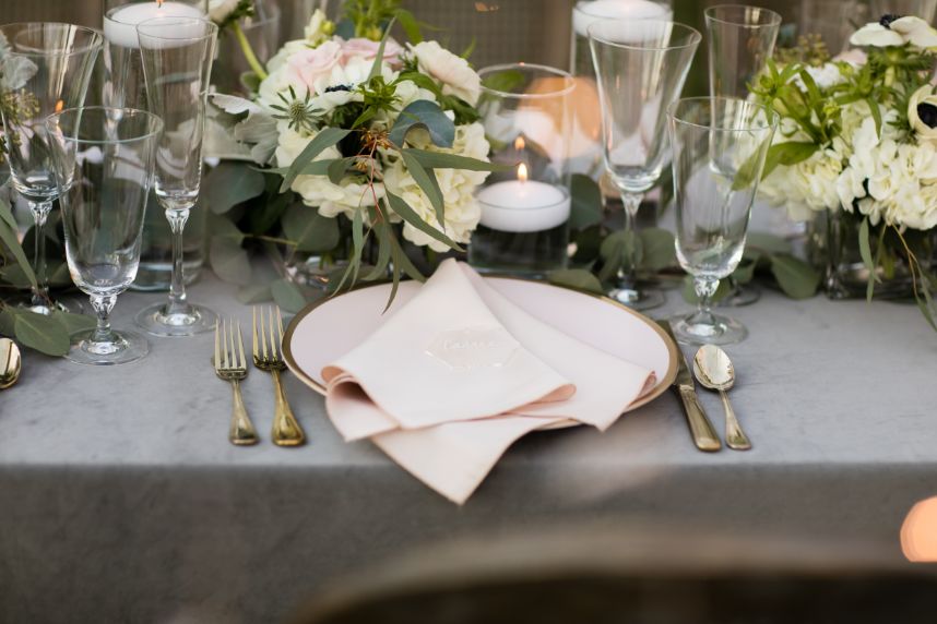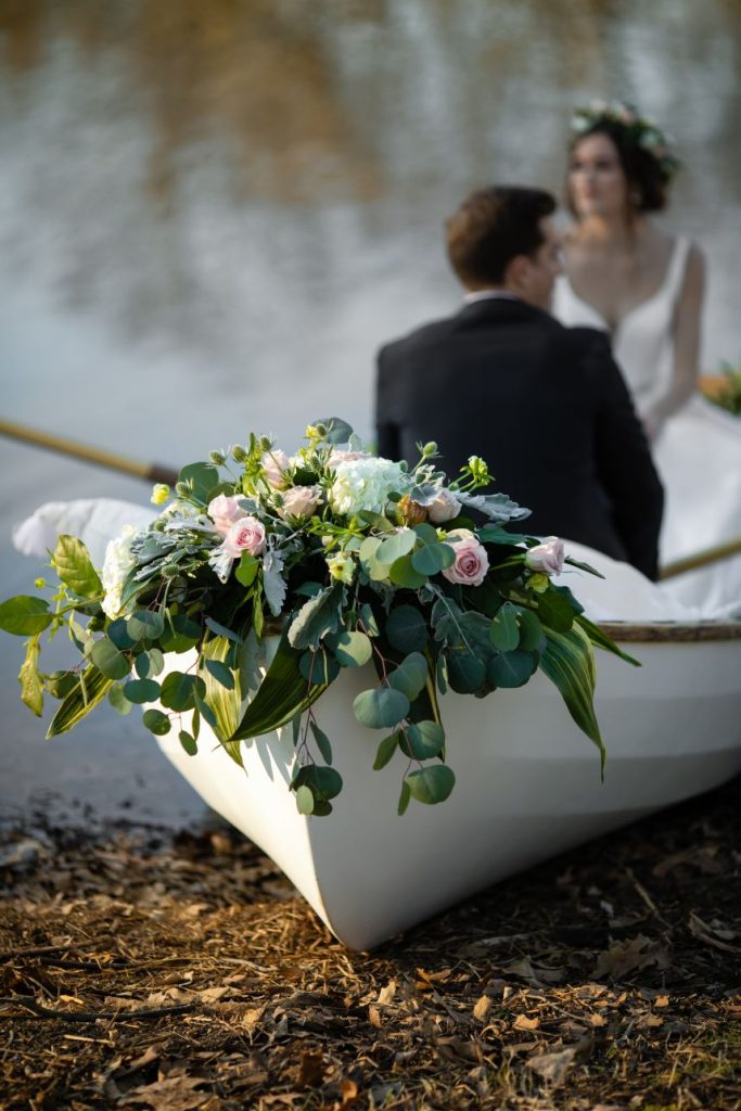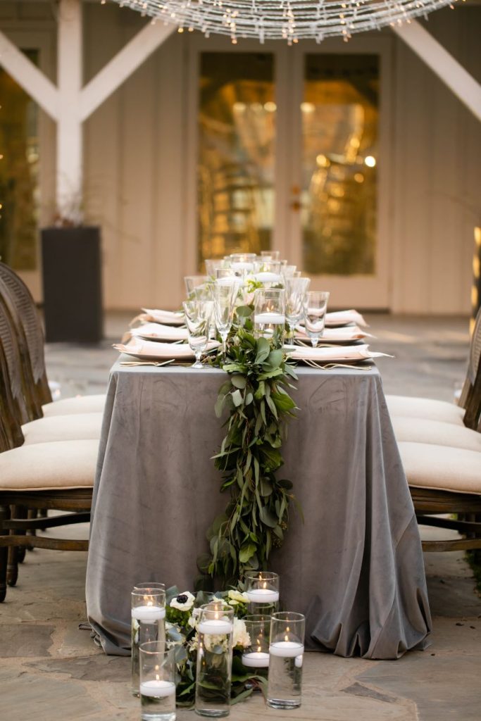 From Nicole Allen Events: “The inspiration for this shoot started with the adorable rowboat. We knew that we wanted to keep things soft and romantic with a touch of boho, so we stuck with blush pink and grey. Velvet is one of our favorite trends right now, so we chose grey velvet linen, paired with the Grey Dust Rattan Back Louis chair. To make a statement on the grey velvet, we paired the gold and blush heirloom charger with blush napkins and gold flatware. For flowers, we stayed consistent with the romantic vibe and chose white and blush blooms with a thick greenery runner. We had the greenery running off the ends of the table with petals and candles trailing, and inside of the light tunnel it was truly magical!”