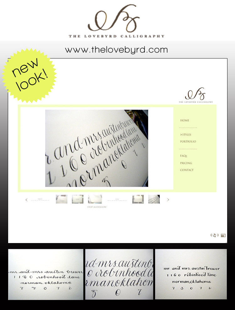 Lovebyrd Calligraphy has launched a fab new Web site for 2011 featuring 10 unique portfolio styles! Check out this chic site to view The Lovebyrd’s gorgeous new designs. Browse through their extensive portfolio of beautifully crafted envelopes, place cards, table names and more. Lovebyrd Calligraphy gives the smallest details a unique and exquisite touch! Contact The Lovebyrd Calligraphy at 405.306.5366 or [email protected].