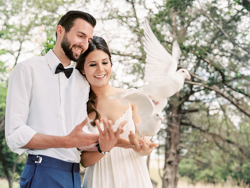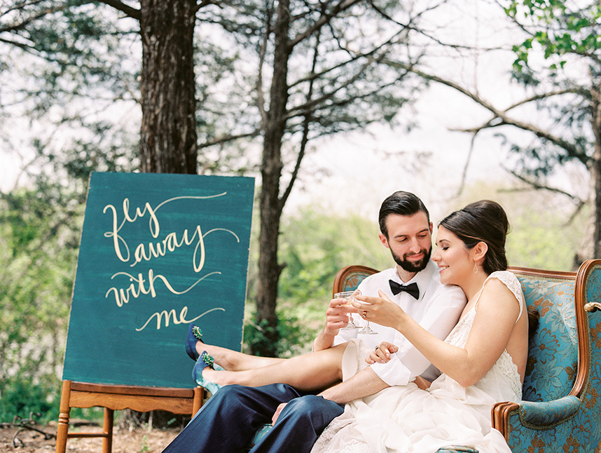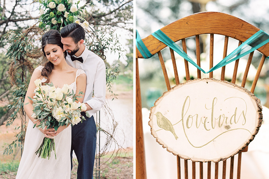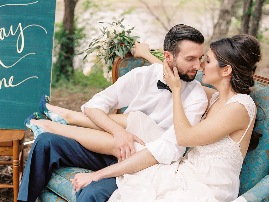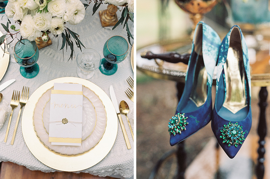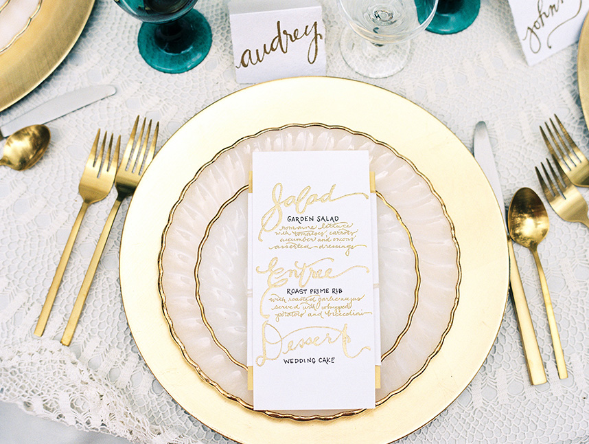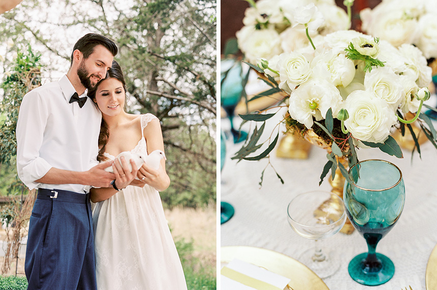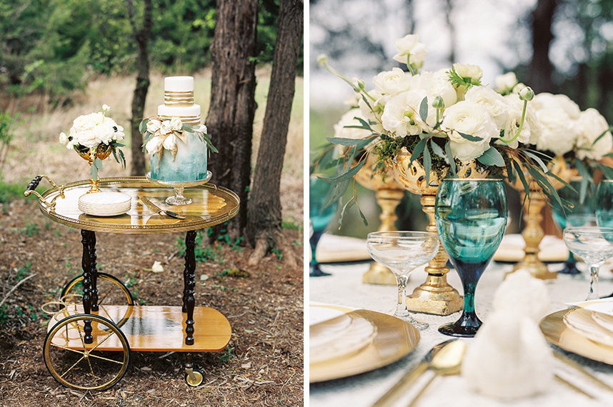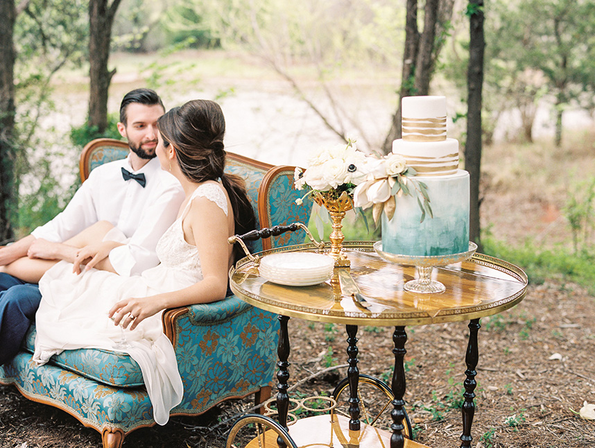 We absolutely love this teal and gold wedding inspiration shoot captured by Sheradee Hurst Photography! The stunning gown and grooms attire from J.J. Kelly Bridal Salon were perfectly paired for a simple but elegant look. The model bride carried an oversized bouquet of white blooms crafted by Trochta’s Flowers and gracefully pulled off a side-swept updo styled by Trichology Salon. The gold details and pops of teal throughout the decor from Ruby’s Vintage Rentals added a subtle hint of royalty and glamour. Amy Cakes outdid herself with this gorgeous watercolor cake that looks far too exquisite to eat. Enjoy this soft and beautiful shoot for yourself!