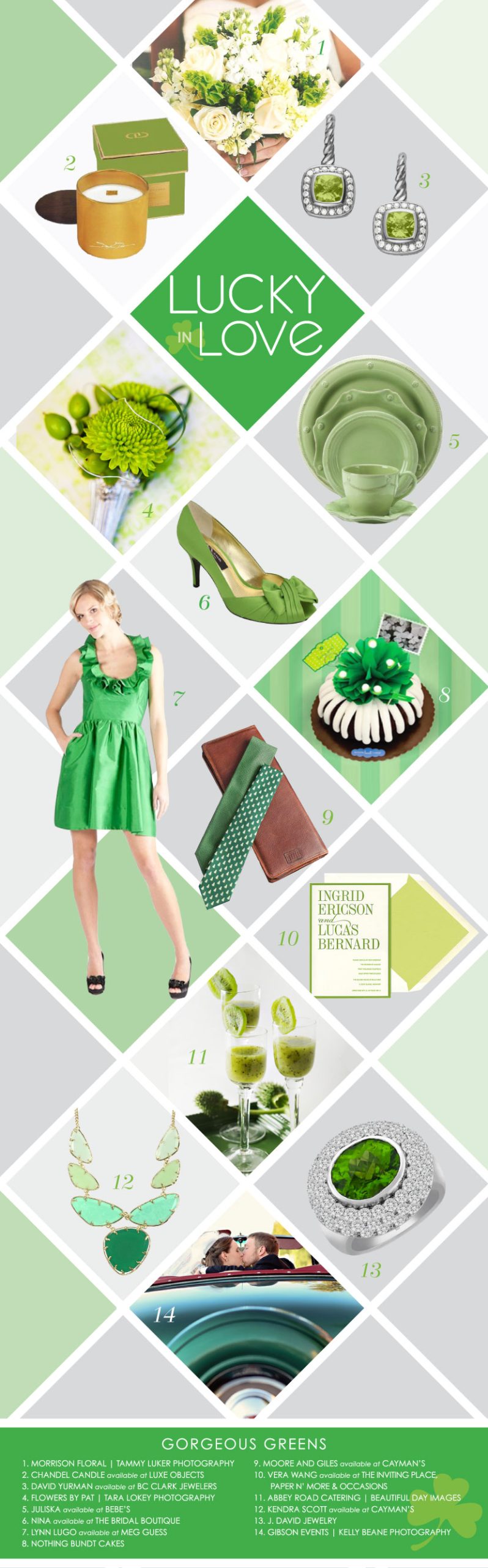 The luck of the Irish is officially upon us, and we are excited to celebrate being lucky in love! In honor of St. Patrick’s Day, we wanted to share some lovely green finds from lush florals to fabulous fashion! A dash of green is all it takes to turn your special day into a springy and joyful occasion. Happy St. Patty’s Day this weekend!