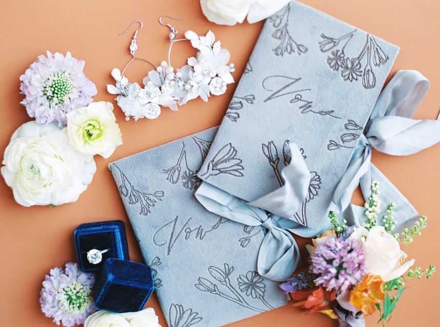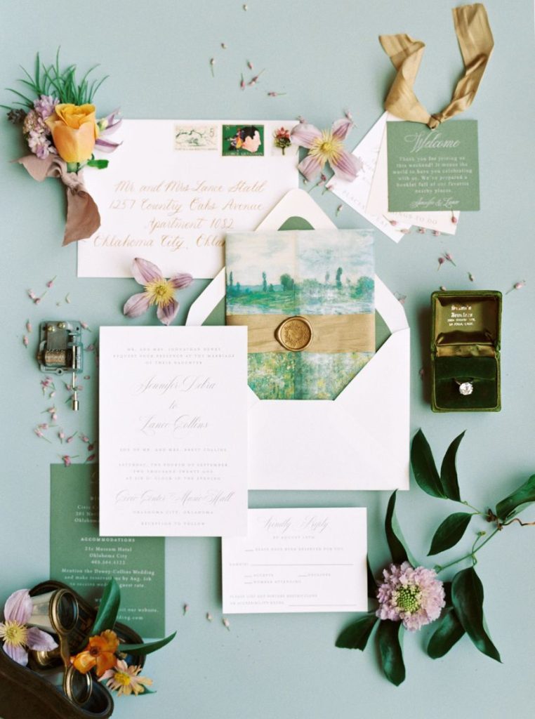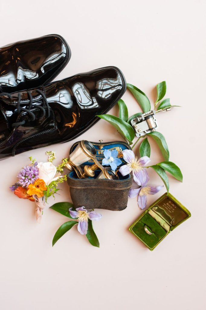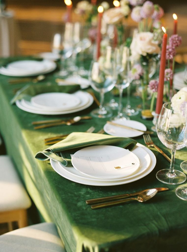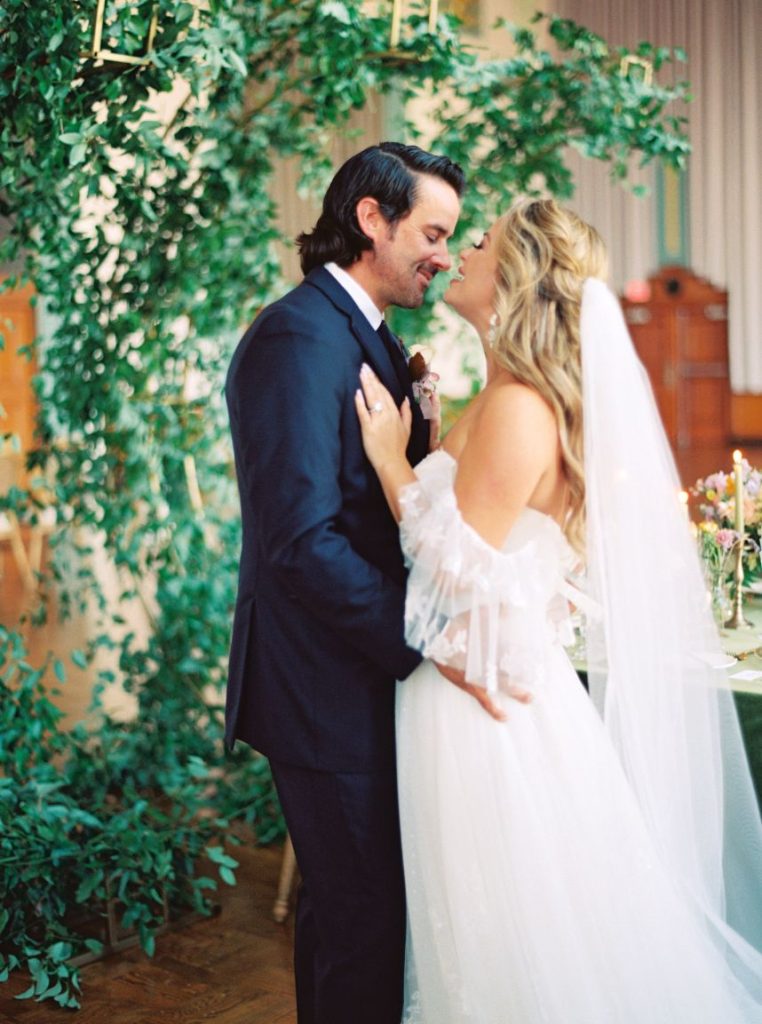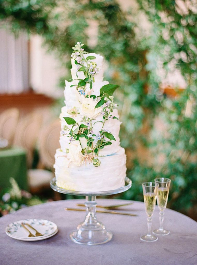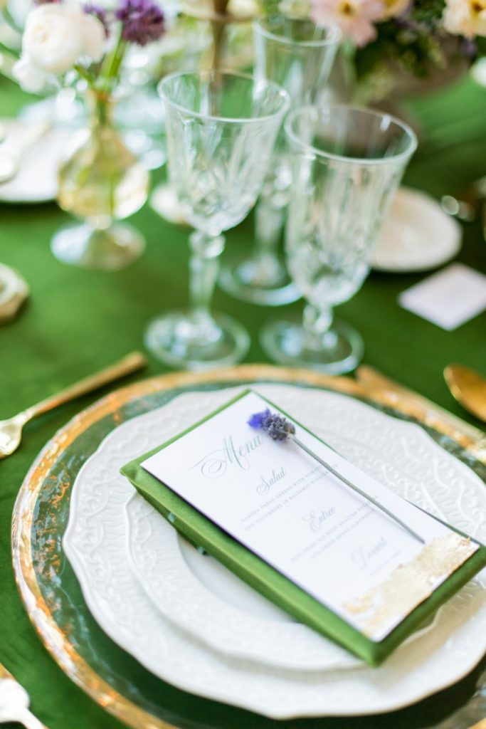 The perfect gown for this styled shoot came from Chantilly Bridal Studio, hand-picked for its off-the-shoulder ruffle sleeves that were simply to die for, modeled by this bride as she made her way through the day with the love of her life. Pretty paperie designed by The Letter Box invites guests in style and a delicately scripted menu makes it hard for us to choose an entree for this faux reception. Cakes made in multiple stunning designs by Amy Cakes look far too good to eat, but we can hardly turn down a slice when they look this good! From the springy blooms that graced table centerpieces and bouquets to the opulent vintage rentals that decorated all the right spaces, there isn’t a detail we don’t love in this garden-inspired shoot. Read on for a note from one of the creatives that worked to bring this lush green wedding inspiration to life. Cheers!