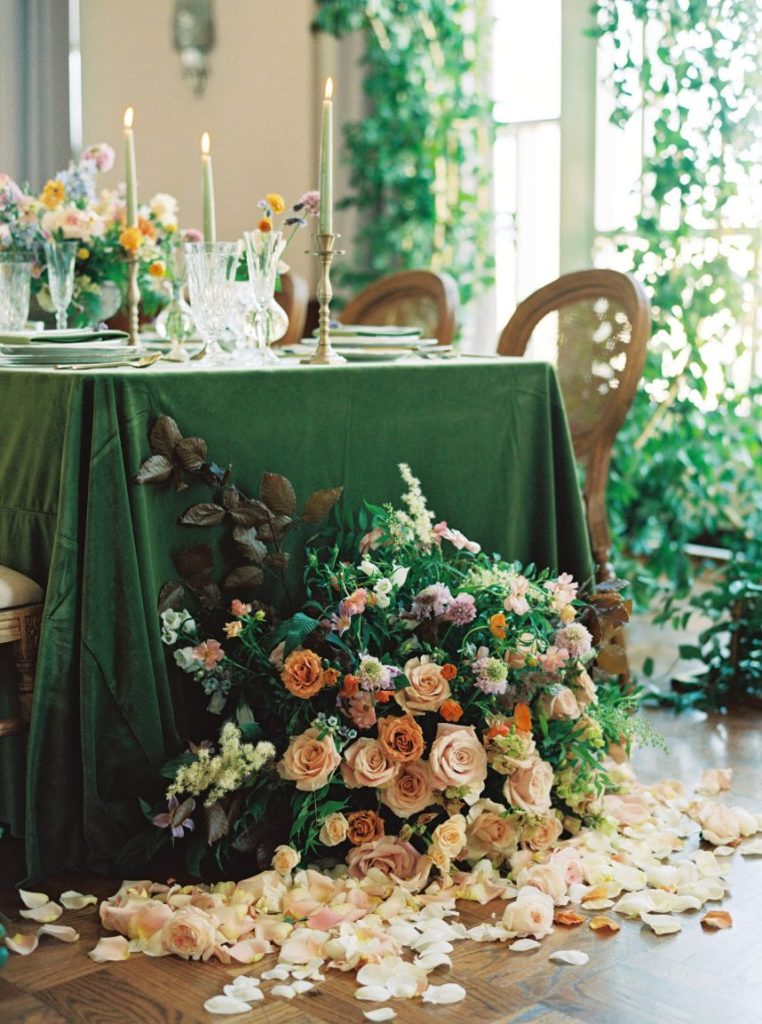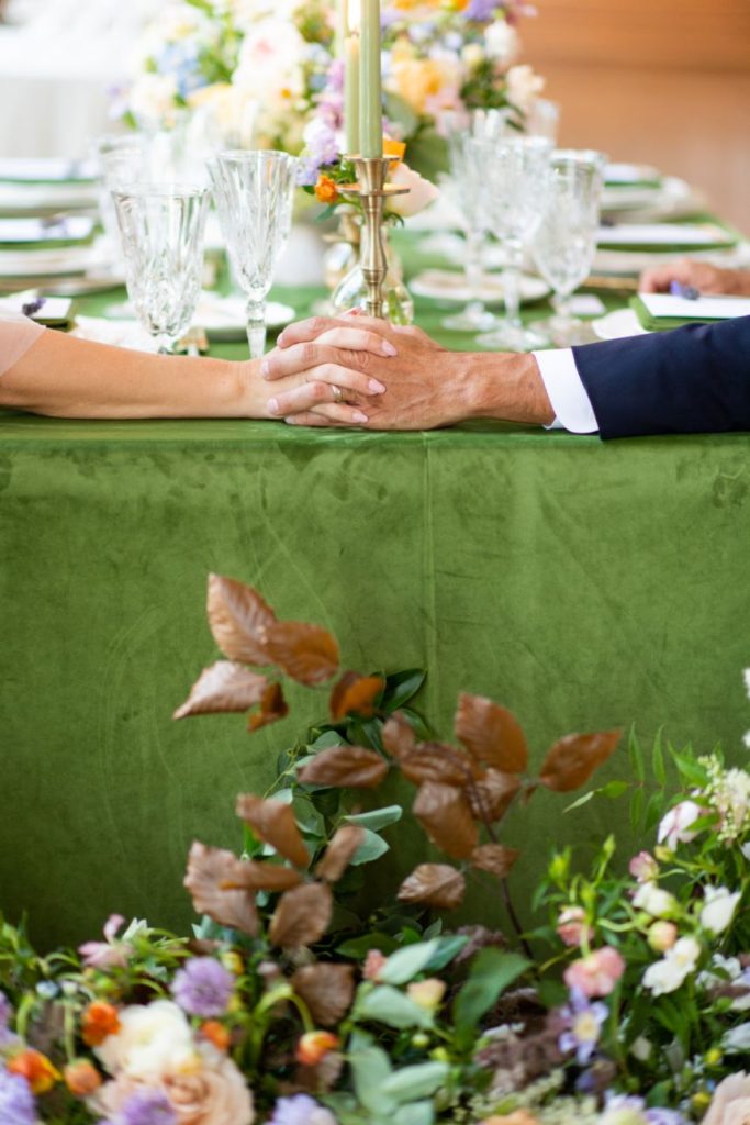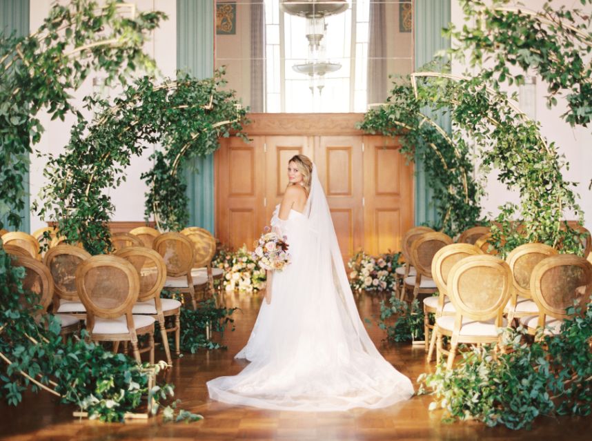 Fall in love with the lush green wedding inspiration recently submitted by some seriously talented local vendors to unfold at Civic Center Music Hall! Magical amounts of greenery from Poppy Lane Design shroud this ceremony setup and bring the allure of a forest wedding indoors and what’s not to love about grand indoor garden party vibes? A luxe green tablescape touches and regal décor from Marianne’s Rentals can charm anyone, but this styled shoot goes the extra mile with details that look straight out of a fairytale storybook.