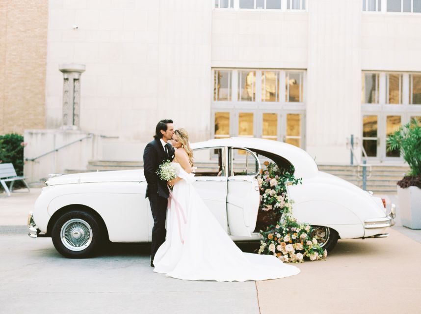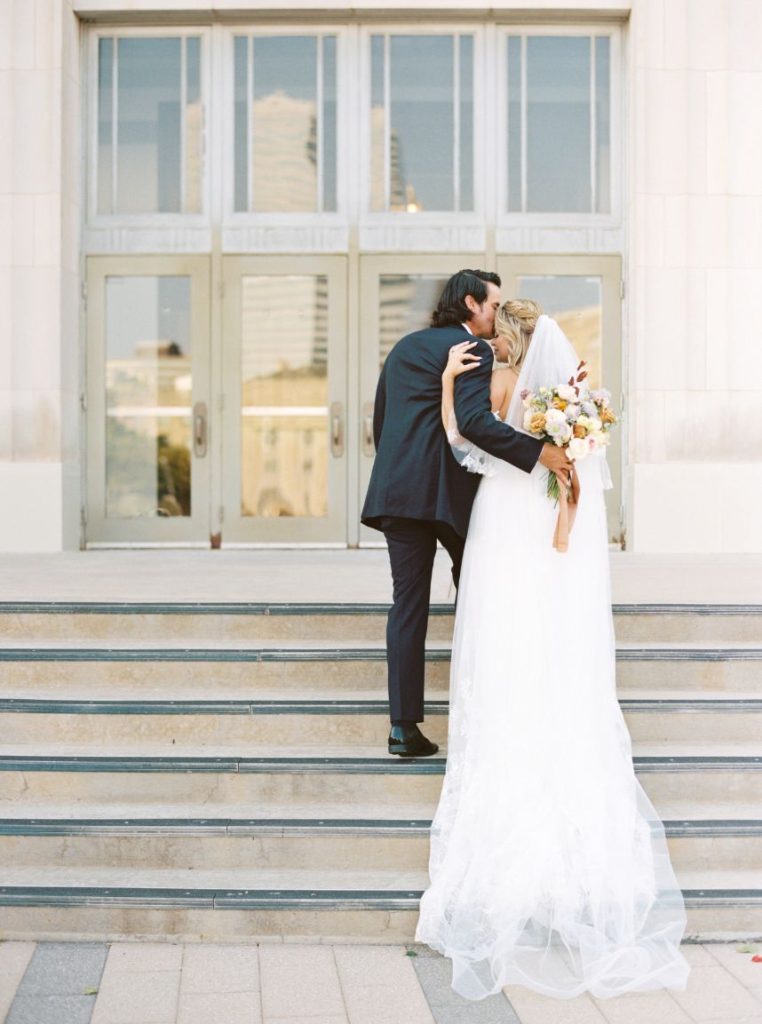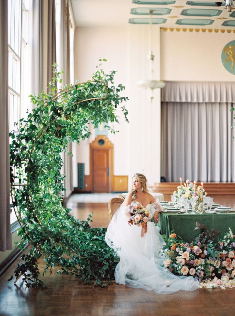 From the photographer: “Step into this romantic oasis, complete with a floral ‘Tunnel of Love.’ With a dress change and subtle styling differences, this shows couples different options with this gorgeous green color palette. Oklahoma can have temperamental weather and bringing the outdoor feel inside is perfect for those who want the look and feel without actually having to risk being outside! All of this is set in the Civic Center Music Hall Grand Meinders Hall of Mirrors featuring original Art Deco architecture dating back to the 1930s.”