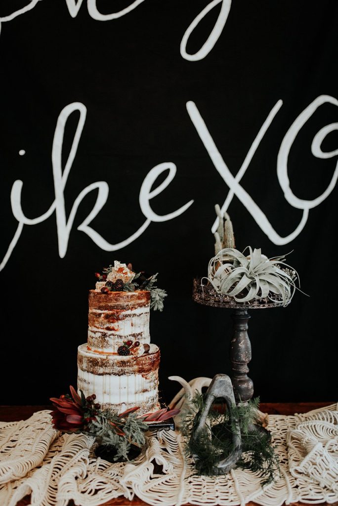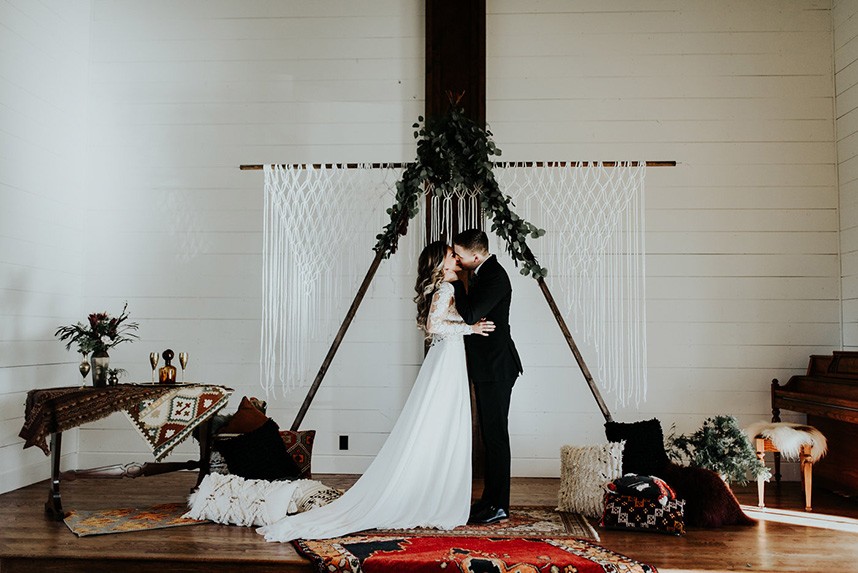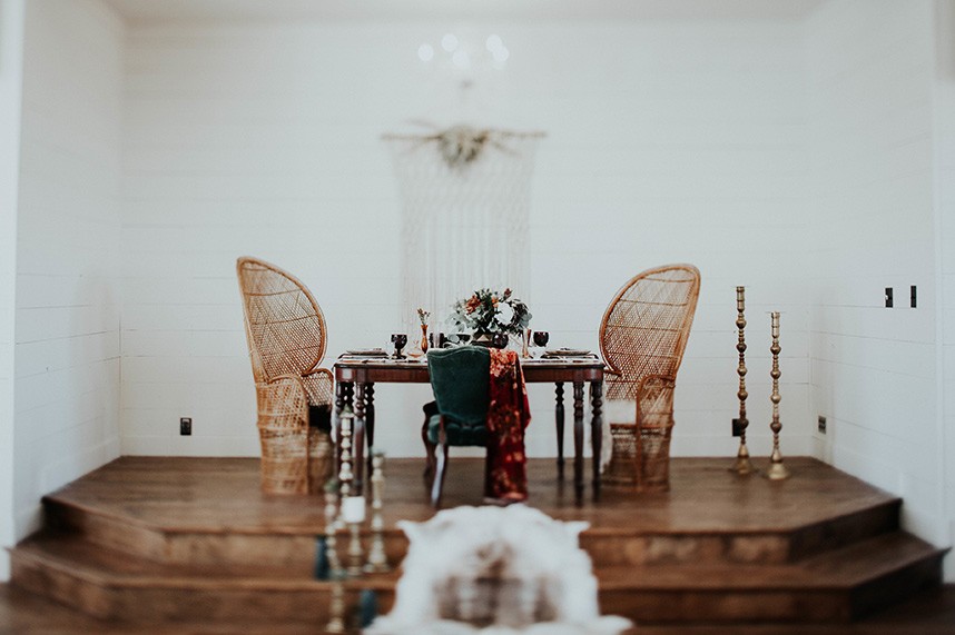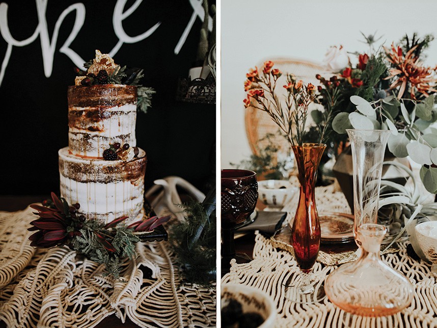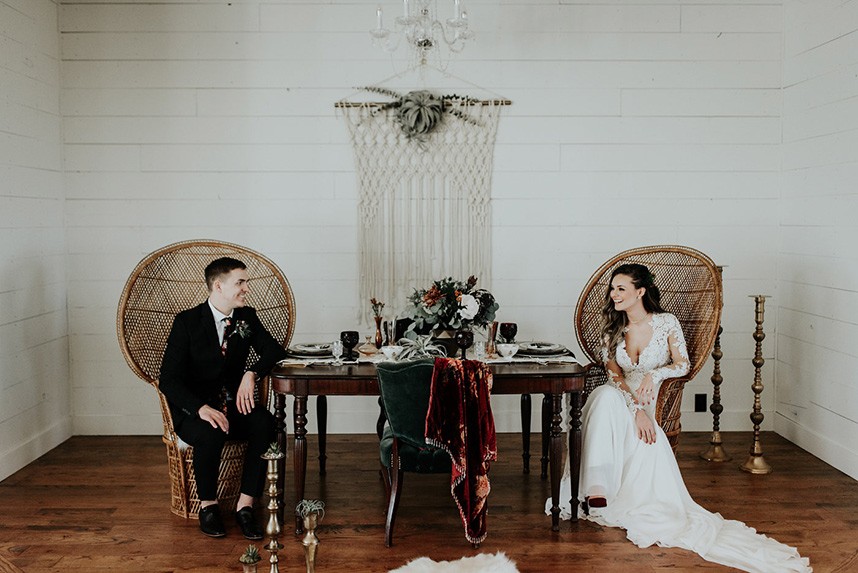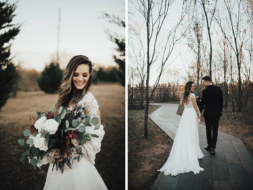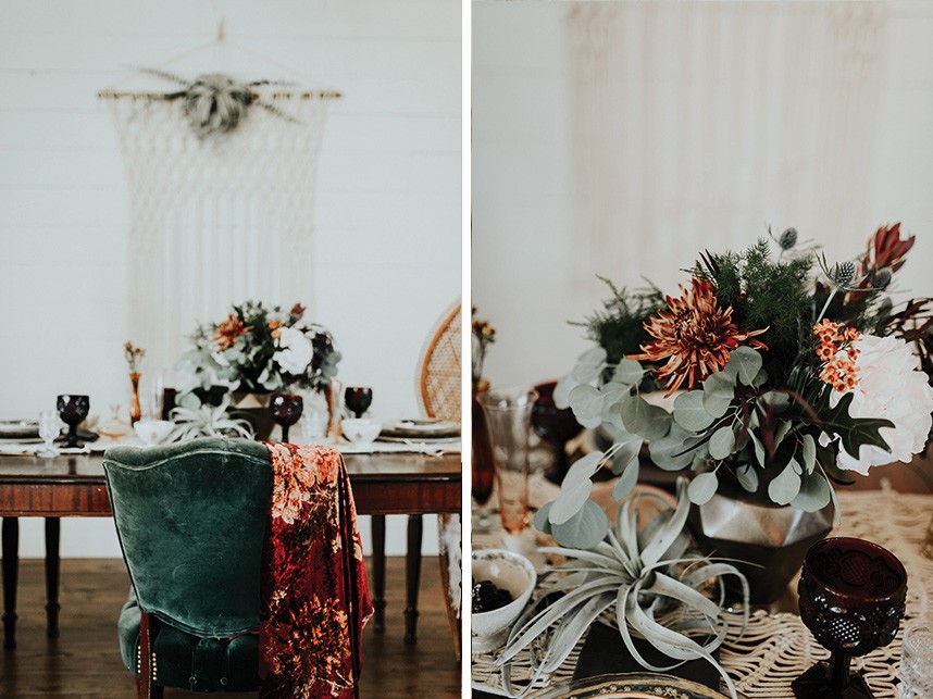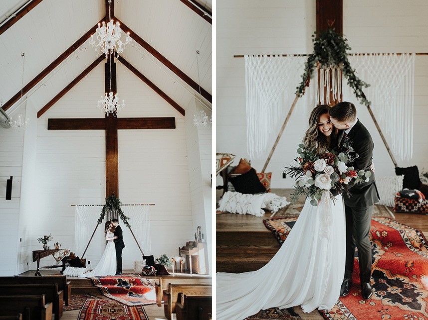 With the gorgeous Southwind Hills Chapel as the backdrop, this fantastic team created an intimately luxe styled shoot, bringing us endless amounts of bohemian wedding inspiration! Peyton Rainey and Chelsea Denise easily captured the free-spirit feel of the shoot both inside and out of the the chapel, from the greenery and macrame adorned alter to under the golden light of a perfect Oklahoma winter sunset. Forever Cole Events created the most extraordinary floral arrangements to fit each vignette of the shoot. The model bride stunned in an ethereal, lacy, long-sleeve gown from Prescott Bridal, with a golden, glowy makeup look created by Chelsey Ann Artistry. Shades of umber, rusty red, teal and forrest green were interwoven through the decor, providing a rich color palette in everything from the table setting to the unique and thematic tiered cake from Amy Cakes. We can’t get enough of this stunning shoot!