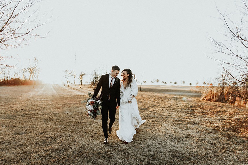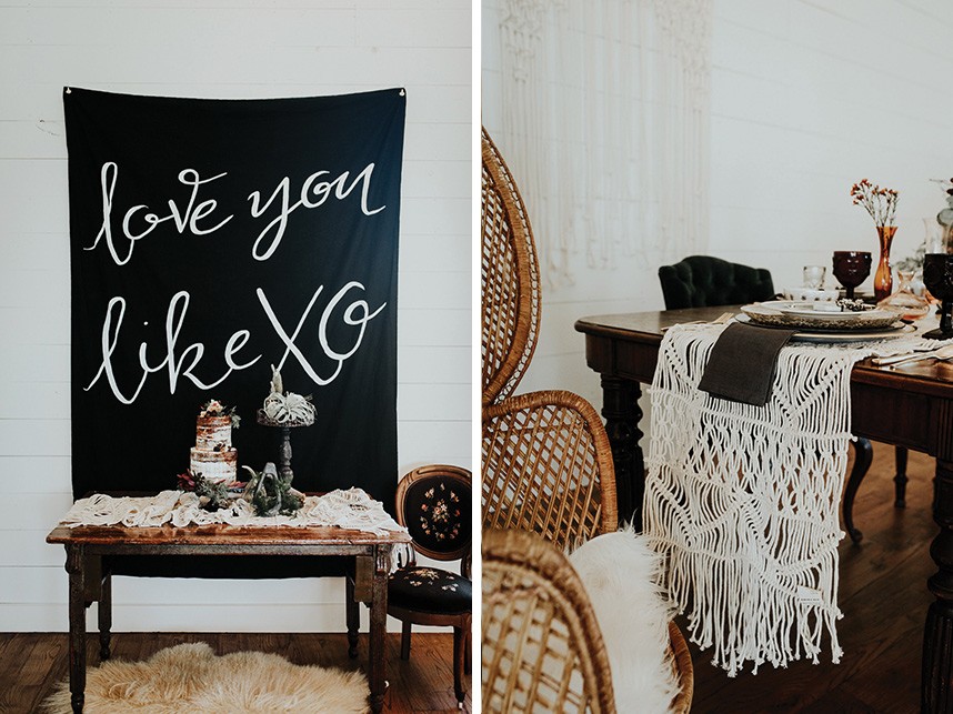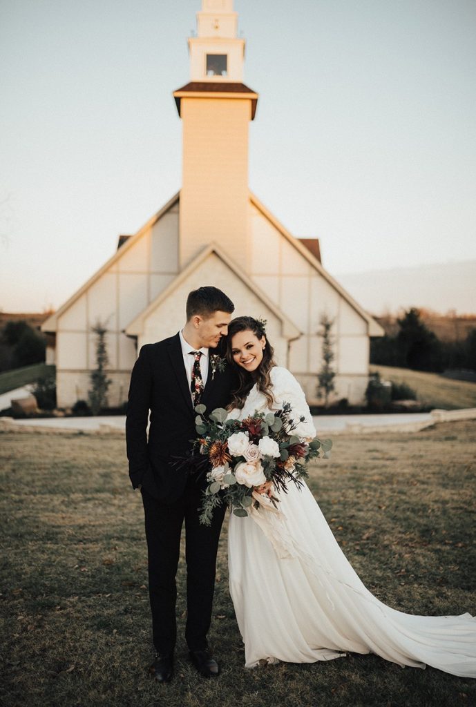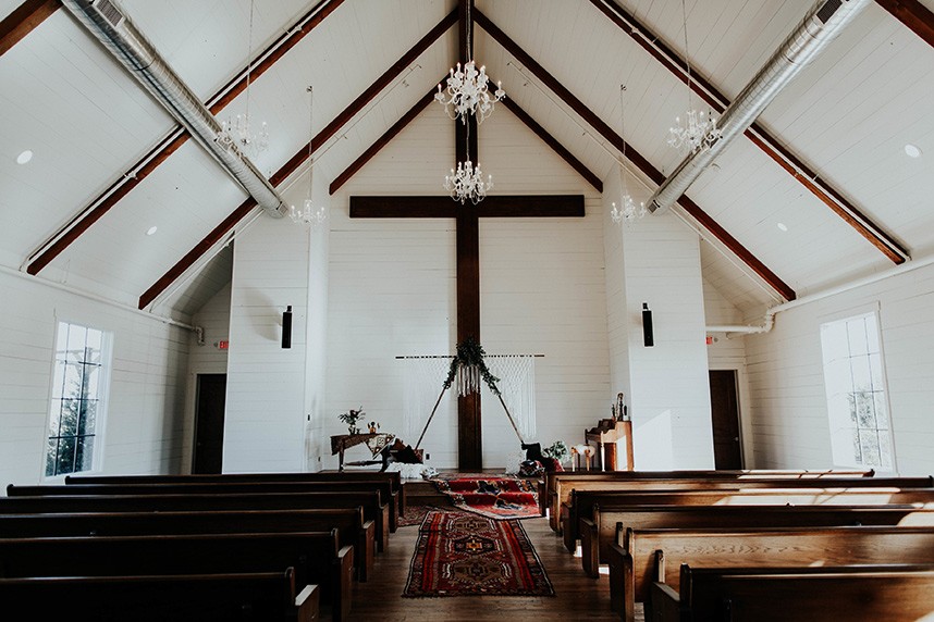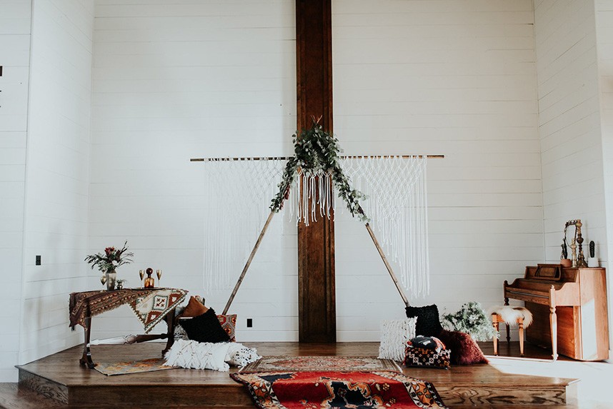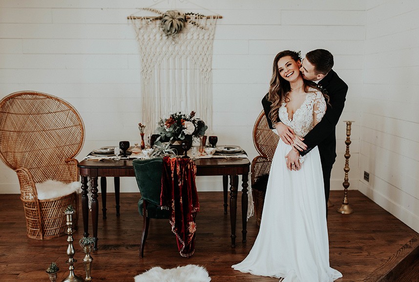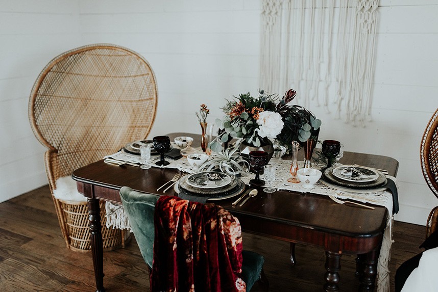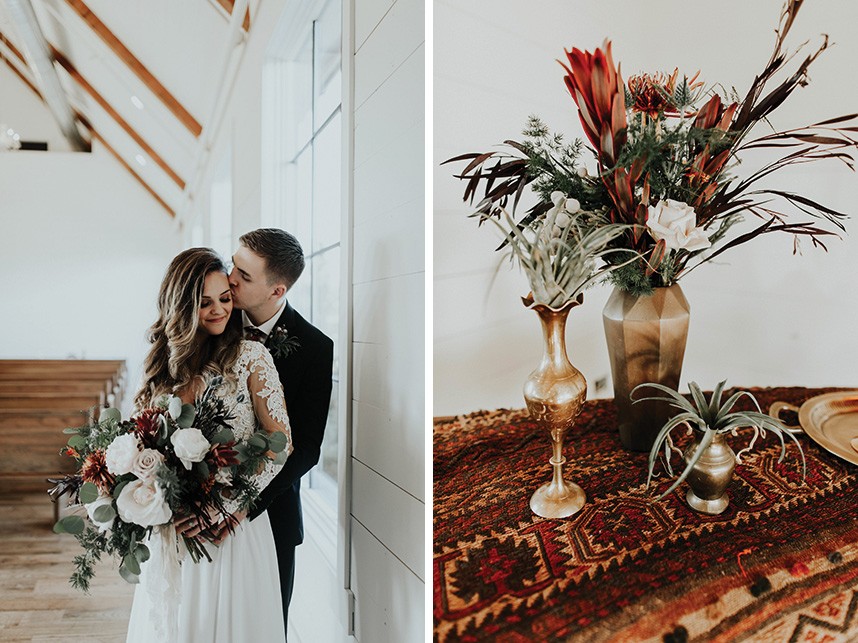 With the gorgeous Southwind Hills Chapel as the backdrop, this fantastic team created an intimately luxe styled shoot, bringing us endless amounts of bohemian wedding inspiration! Peyton Rainey and Chelsea Denise easily captured the free-spirit feel of the shoot both inside and out of the the chapel, from the greenery and macrame adorned alter to under the golden light of a perfect Oklahoma winter sunset. Forever Cole Events created the most extraordinary floral arrangements to fit each vignette of the shoot. The model bride stunned in an ethereal, lacy, long-sleeve gown from Prescott Bridal, with a golden, glowy makeup look created by Chelsey Ann Artistry. Shades of umber, rusty red, teal and forrest green were interwoven through the decor, providing a rich color palette in everything from the table setting to the unique and thematic tiered cake from Amy Cakes. We can’t get enough of this stunning shoot!