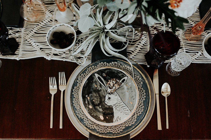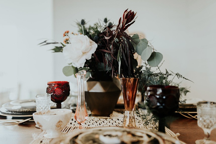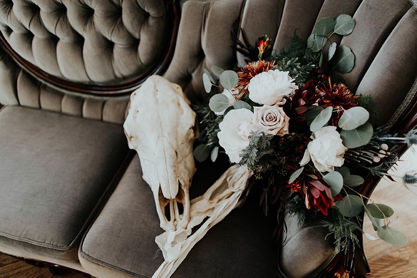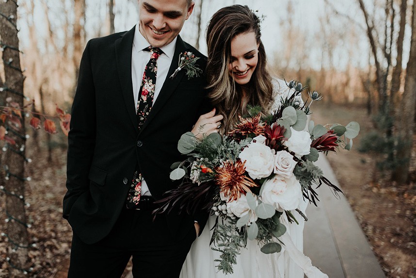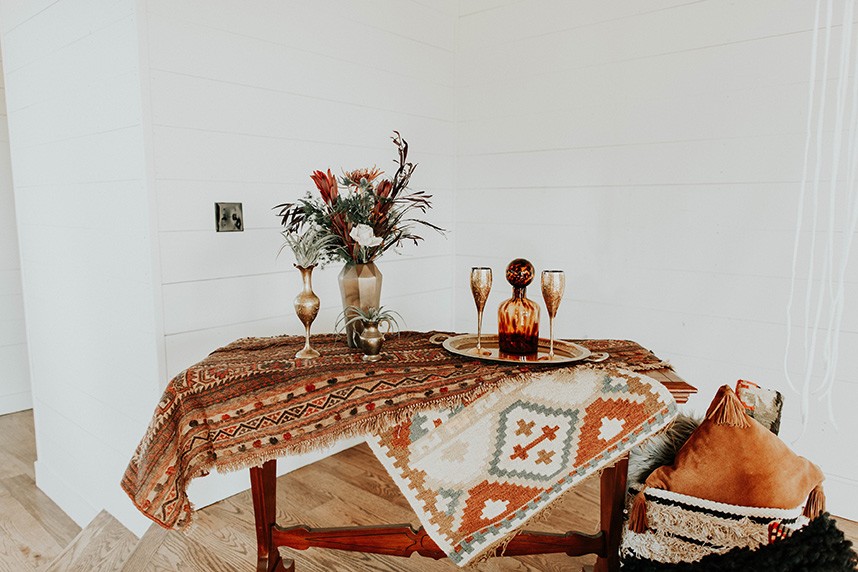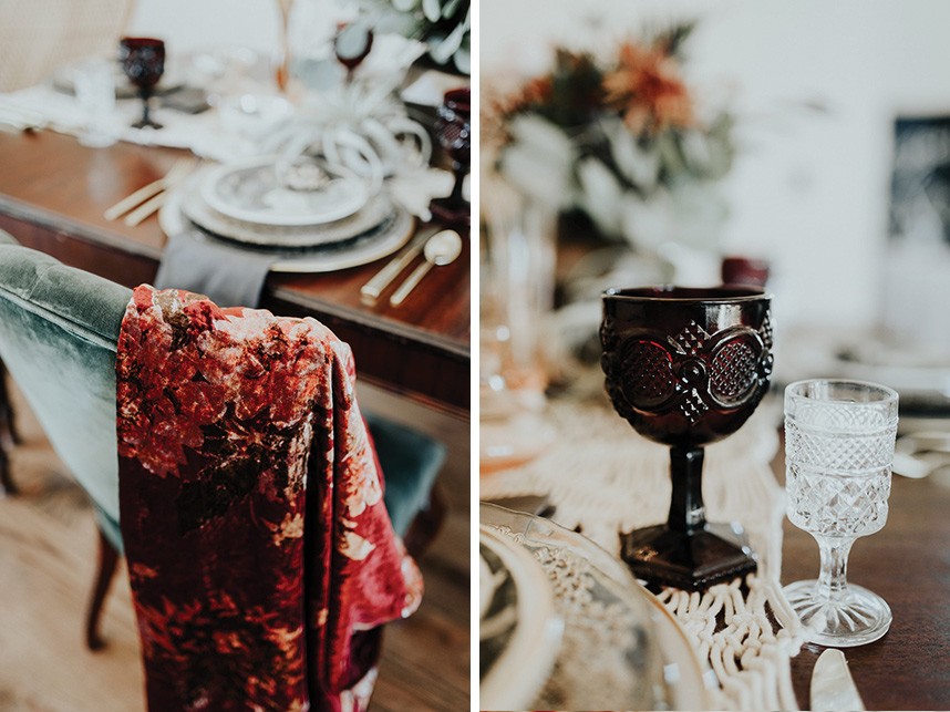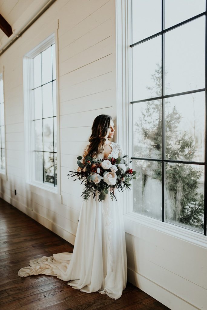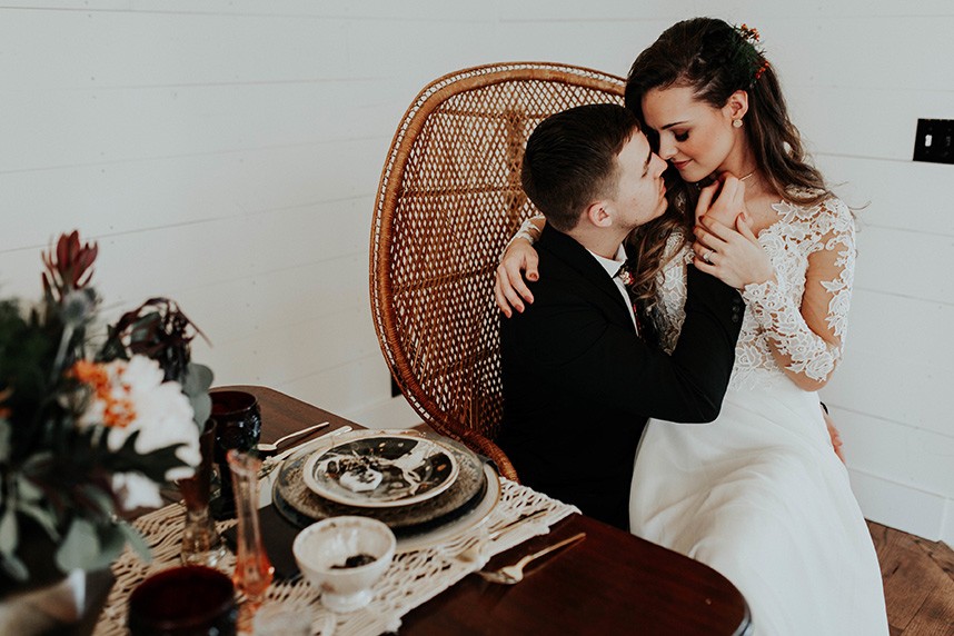 With the gorgeous Southwind Hills Chapel as the backdrop, this fantastic team created an intimately luxe styled shoot, bringing us endless amounts of bohemian wedding inspiration! Peyton Rainey and Chelsea Denise easily captured the free-spirit feel of the shoot both inside and out of the the chapel, from the greenery and macrame adorned alter to under the golden light of a perfect Oklahoma winter sunset. Forever Cole Events created the most extraordinary floral arrangements to fit each vignette of the shoot. The model bride stunned in an ethereal, lacy, long-sleeve gown from Prescott Bridal, with a golden, glowy makeup look created by Chelsey Ann Artistry. Shades of umber, rusty red, teal and forrest green were interwoven through the decor, providing a rich color palette in everything from the table setting to the unique and thematic tiered cake from Amy Cakes. We can’t get enough of this stunning shoot!