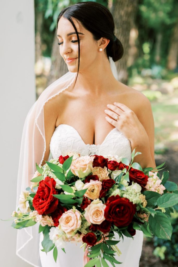 The soft hues of cherry red in Mackenzie and Lane’s wedding at Sweetbelle Farms are absolutely charming. Mackenzie said, “from start to finish, our wedding day was perfect!” The day began with Mackenzie and her bridesmaids getting ready and spending quality time before the festivities. After spending the entire day apart, Mackenzie and Lane finally reunited at the altar. Mackenzie said she won’t ever forget the look on Lane’s face and the tears in his eyes when he finally saw his beautiful bride. How sweet! After sealing their love with a kiss, it was time to celebrate! The reception space contained subtle pops of cherry red florals by Allyson Whitney Designs. Not only did she create the most beautiful floral arrangements, but she also helped the couple plan and execute their fairytale wedding! The classic southern charm setting that Sweetbelle Farms provides combined with the classic cherry red florals made for the dreamiest wedding. Keep scrolling to see more!