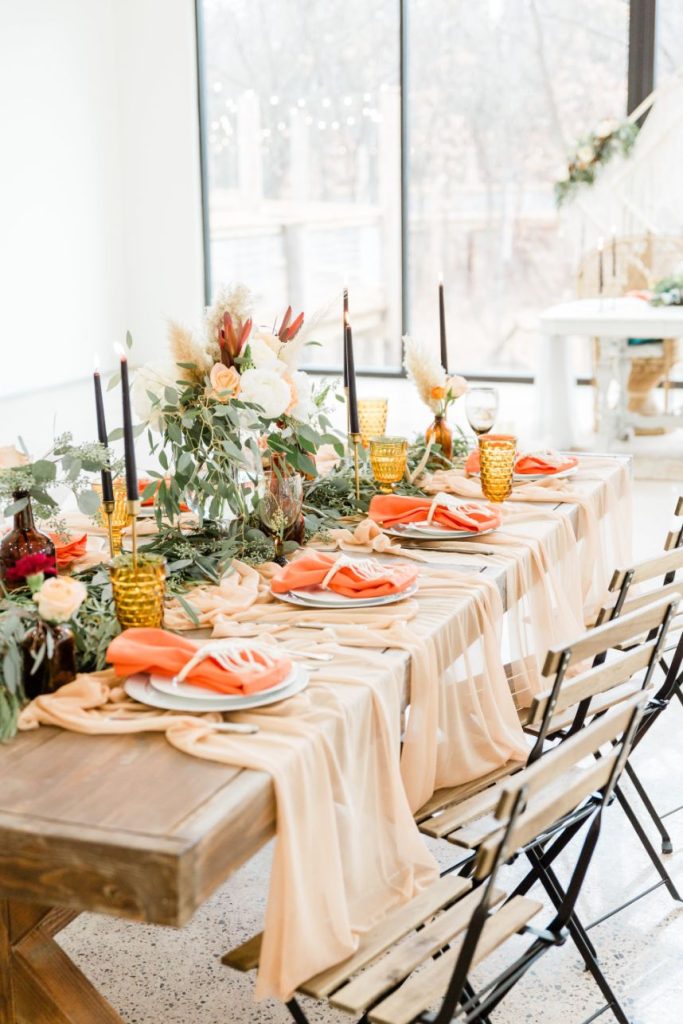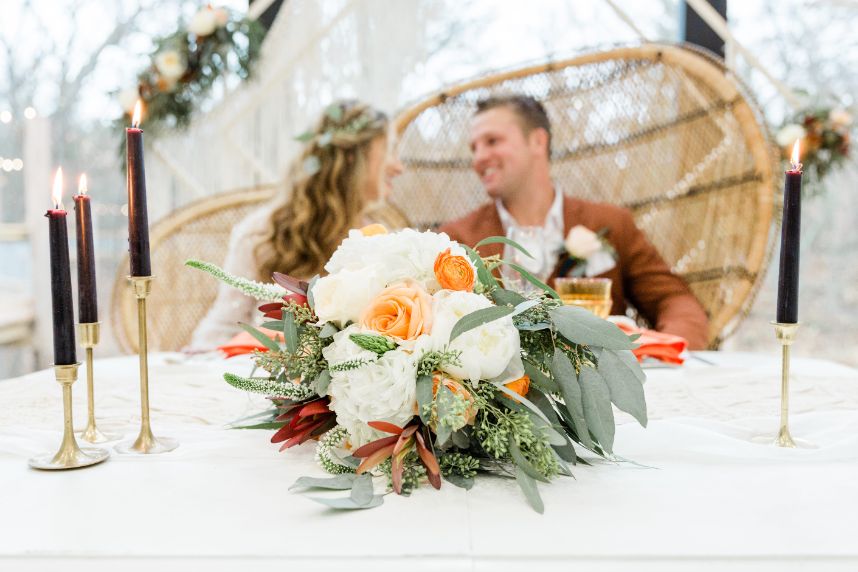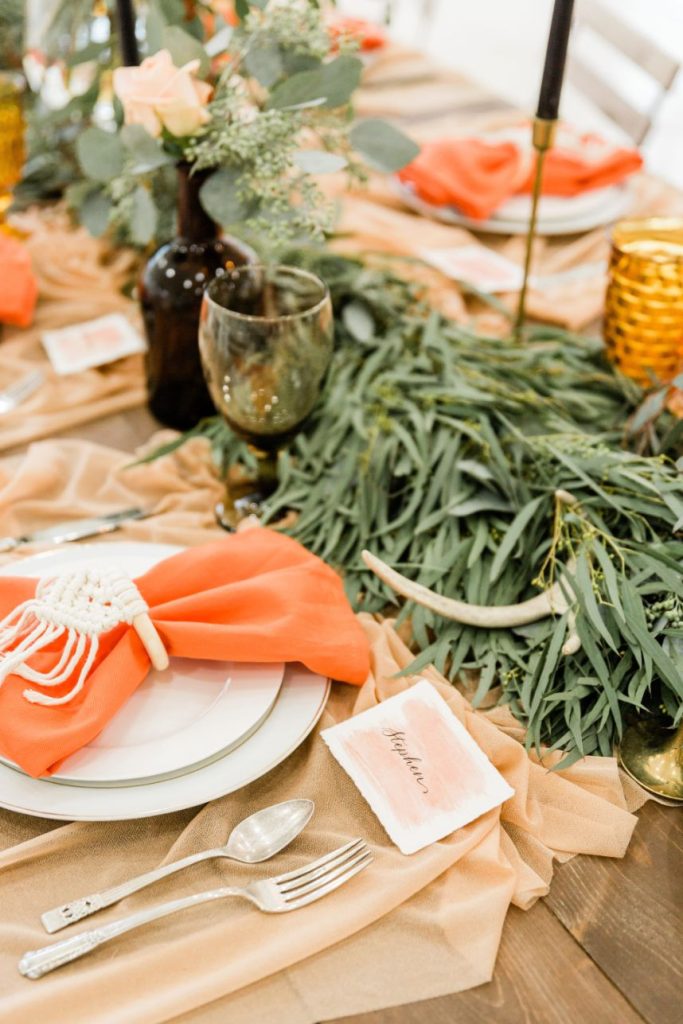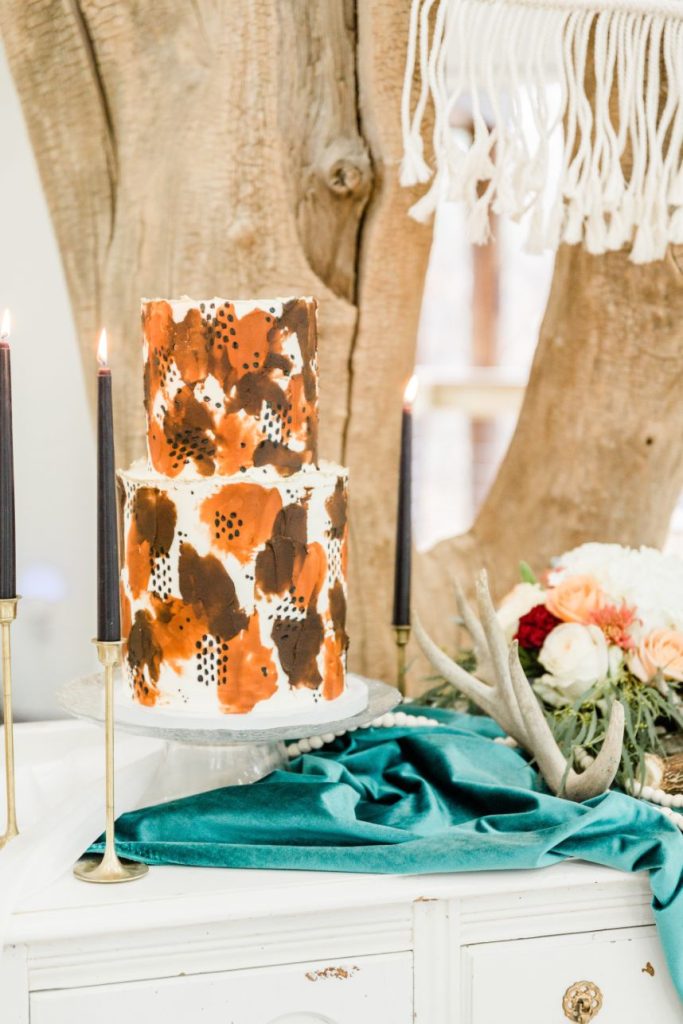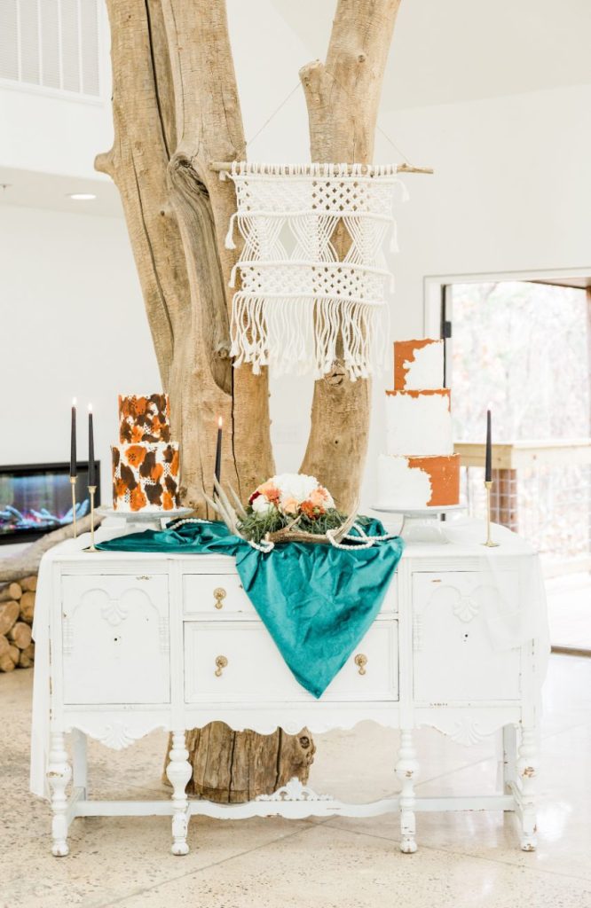 Boho wedding inspiration has yet to be done quite like this and macrame details combined with the magical woodland vibes in this styled shoot absolutely set it apart from the rest. Décor like antique brass and amber glass add rich character to a wedding scene all tied together with macrame details from Boho by Jenn adding a handmade, down-to-earth vibe at the altar and continued throughout, around napkins and near these creative cakes utilizing the same tasteful terracotta tones. A tablescape surrounded with wicker peacock chairs and wooden rentals from Borrowed & Bleu Co. set the trendy boho tone in photos along with a vintage velvet lounge setup that sparks warm and cozy feelings your guests will adore. Our model stuns in a long-sleeve gown from Avari Bridal featuring an illusion neckline as well as a spray of shimmering beaded details practically calling out for the celestial bride. She looks simply radiant with glittering makeup and hair in a braided down style, accented by her groom clad in cognac brown for a more nontraditional wedding tux from The Wardrobe Modern Menswear. There are almost too many parts we could obsess over so scroll on to find your own favorite part in the boho wedding inspiration gallery just down below. Cheers!