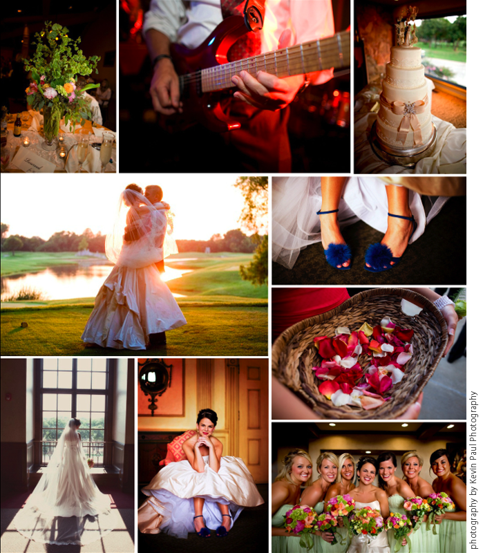 The colorful bouquets of peonies, mums, ranunculus and hydrangeas from The French Tulip held up against the bridesmaids’ floor-length, apple green, Vera Wang gowns with sweetheart neckline from J.J. Kelly Bridal in Oklahoma City, truly making this summer garden wedding pop. The amazing cake accented with a vintage broach was designed by Oklahoma cake artist, Amy Cullifer, with Amy Cakes.