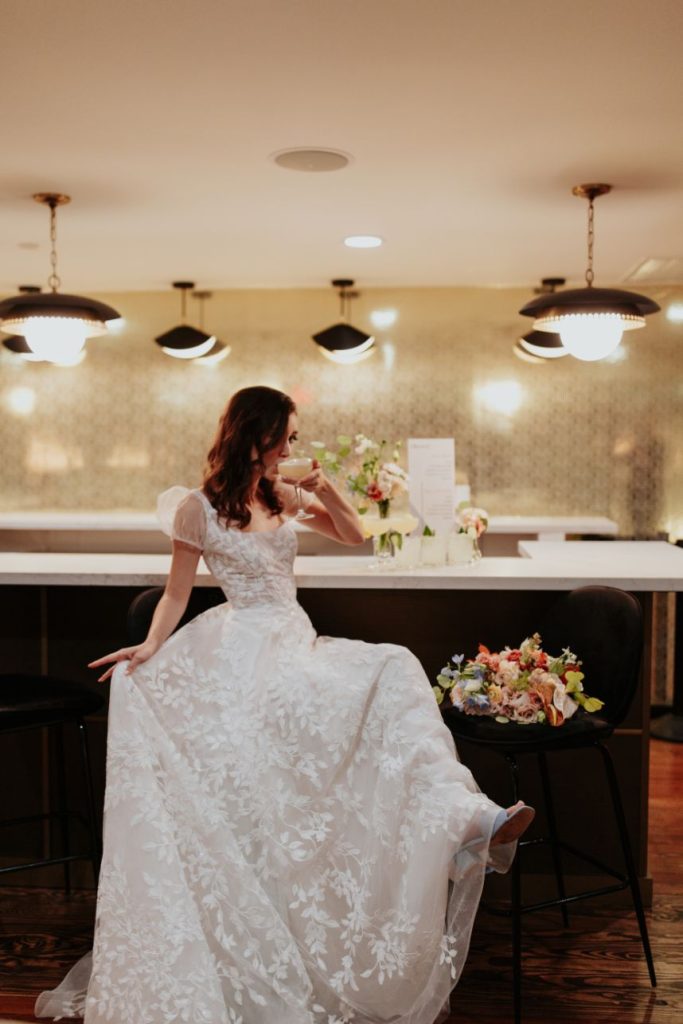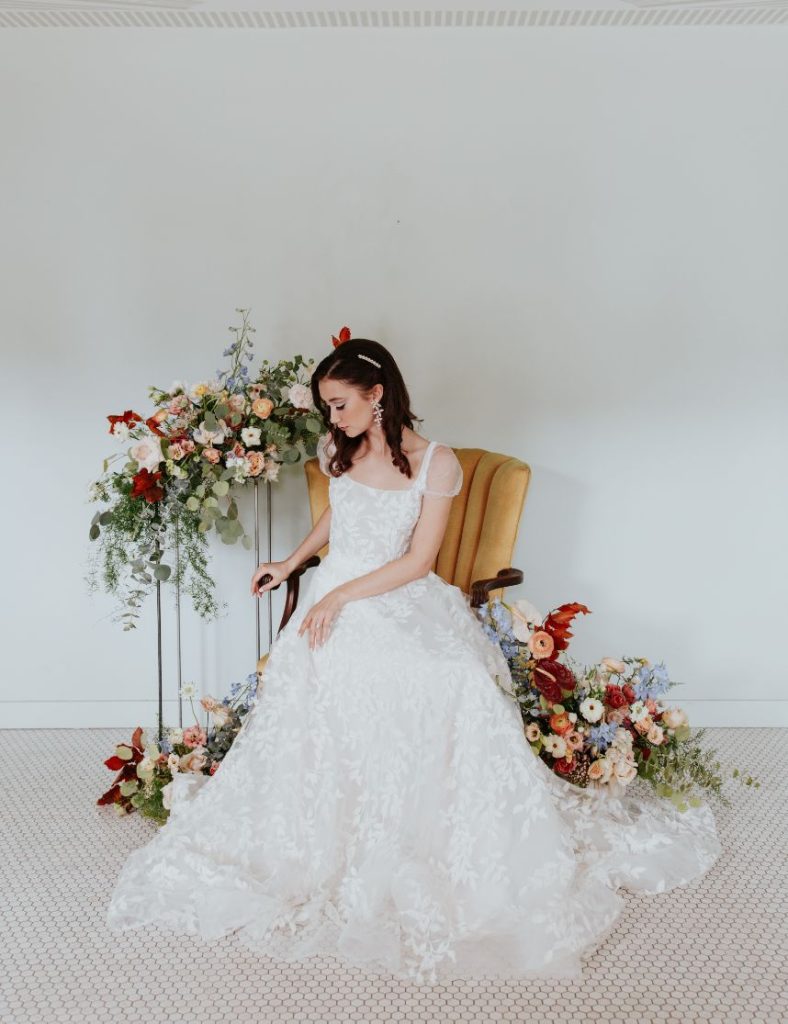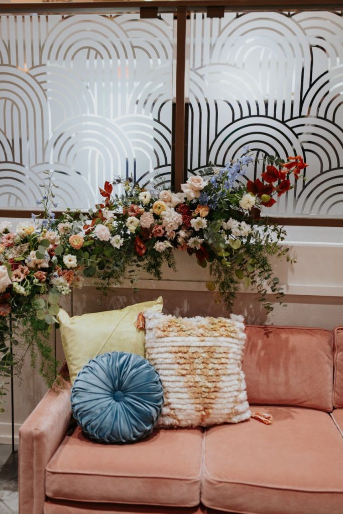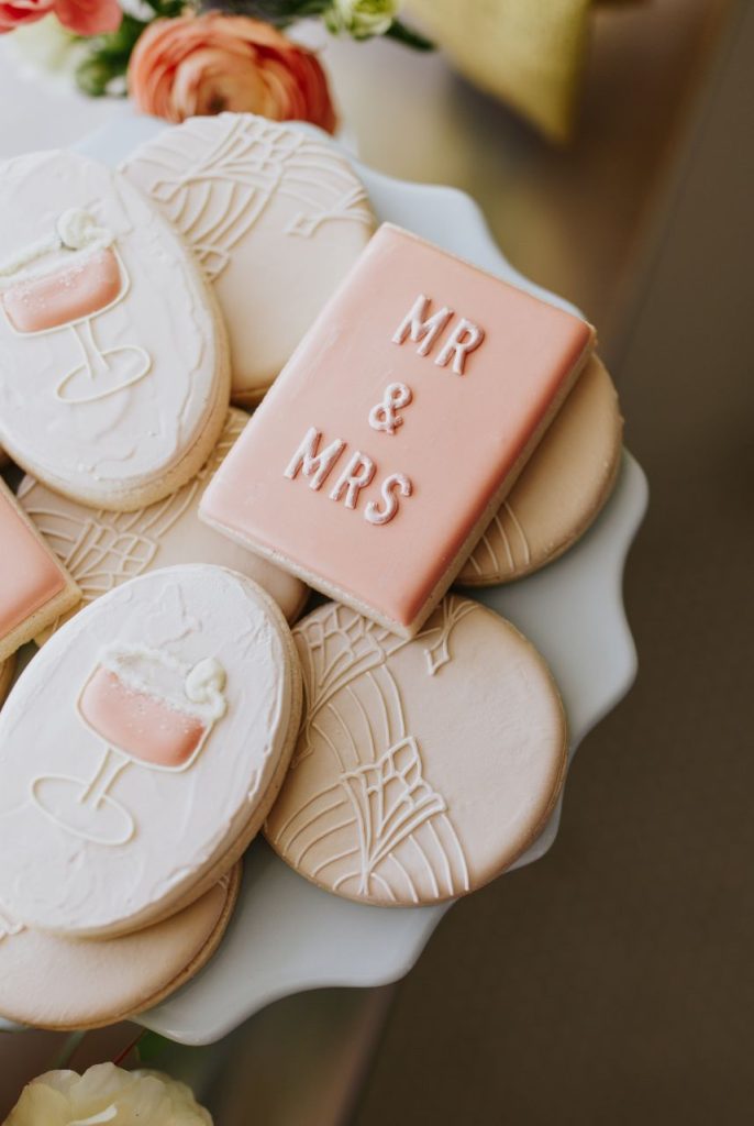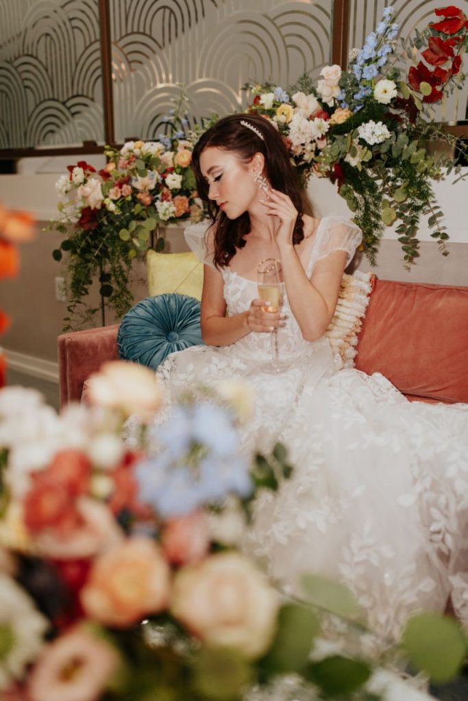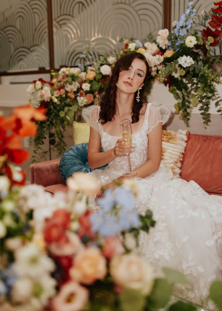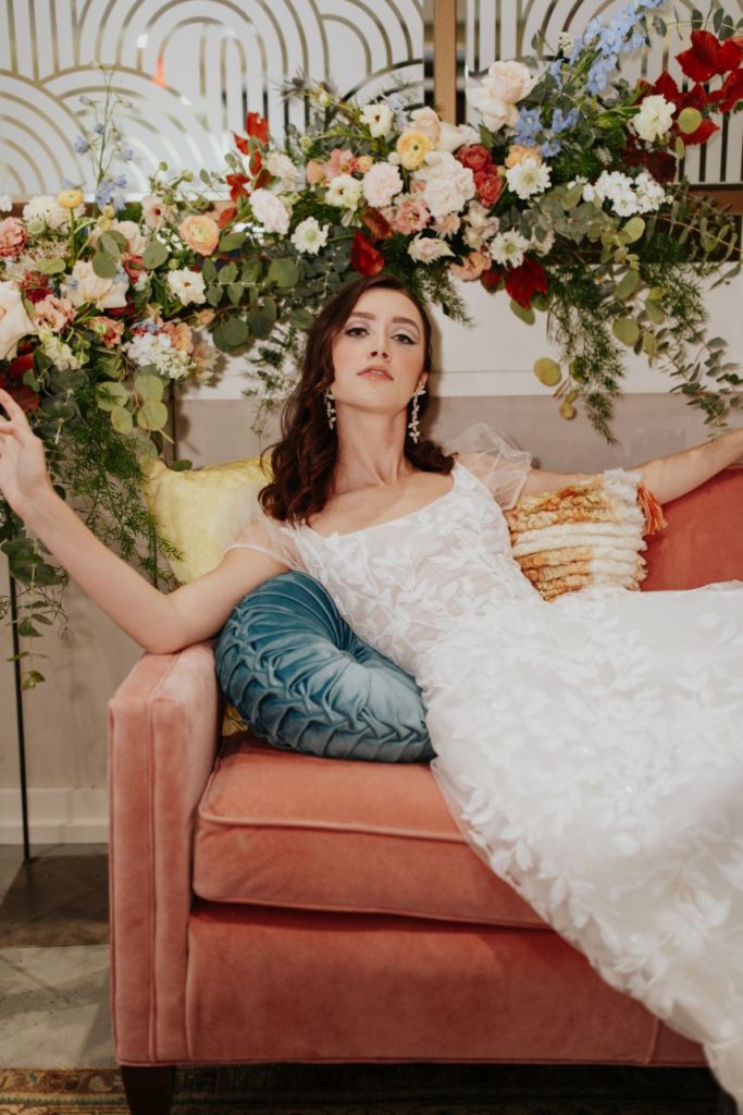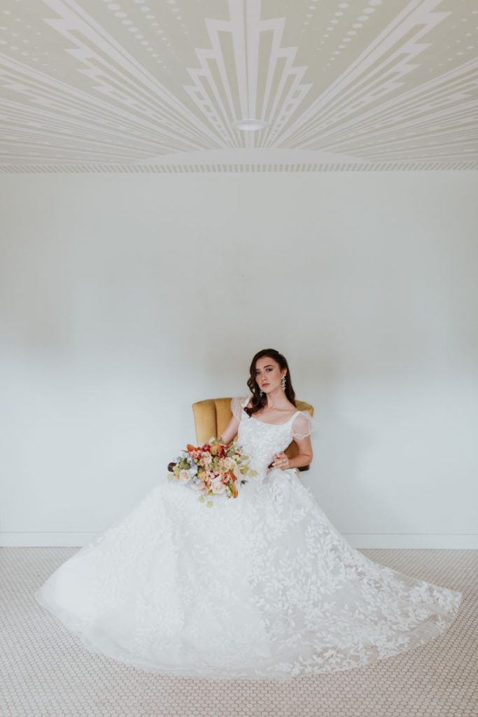 Featuring a primary palette in muted tones, this mod deco style wedding inspiration takes place at the perfect setting – The Yale Theater. This venue makes for the best backdrop for this styled shoot since all of its art deco glory has been recently renovated and reopened, with all of the state-of-the-art conveniences a modern bride expects designed with 1920s speakeasy-style charm that’s sure to surprise and delight. Invite guests in style with a modern geometric suite design in dusty hues of sage, rose and sky designed by Chirps & Cheers. Opt for escort cards and a custom bar menu to match! This meet-cute inspiration is infused with abundant florals in elevated minimalist metal installations from Malyn Made, filled with garden roses, burgundy anthurium, sky blue delphiniums and so much eucalyptus. Nothing says wedding charm quite like custom cookies and these gorgeous ones from Mixed Sugar send the perfect wedding day message in flawless royal icing. Our model steals the show in a gown from Chantilly Couture featuring a flattering ivy-covered bodice and ball gown skirt, as well as a bridal makeup look created by Brushed Salon and Makeup Studio that screams 60’s mod Twiggy meets Gatsby’s Daisy with striking eye makeup and glowy pink cheeks. In melodramatic retro scenes, she poses among some of the most luxe pieces from Scavenged Vintage Rentals – velvet is the keyword here, and it adds a vibe of nostalgia and rich luxury all at once in lounge furniture, pillows and rugs alike! Top the whole soiree off with a quick bar stop and a culinary-grade craft cocktail or a flute of champagne from Blue Label Bartending and you will be ready to plan the meet cute of your dreams or just obsess with us over the darling details of this mod deco style, all captured in beautiful technicolor scenes by KGC Photography. Cheers!