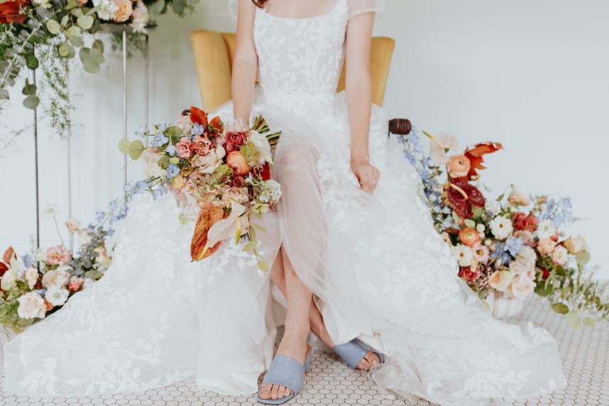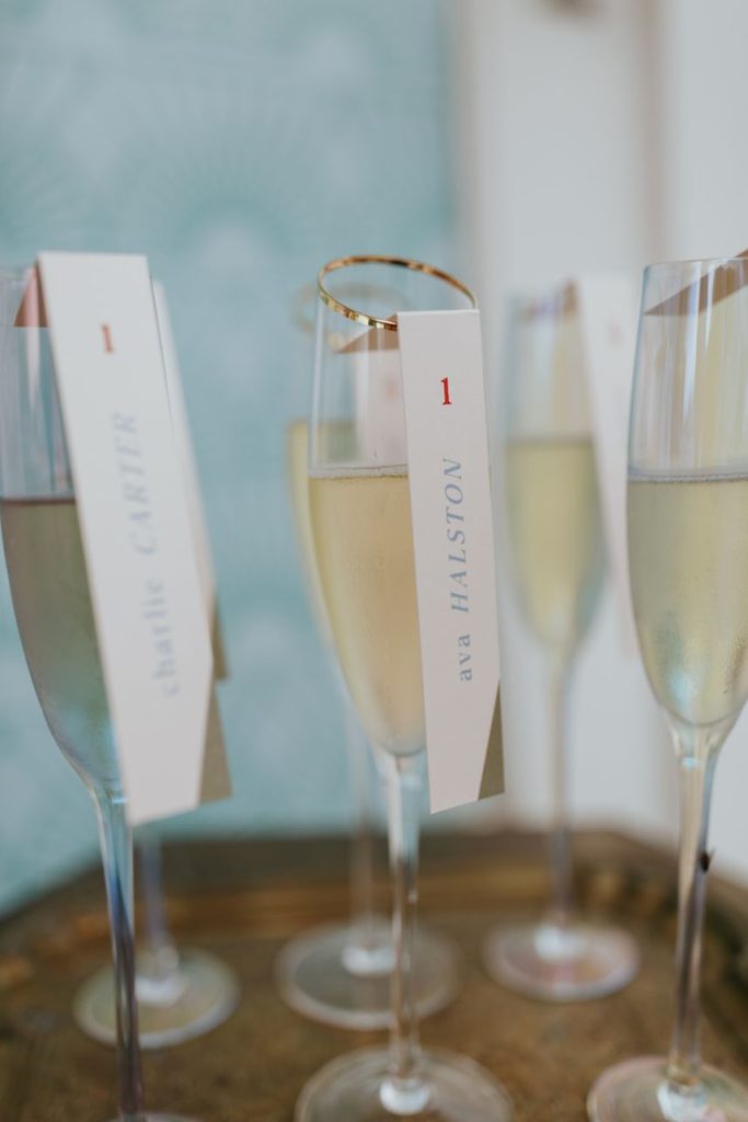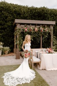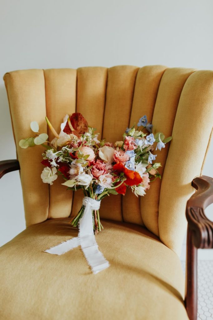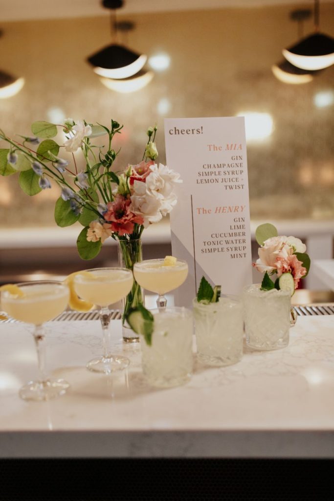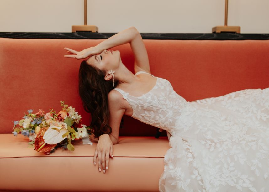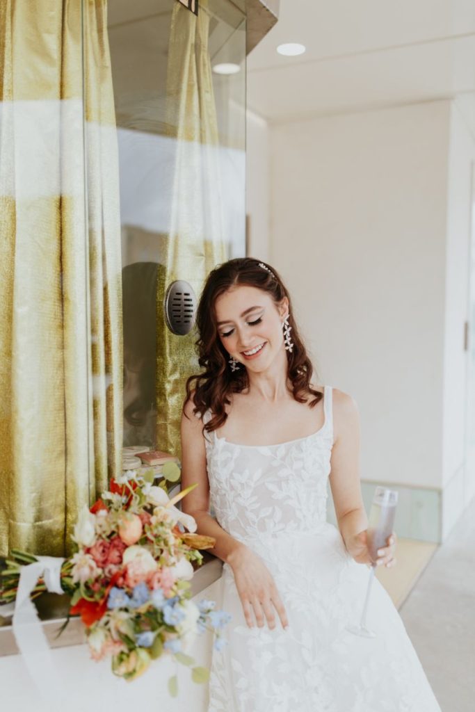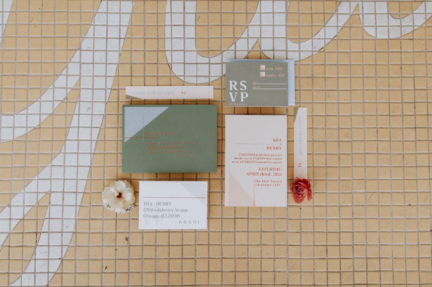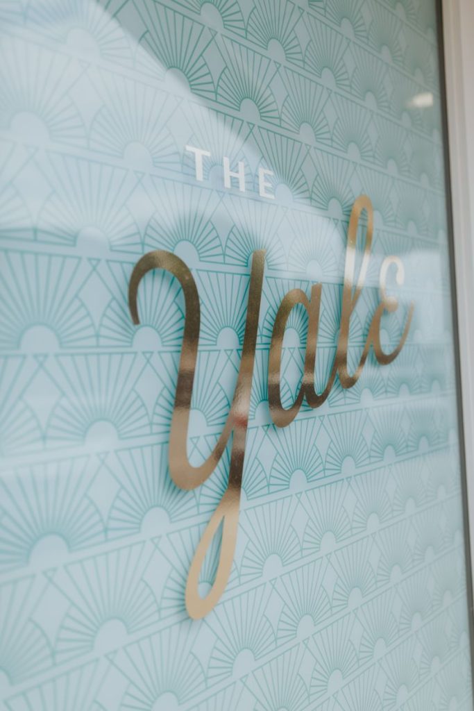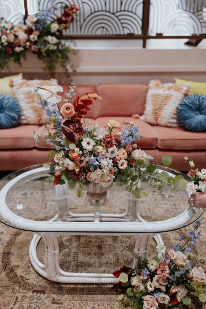 Featuring a primary palette in muted tones, this mod deco style wedding inspiration takes place at the perfect setting – The Yale Theater. This venue makes for the best backdrop for this styled shoot since all of its art deco glory has been recently renovated and reopened, with all of the state-of-the-art conveniences a modern bride expects designed with 1920s speakeasy-style charm that’s sure to surprise and delight. Invite guests in style with a modern geometric suite design in dusty hues of sage, rose and sky designed by Chirps & Cheers. Opt for escort cards and a custom bar menu to match! This meet-cute inspiration is infused with abundant florals in elevated minimalist metal installations from Malyn Made, filled with garden roses, burgundy anthurium, sky blue delphiniums and so much eucalyptus. Nothing says wedding charm quite like custom cookies and these gorgeous ones from Mixed Sugar send the perfect wedding day message in flawless royal icing. Our model steals the show in a gown from Chantilly Couture featuring a flattering ivy-covered bodice and ball gown skirt, as well as a bridal makeup look created by Brushed Salon and Makeup Studio that screams 60’s mod Twiggy meets Gatsby’s Daisy with striking eye makeup and glowy pink cheeks. In melodramatic retro scenes, she poses among some of the most luxe pieces from Scavenged Vintage Rentals – velvet is the keyword here, and it adds a vibe of nostalgia and rich luxury all at once in lounge furniture, pillows and rugs alike! Top the whole soiree off with a quick bar stop and a culinary-grade craft cocktail or a flute of champagne from Blue Label Bartending and you will be ready to plan the meet cute of your dreams or just obsess with us over the darling details of this mod deco style, all captured in beautiful technicolor scenes by KGC Photography. Cheers!