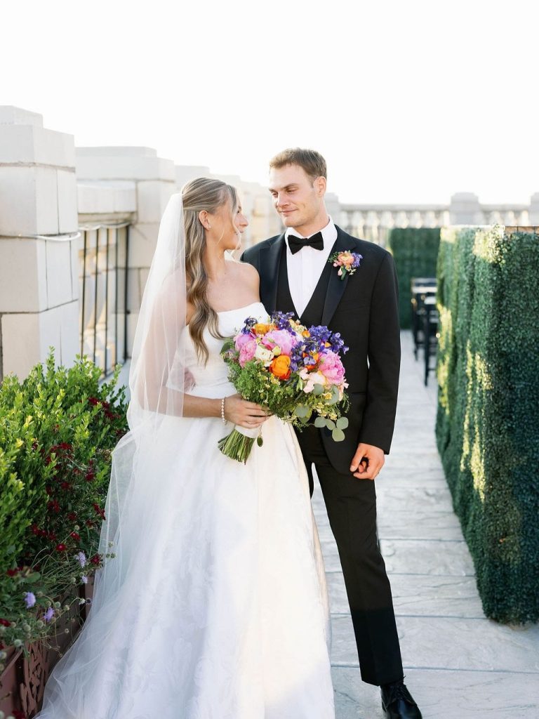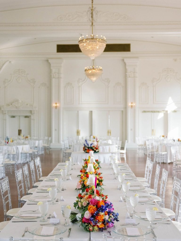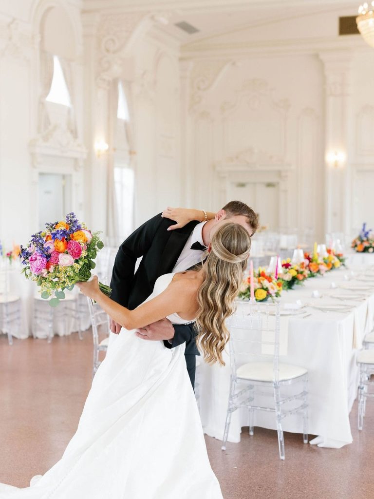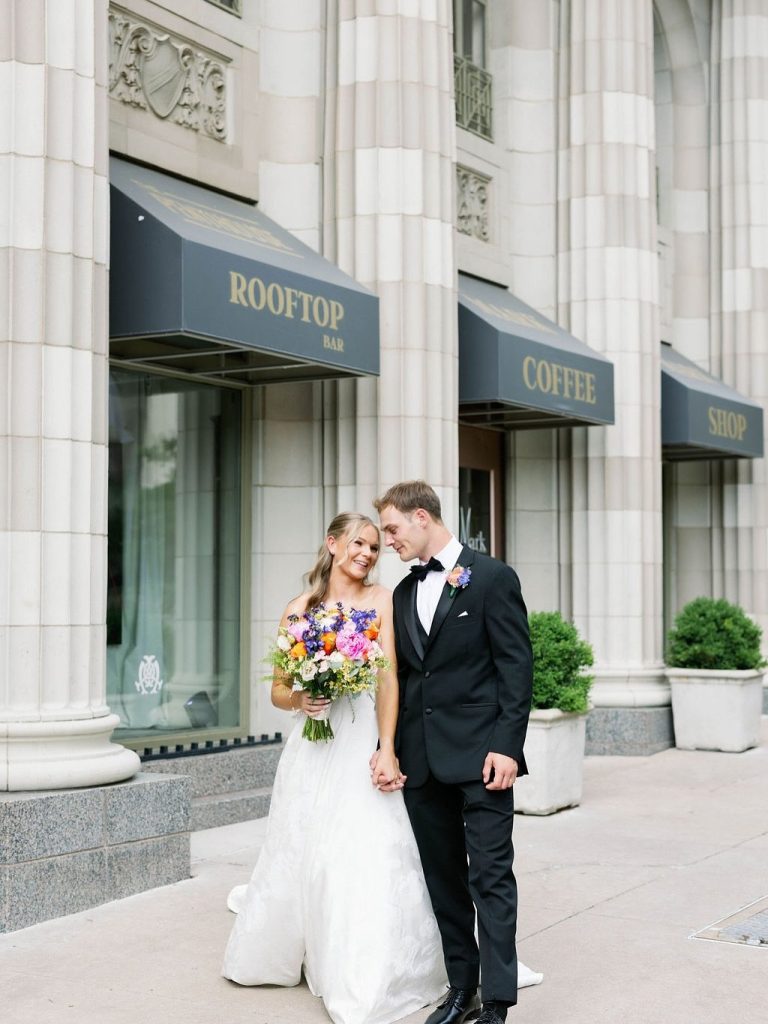 Megan & Jarod’s Tulsa wedding took place at the iconic The Mayo Hotel! Megan adored the elegant white backdrop of the Mayo Ballroom, which was the perfect canvas for their vibrant color palette to pop.