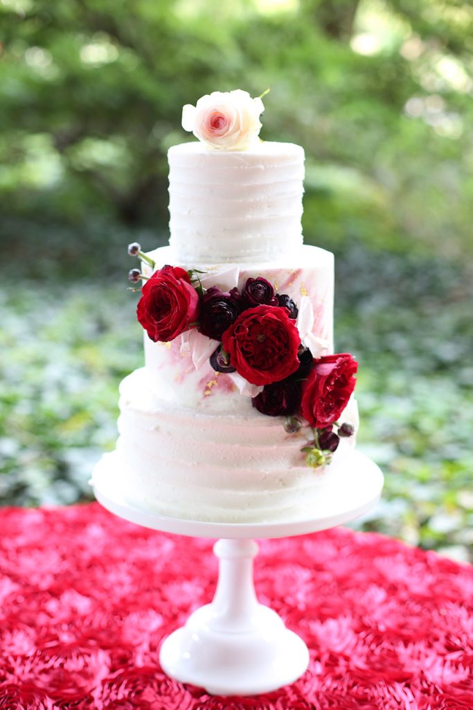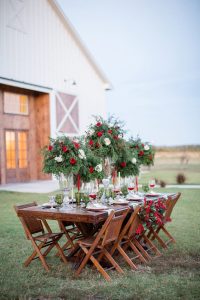The reception was just as beautiful and personal as the ceremony. C2 Catering served some of the couple’s favorite foods, including fresh fruit, a taco bar, pulled pork and burger sliders, and green chile mac and cheese. The four-tier cake by Andrea Howard Cakes was coated with white buttercream, edible gold sequins and lush florals. To keep the event fun, Melia and Jeff incorporated games into their reception for both the kids and adults. M&M Productions also kept the energy in the room up. The newlyweds danced to “The Luckiest” by Ben Folds for their first dance.