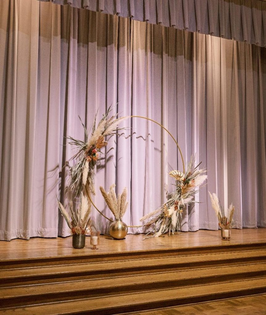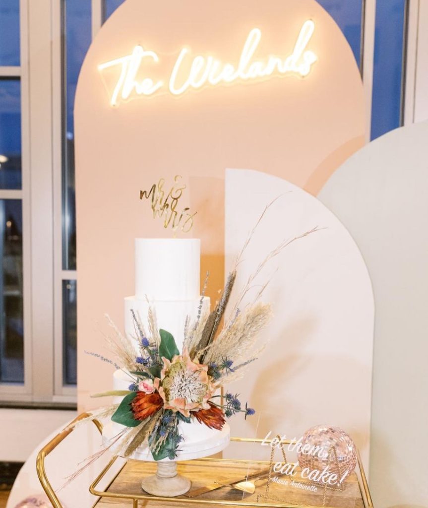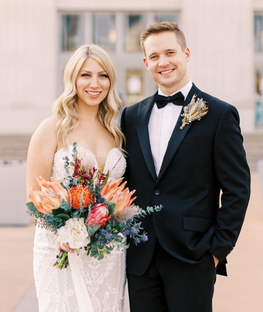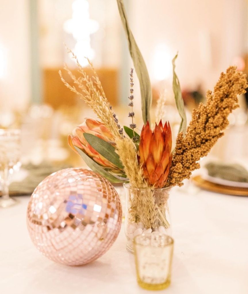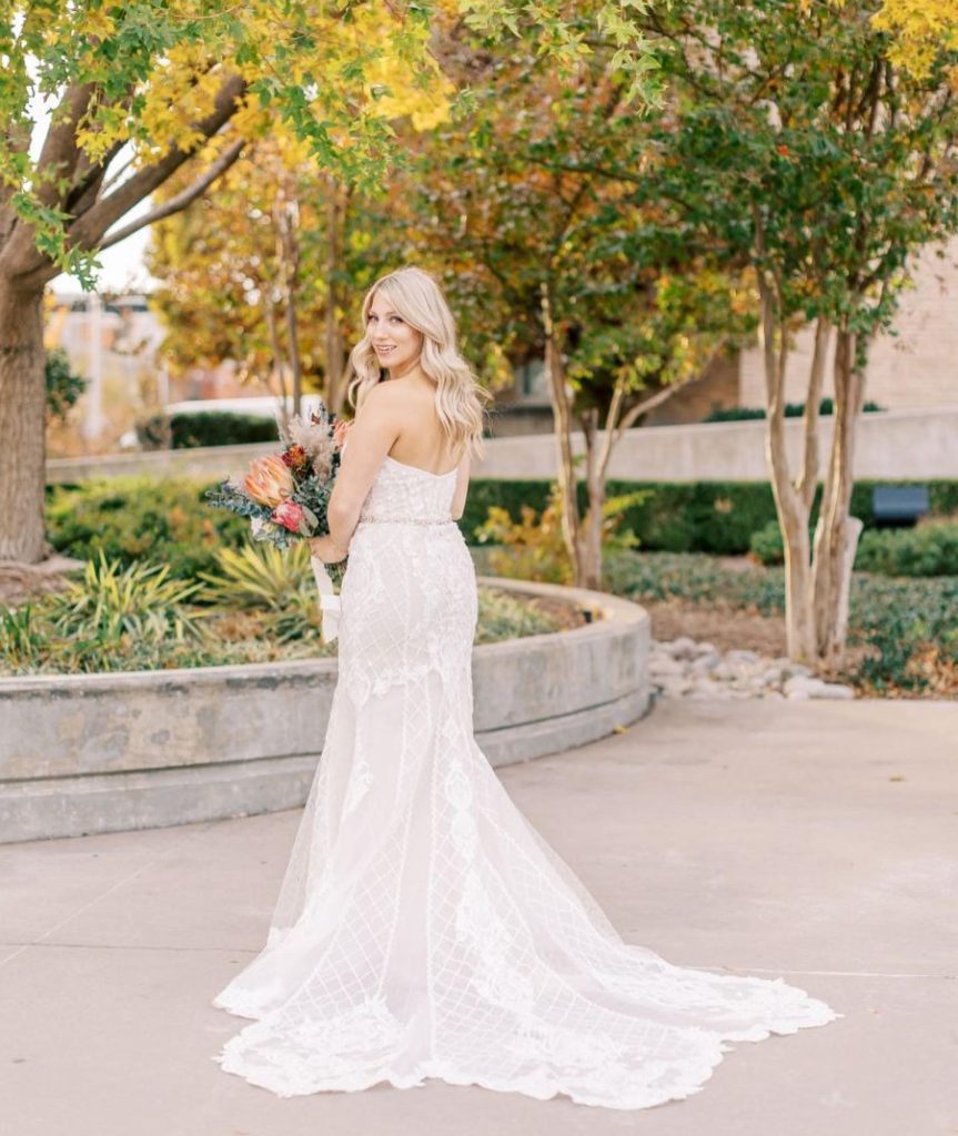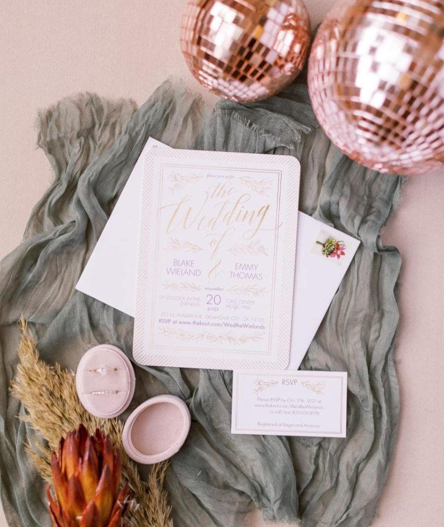 “One of my favorite things about our wedding was going out to a few farms of family friends in Hydro, Oklahoma, where Blake is from, and gathering dried crops, different grasses and florals to incorporate into our centerpieces, bouquets, arbor, floral arrangements and on our cake.” – Emmy + Blake
