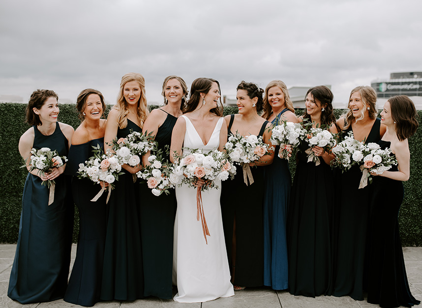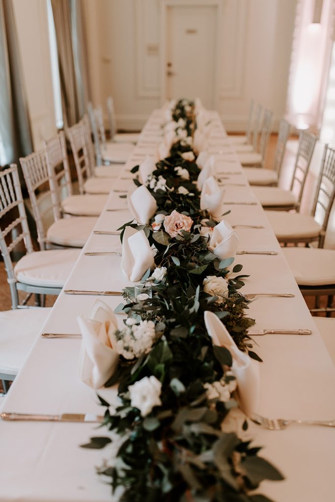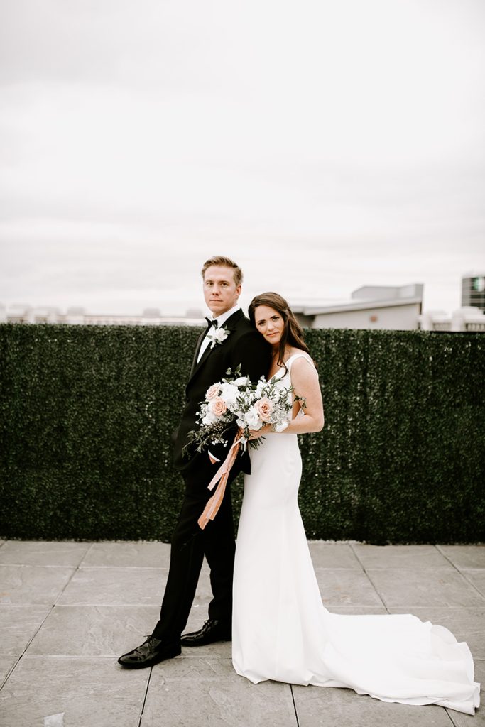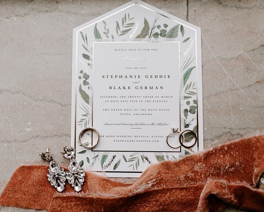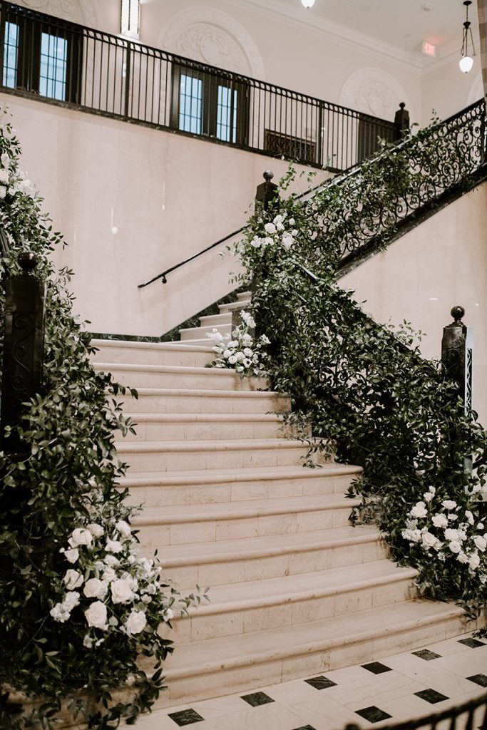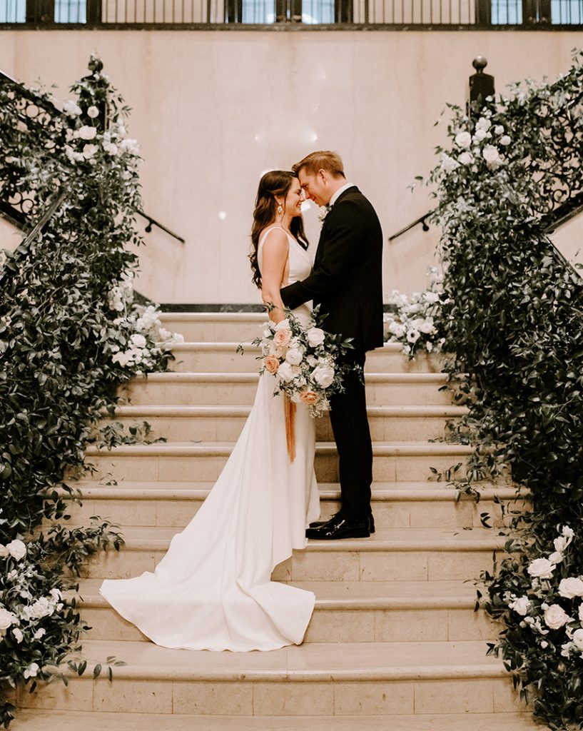 This modern ballroom wedding is full of all the elegance of a traditional wedding, but possesses just the right amount of edge to still feel contemporary. We’re totally swooning over Stephanie Geddie and Blake German’s big day and know you will be too after taking a peek at these stunning images from Katie Hadley Photography! The Mayo Hotel proved to be the perfect location for the couple’s entire wedding weekend – from the accommodations, to the bridesmaids’ luncheon, the venue and everything in between – and we couldn’t have picked a more dreamy spot ourselves. The greenery adorned staircase from Ever Something was a show stopper, along with the elegant blush and ivory bouquets for the ladies and the flawless reception centerpieces – we really can’t pick our favorite floral touch! This modern ballroom wedding has the perfect spin off of traditional, and it’s a must-see! Check out all the pretty details below.