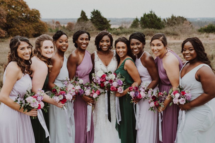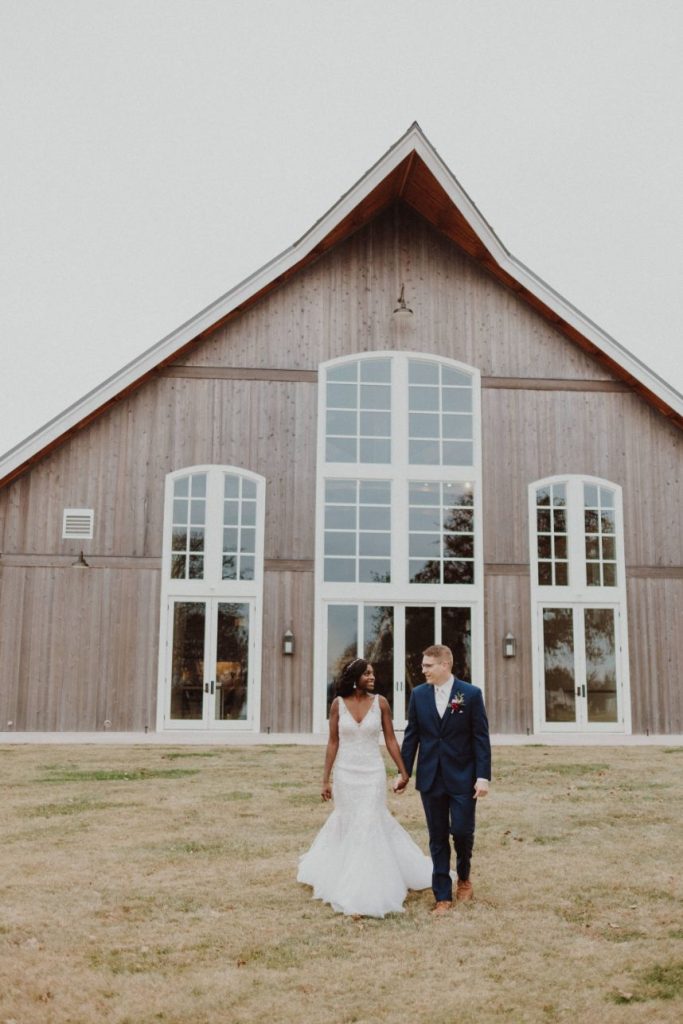 Soft lavender with emerald green was the perfect color palette for this modern farmhouse wedding! The gorgeous Sparrow Beginnings gave this celebration just the right amount of rustic flair to go with the overall “elegant barn” theme of this day. Their outdoor woods set the scene for stunning couple portraits, while their indoor space made for a bright, beautiful scene for their reception. Bold pink, soft lavender and white florals infused throughout were complemented by metallic gold accents in the decor from Party Pro Rents, making for simple yet gorgeous tablescapes that we can’t seem to get enough of. After this sweet celebration, the couple ended their night with a stay at the always-amazing 21c Museum Hotel. Scroll to see all the stunning lavender and emerald details of this oh-so sweet day! Cheers to Lombe and Mitch!