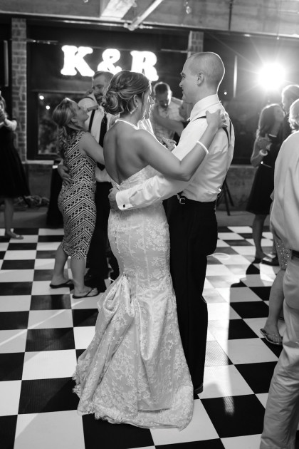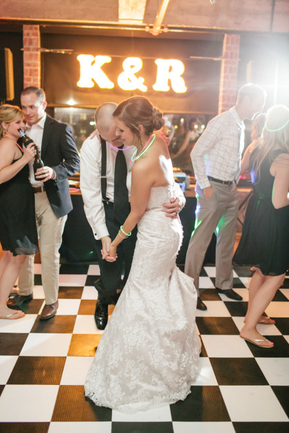 A few of Katie’s favorite décor details of the reception were the use of bistro lighting behind the cake table, lighted “K&R” marquee letters, and of course, the black and white checkered dance floor.