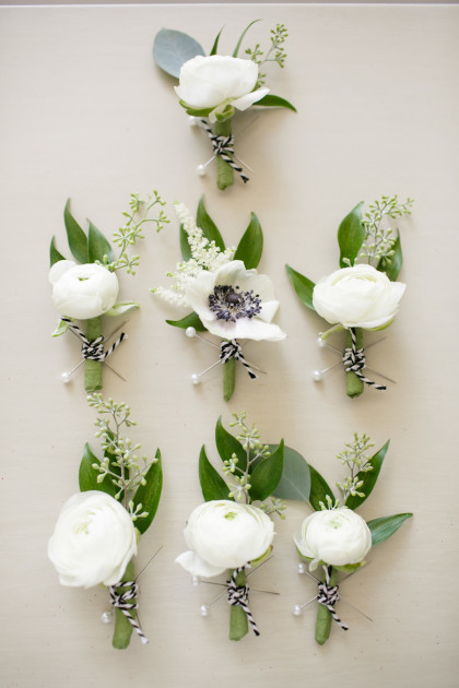 The ceremony was classically neutral with altar arrangements of white hydrangea, white snapdragon and greenery in gold metallic urns. The bride and bridesmaids’ bouquets included ivory garden roses, black and white anemones, white astilbe, seeded eucalyptus and Italian ruscus.