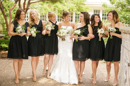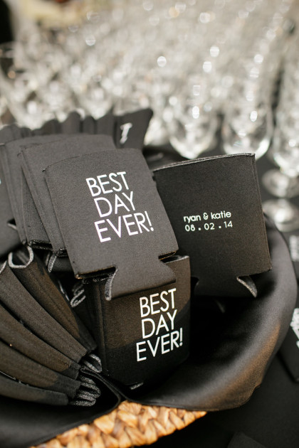 Katie’s gown was a champagne-colored strapless, satin gown with all-over ivory lace overlay and a beaded belt. Bridesmaids wore black chiffon dresses of all different styles. The groom and groomsmen wore classic black and white tuxedos with fun black and white striped socks they were all given as gifts.