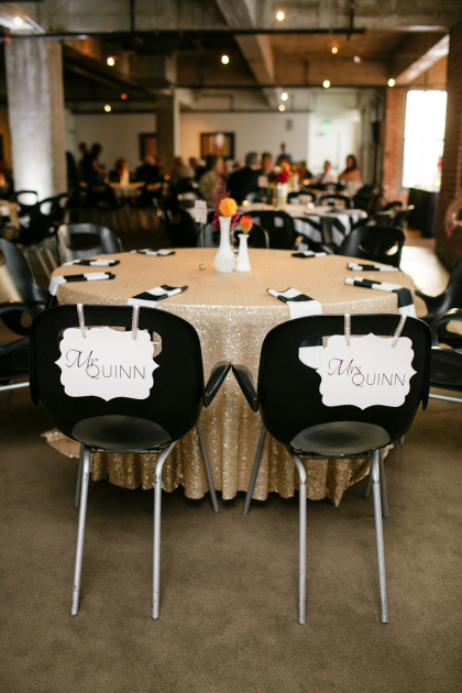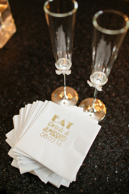 With a neutral ceremony, the Red PrimeSteak reception took the black and white theme up a notch with a mixture of modern black and white striped and champagne sequin linens along with pops of color in the flower centerpieces.