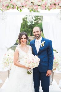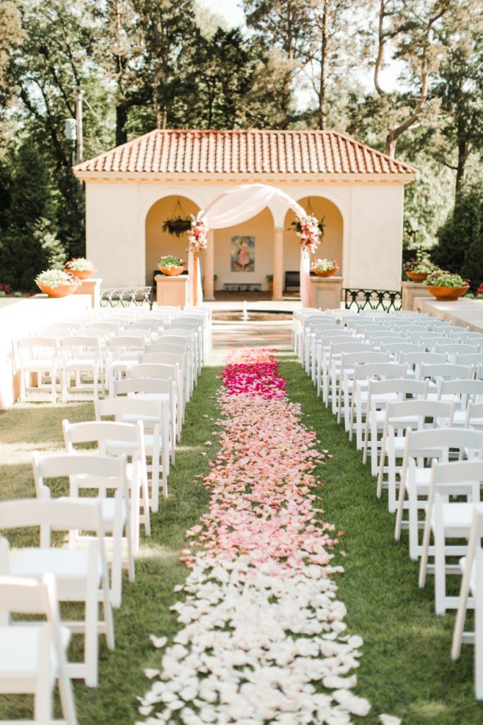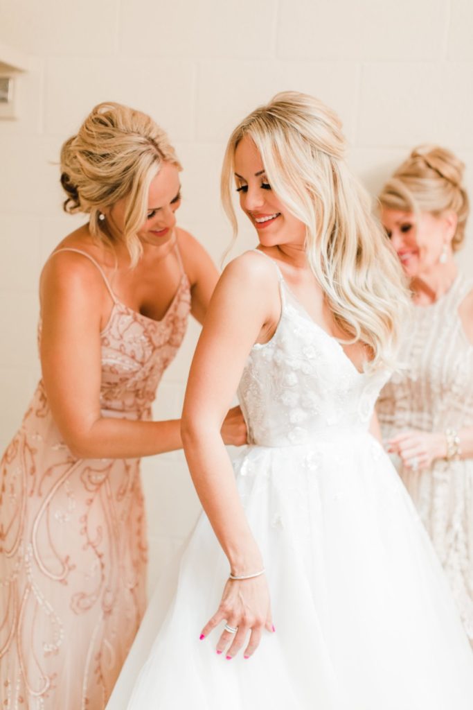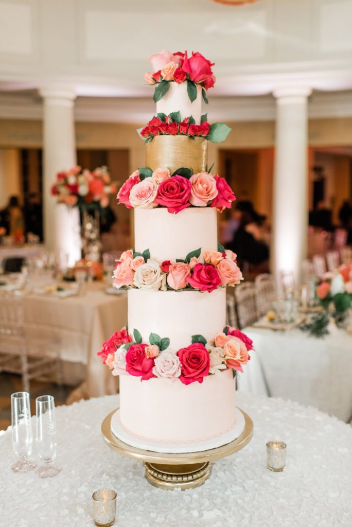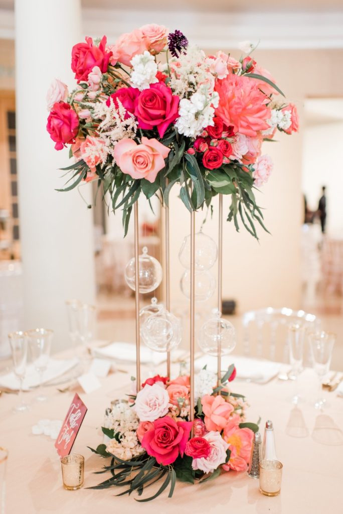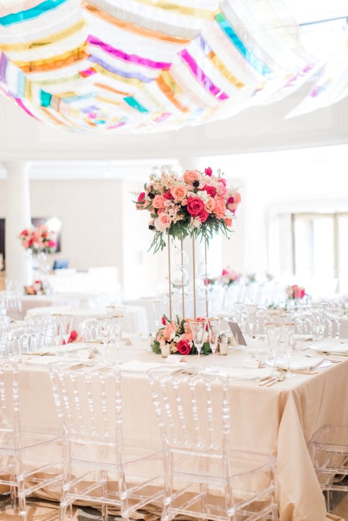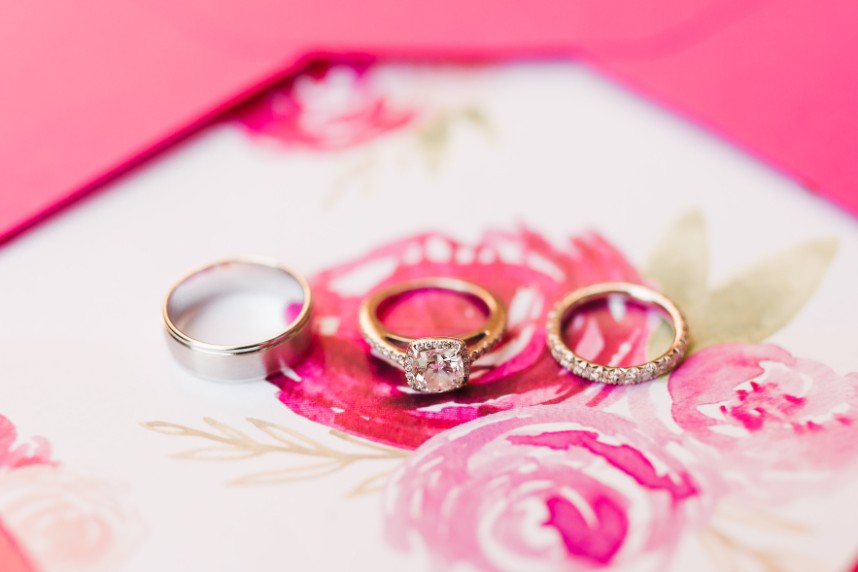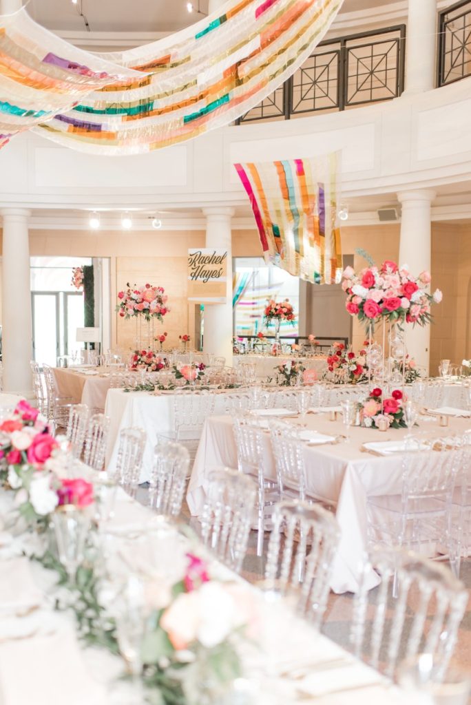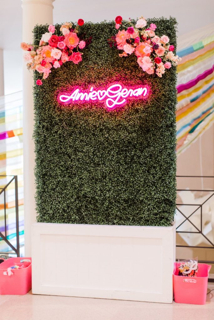 From the bride: “PINK, PINK, and PINK. I love pink and always have. Everything in the wedding had a shade of pink incorporated into it including the florals, wedding cake, linens, bridesmaids’ dresses, acrylic signs, neon sign for the photobooth, lighting, groomsmens’ socks and cocktail napkins.”