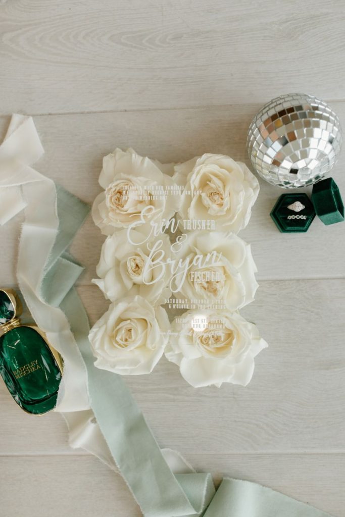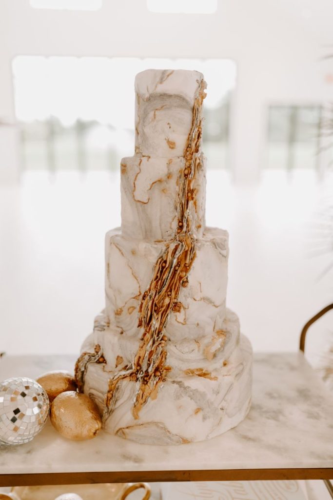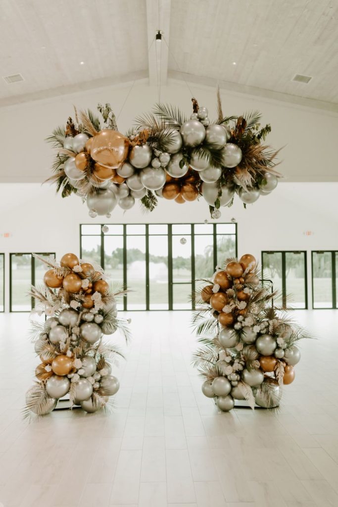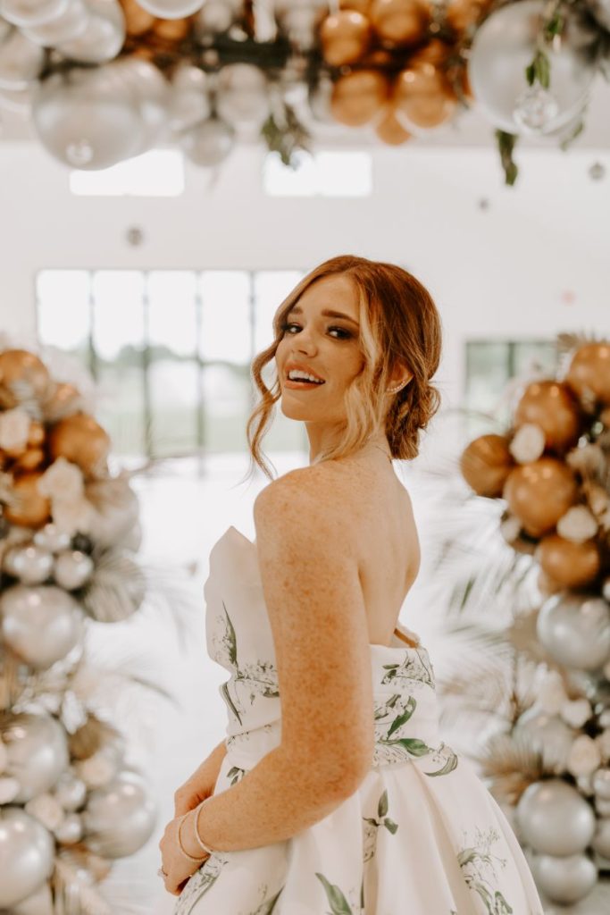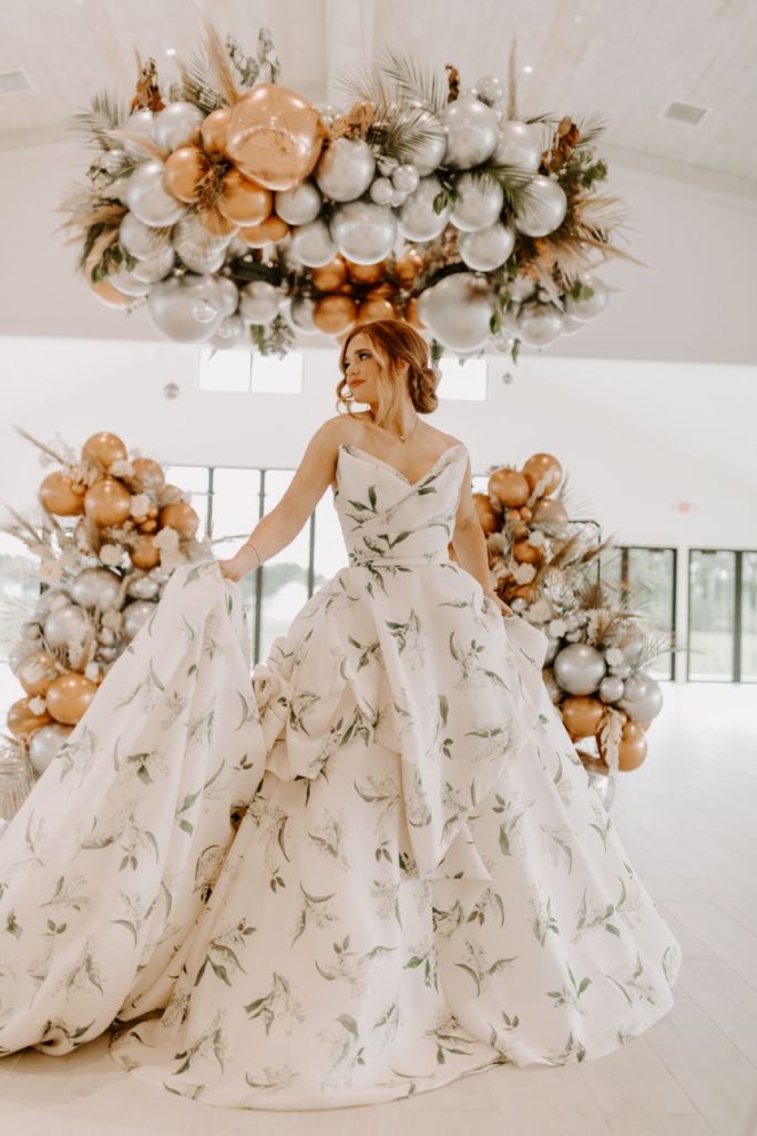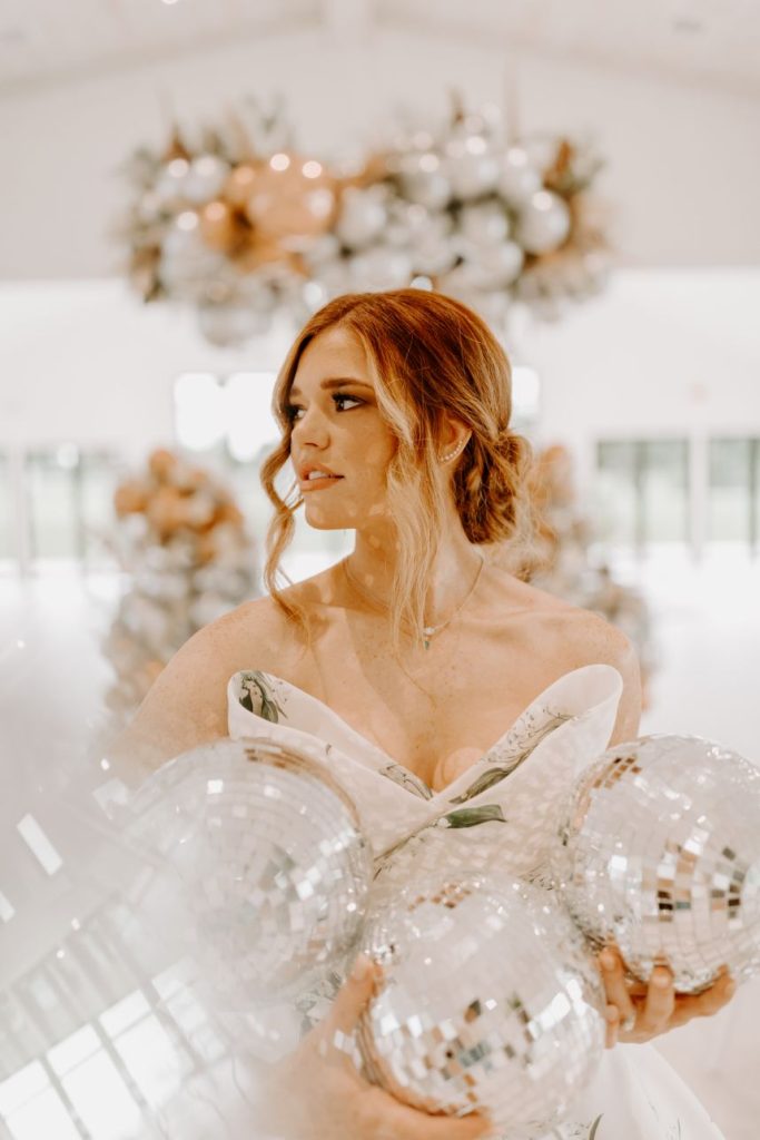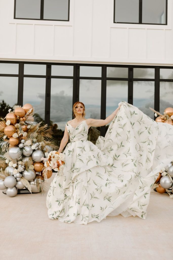 The planners at Forever Borrowed brought so much mod party style to this stately Ralph Lauren wedding inspiration captured by A.W. Photography Inc. in warm editorial scenes all around the iconic property at Aspen Ranch. Emerald accents and fall tones galore converge in the white-washed settings where decor and design truly took reign, complete with a few disco ball details sprinkled throughout. The grand Aspen Ranch chandelier was adorned with metallic balloons and tropical greenery alike by Wooden Hearts Boutique which set the tone for the creamy blooms and terracotta textures in a beautiful bridal bouquet created by Forever Borrowed. Our breathtaking brida modeled a look that brought all the elegance with a nontraditional floral-covered “Sweetness” Monique Lhuillier bridal gown from J.J. Kelly Bridal Salon that was simply to die for, plus gorgeous bling from Jay’s Jewelry and an opulent emerald band to match. Pictures and posing around the spacious venue property show off just how much you can do with bridal or wedding portraits with so many picturesque backdrops! A five-tiered marble wedding cake design by Sweet Devotion Cakery was a total showstopper and trimmed with gilded icing details, it’s even more irresistible. Ralph Lauren wedding inspiration like this one will be impossible to forget. Cheers!