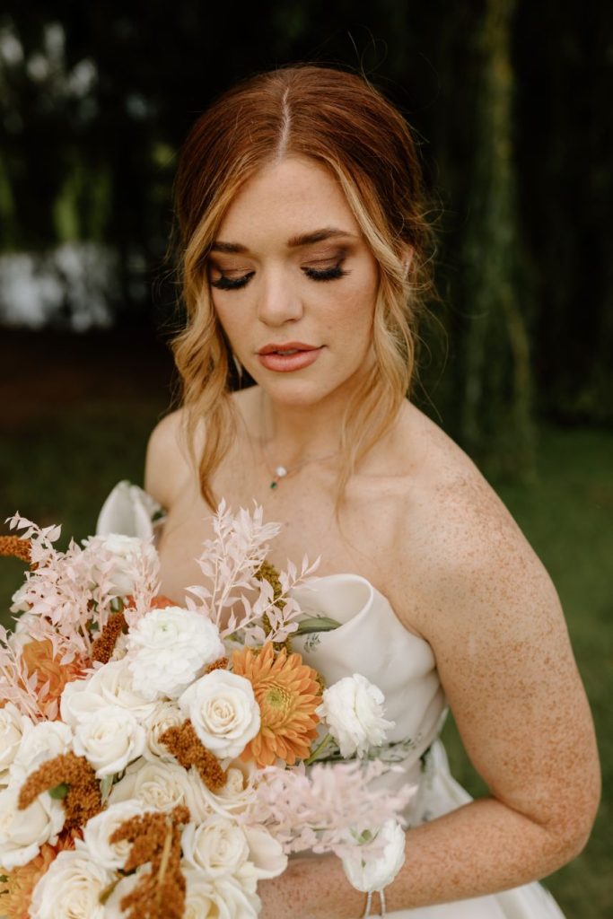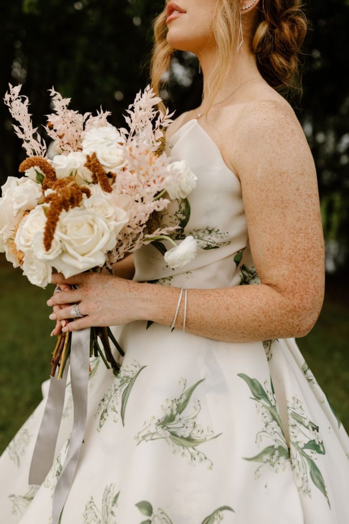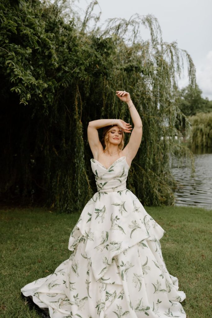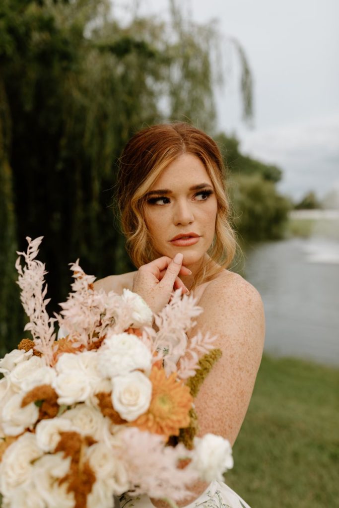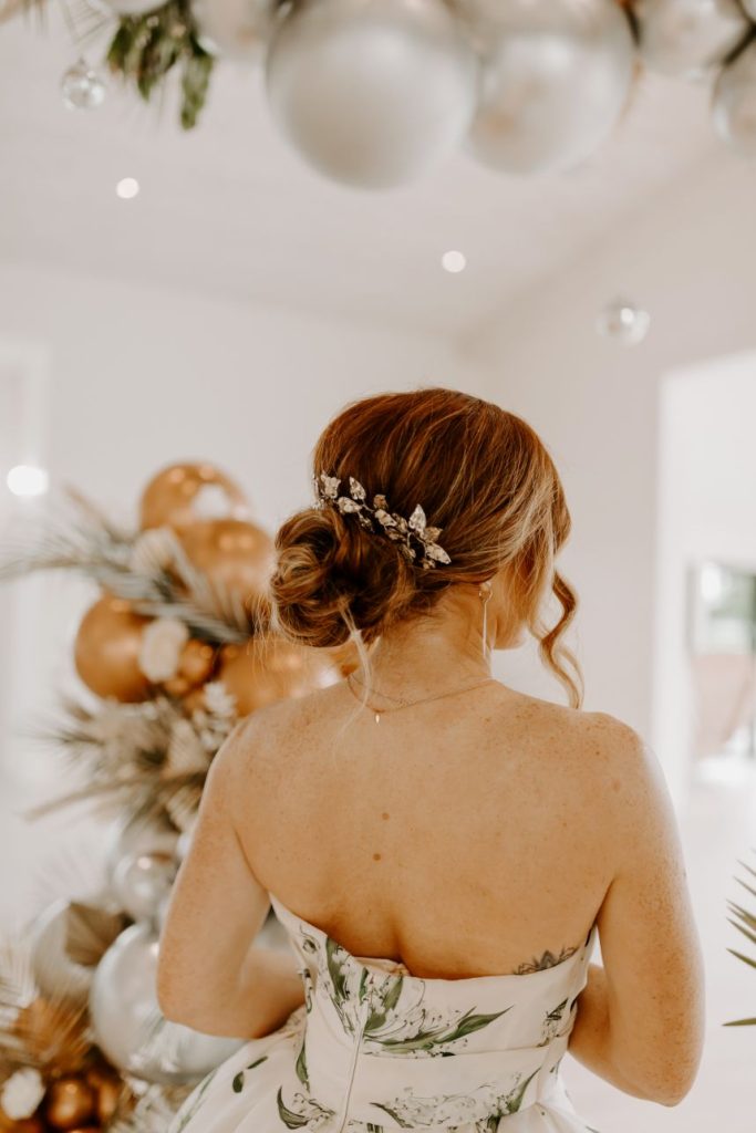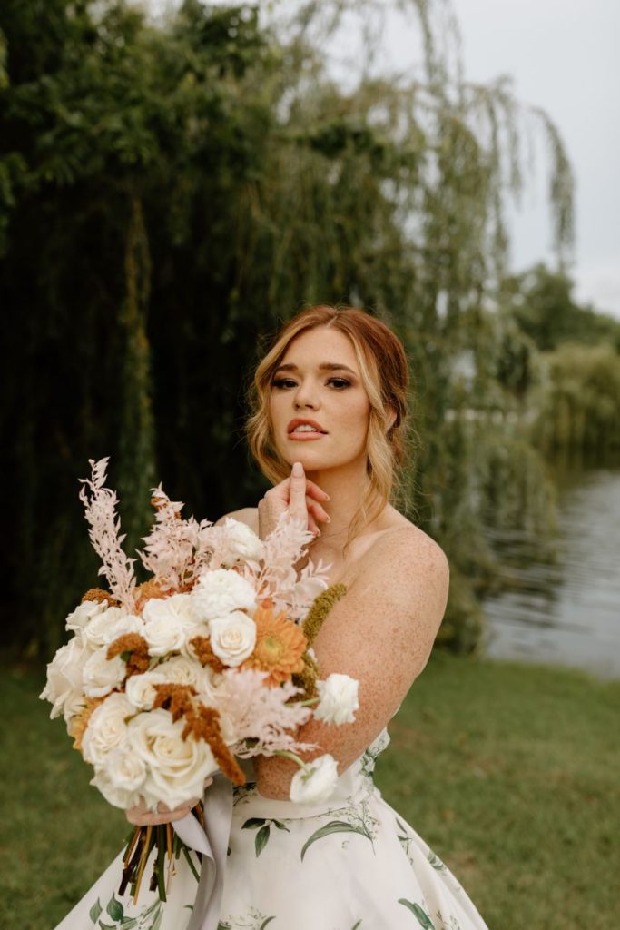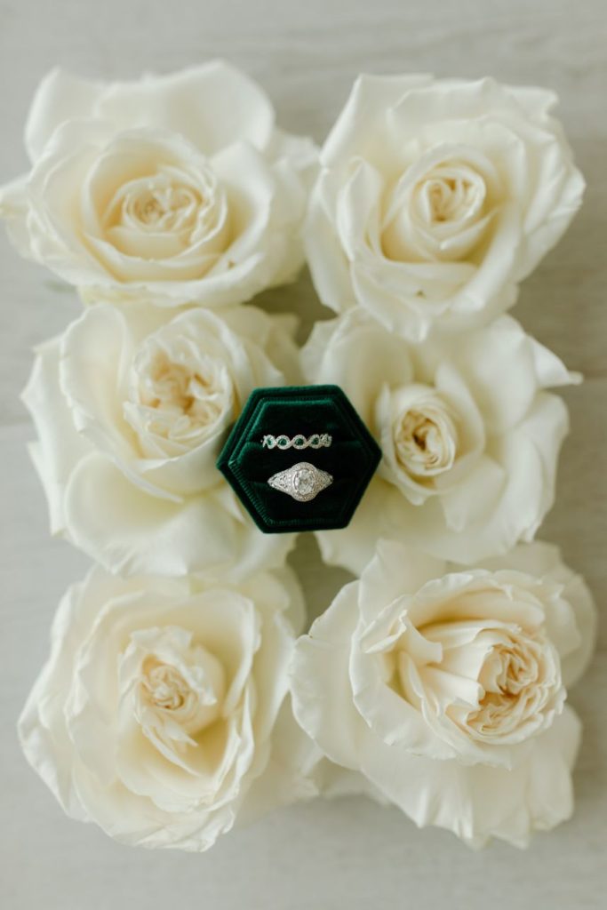 The planners at Forever Borrowed brought so much mod party style to this stately Ralph Lauren wedding inspiration captured by A.W. Photography Inc. in warm editorial scenes all around the iconic property at Aspen Ranch. Emerald accents and fall tones galore converge in the white-washed settings where decor and design truly took reign, complete with a few disco ball details sprinkled throughout. The grand Aspen Ranch chandelier was adorned with metallic balloons and tropical greenery alike by Wooden Hearts Boutique which set the tone for the creamy blooms and terracotta textures in a beautiful bridal bouquet created by Forever Borrowed. Our breathtaking brida modeled a look that brought all the elegance with a nontraditional floral-covered “Sweetness” Monique Lhuillier bridal gown from J.J. Kelly Bridal Salon that was simply to die for, plus gorgeous bling from Jay’s Jewelry and an opulent emerald band to match. Pictures and posing around the spacious venue property show off just how much you can do with bridal or wedding portraits with so many picturesque backdrops! A five-tiered marble wedding cake design by Sweet Devotion Cakery was a total showstopper and trimmed with gilded icing details, it’s even more irresistible. Ralph Lauren wedding inspiration like this one will be impossible to forget. Cheers!