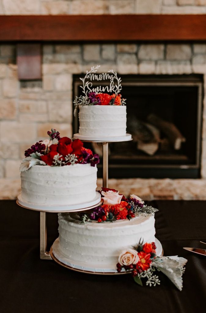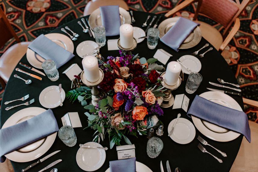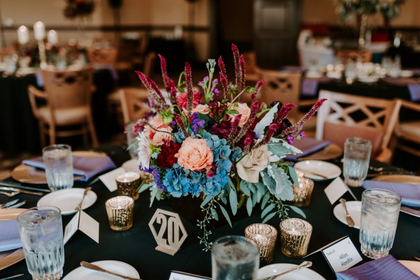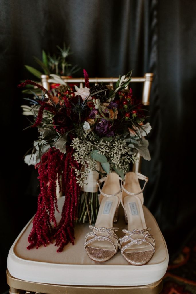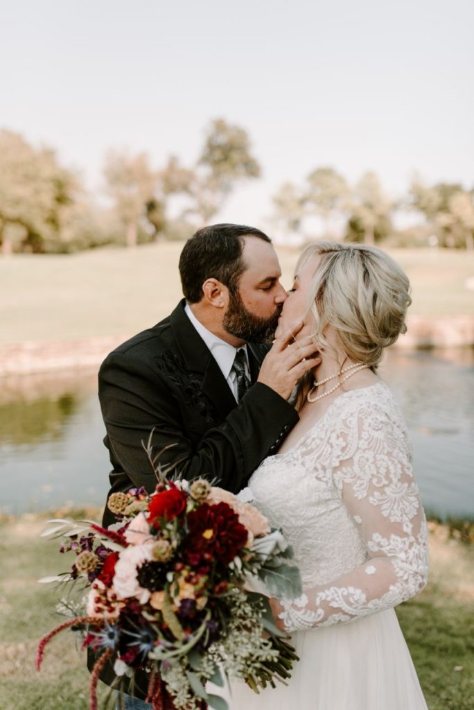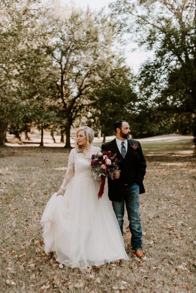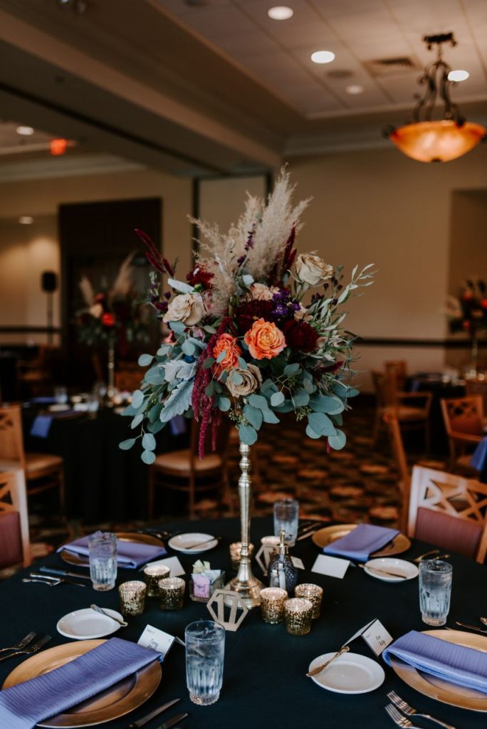 We’re living for the moodiness created by gorgeous florals in this boho chic wedding! It was the summer of 2009 when Kristin and Joey first met by chance while working at a surgery center as medical assistants. Kristin was just starting and Joey was returning from a recent surgery, back brace and all. They instantly became inseparable and the pair began their journey as a couple. Even after only a few months of dating, Kristin recalls telling her mother, “Be nice to this one, I plan on marrying him someday.” And so she did! Kristin and Joey tied the knot in an October wedding of romantic and moody tone. Its boho chic wedding style was pronounced by antique gold details and aubergine and maroon blooms that made up grand centerpieces from Enid Floral & Gifts that utilized natural textures which kept up the organic elegance vibe of it all.