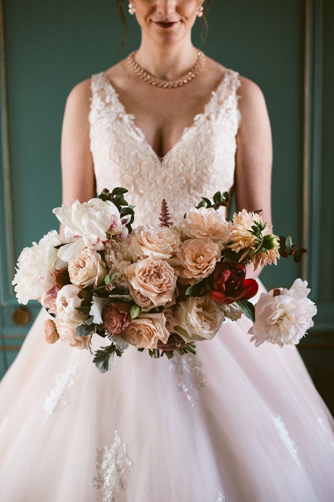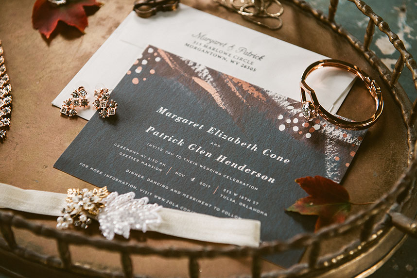 We are obsessed with the palette of Margaret and Patrick’s moody and mixed metal Oklahoma wedding. The groom wanted a winter wedding, so the couple chose Dresser Mansion for its easy warmth, intimacy and character. With friends and loved ones, an incredible dessert bar from The Round House Bakery and delicious food from 624 Catering, and it was the perfect party! Cheers to Margaret and Patrick!