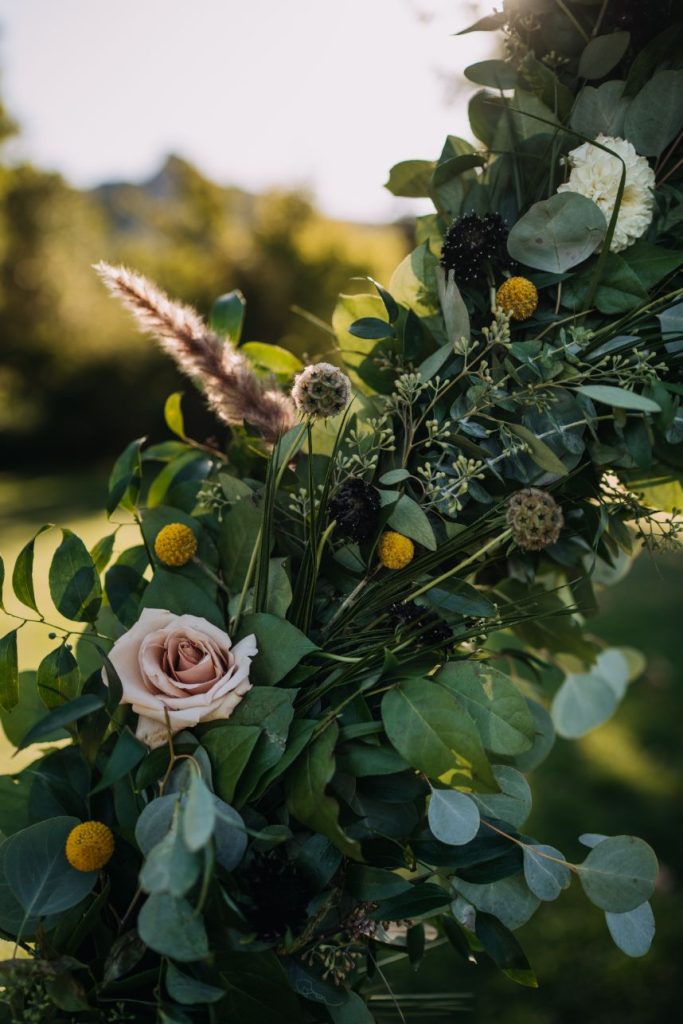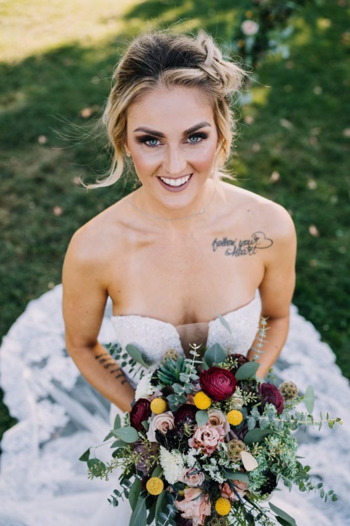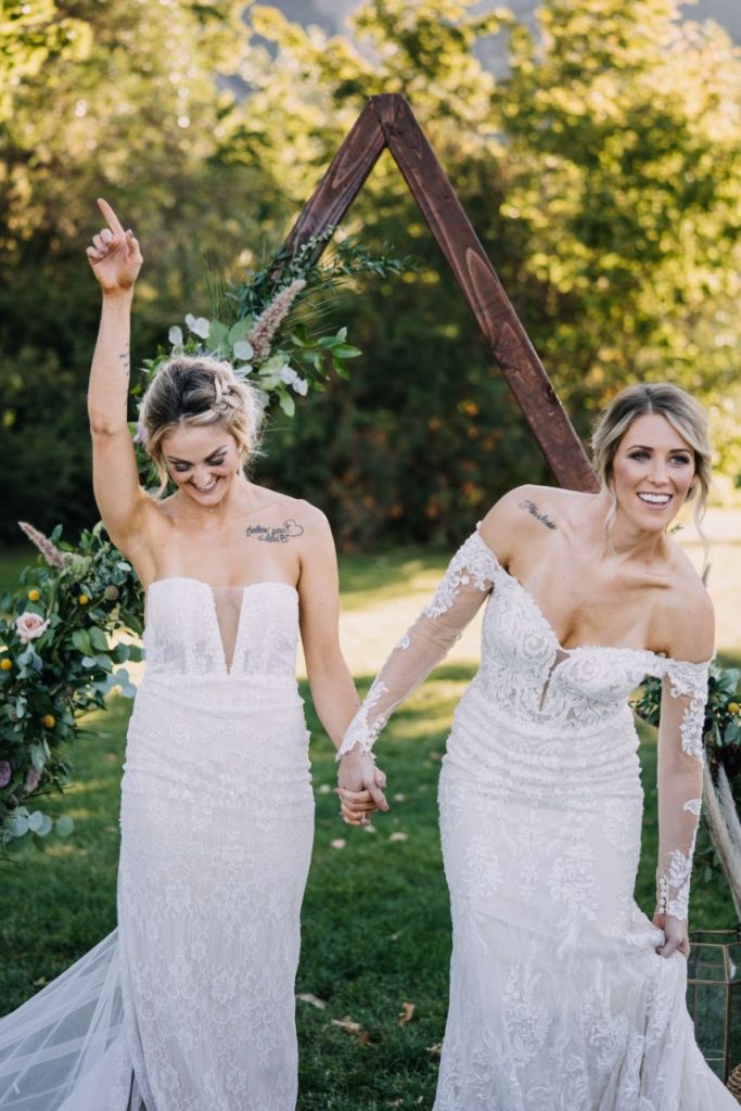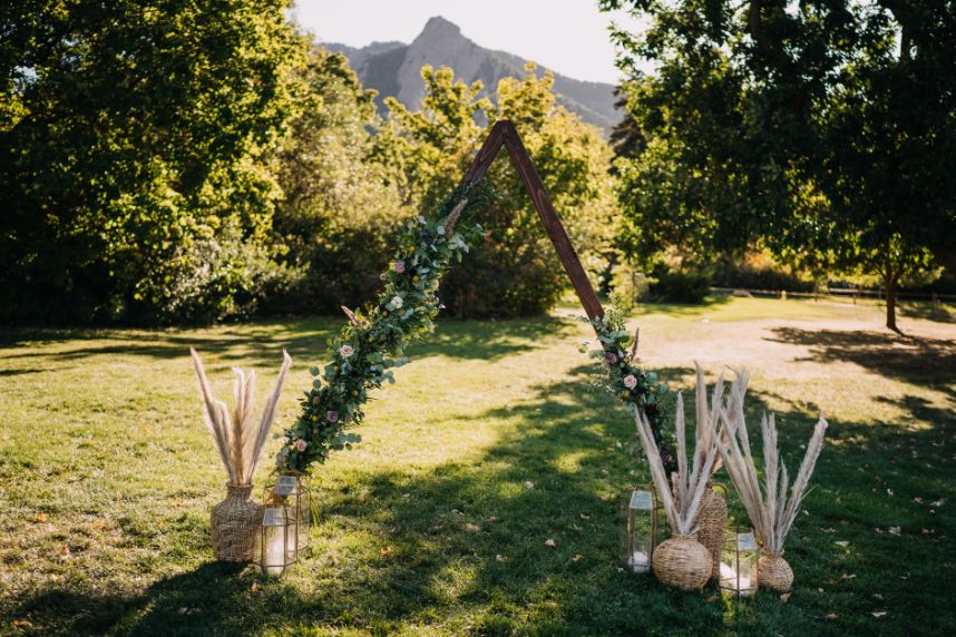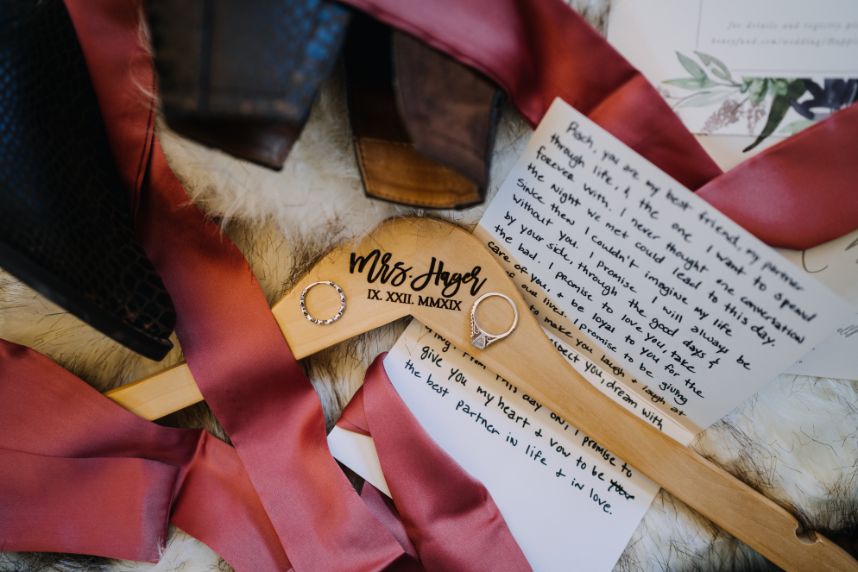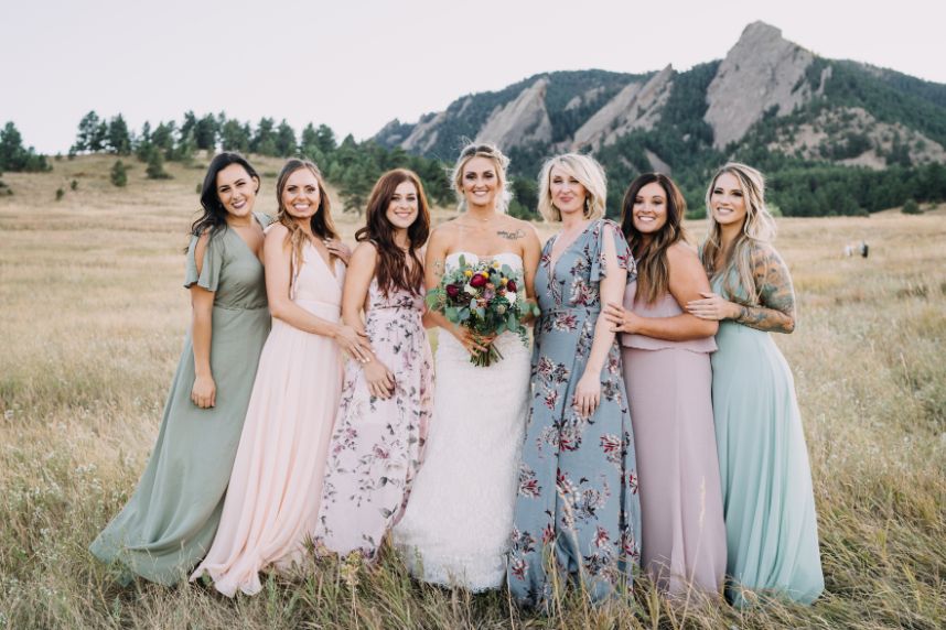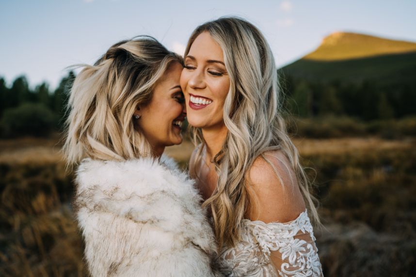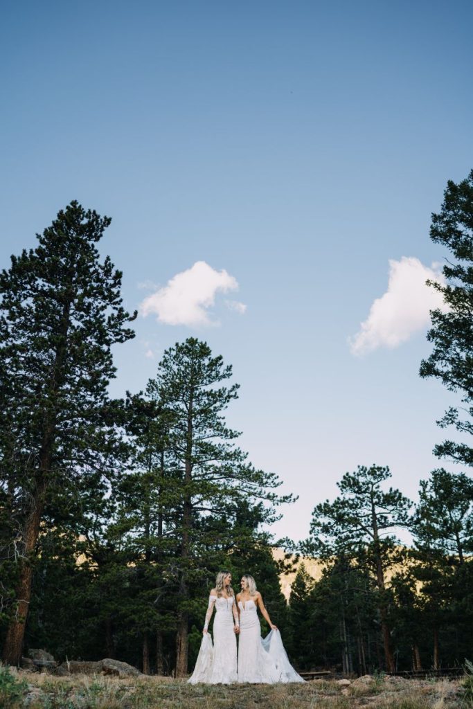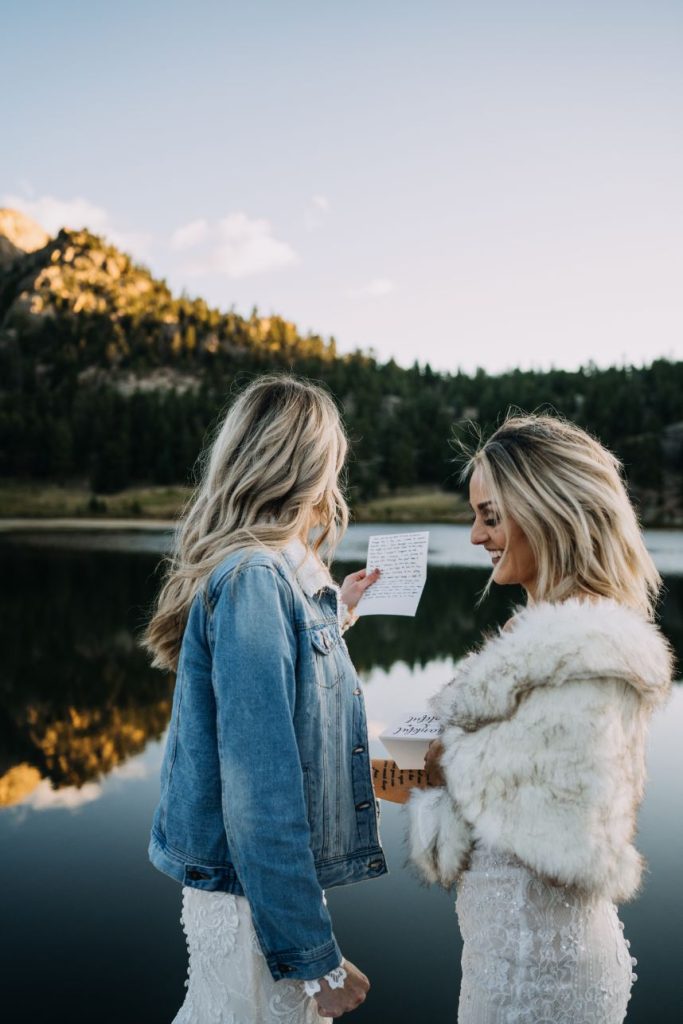 Mountainous scenery completes this bohemian Estes Park wedding. Nikki and Rachael began their wedding day with the sunrise. The couple went to Lily Lakes for their first look. Just as the sun was coming up, they exchanged their vows. After soaking up the moment, the couple went back to the cabin to get ready with their bridesmaids and prepare for the day. That evening, Nikki and Rachael made their way to Boulder, Colorado, for the ceremony. They exchanged rings from Kelley Jewelers while surrounded by family and friends. Although the mountains served as a picture perfect backdrop, Tony Foss Flowers created beautiful floral elements that added the a bohemian touch to the already gorgeous wedding. Keep reading for Rachael’s favorite part from their bohemian destination wedding day! Cheers to the happy couple!