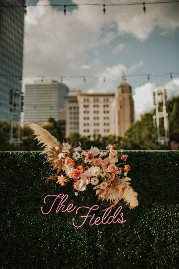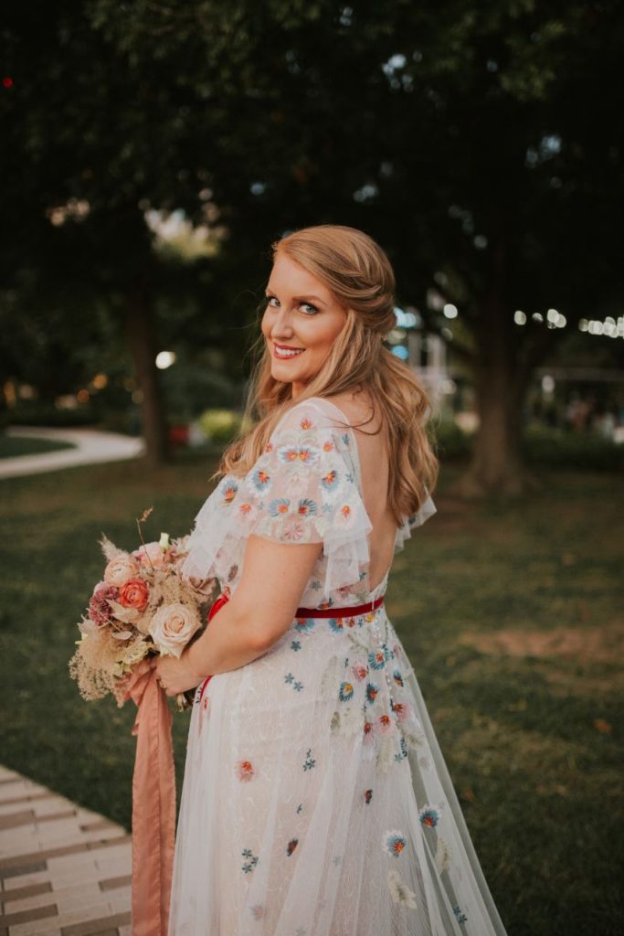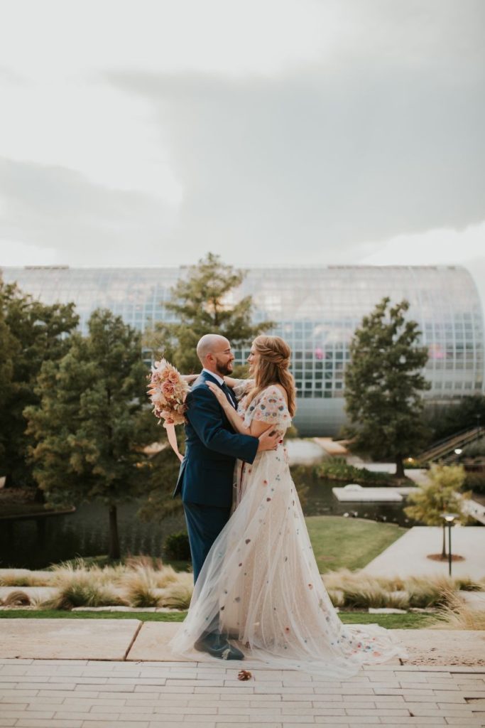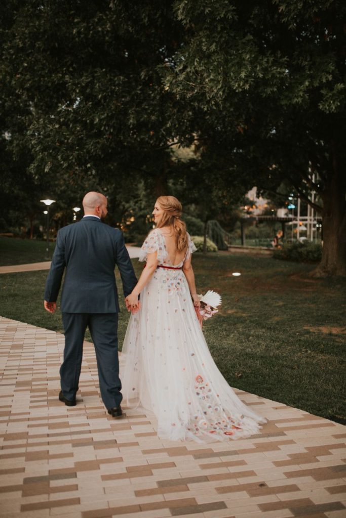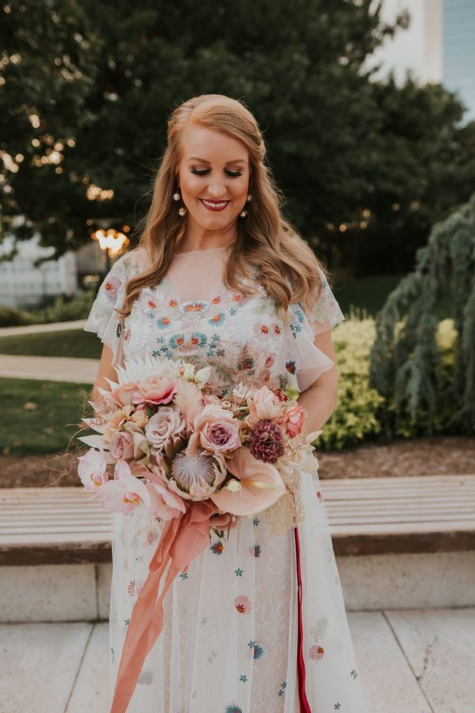 Held at the Park House at Myriad Gardens, we think this couple picked the perfect place to hold their modern tropics wedding! Jillian and Adam’s big day planned and coordinated by Fête is so full of so many trendy elements both modern and retro in style, and we can’t get over how stunning it all looks together! Celebrating their wedding a month after the couple’s intimate elopement, we love how this event has a relaxed and fun vibe carried throughout every wedding scene, filled with proteas and palm leaves, all beautifully arranged by XO by Haleigh Kenney. One of our favorite ones is the vintage lounge area created with retro pieces from Marianne’s Rentals Special Event Solutions, second only to the adorable nuptial neon donning the newlyweds’ shared name! Jillian looks absolutely radiant in a white fit-and-flare gown featuring a colorful scattering of floral embroidery and delicate flutter sleeves from J.J. Kelly Bridal Salon as well as a lovely illusion neckline. On the refreshments front, this wedding had the very best! Abbey Road Catering took care of delicious bites and bartending, while the team at Sparkling Tulips lent a white-gloved hand to this amazing living champagne wall! Talk about wild wedding vendors! These newlyweds radiate pure joy strolling together under the romantic string lighting of their oh-so-stunning modern tropic wedding. Cheers to Jillian and Adam!