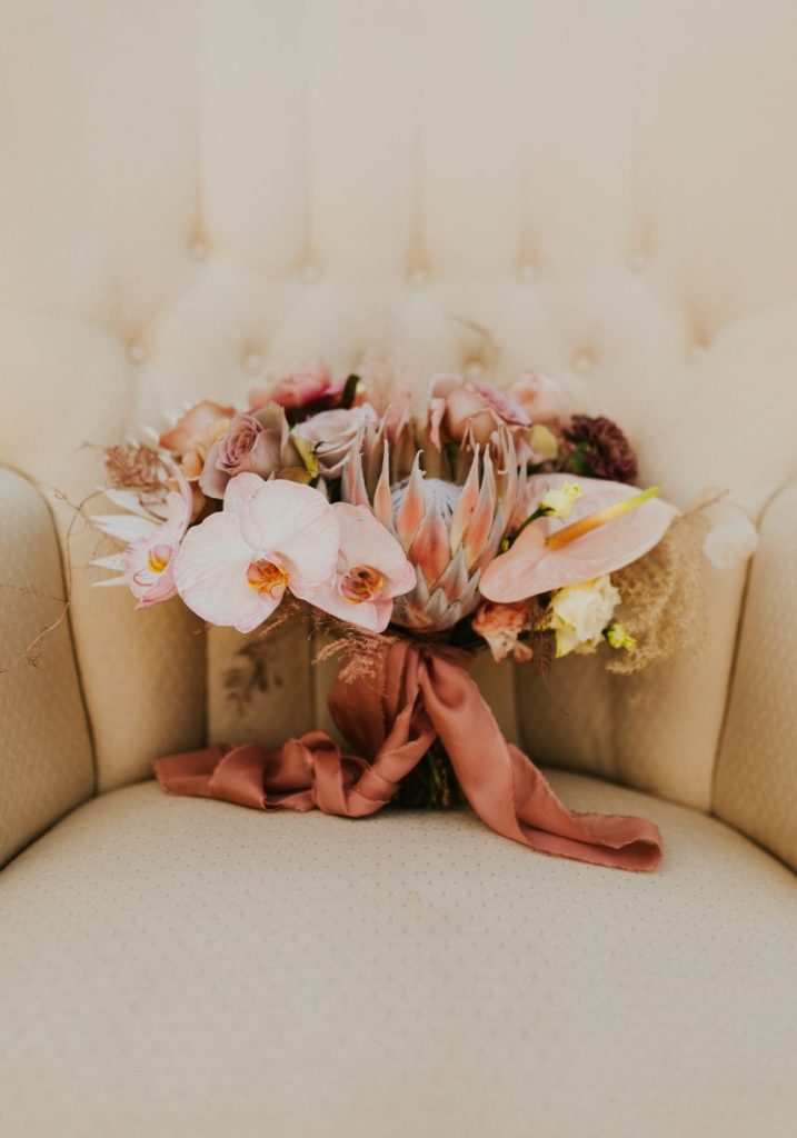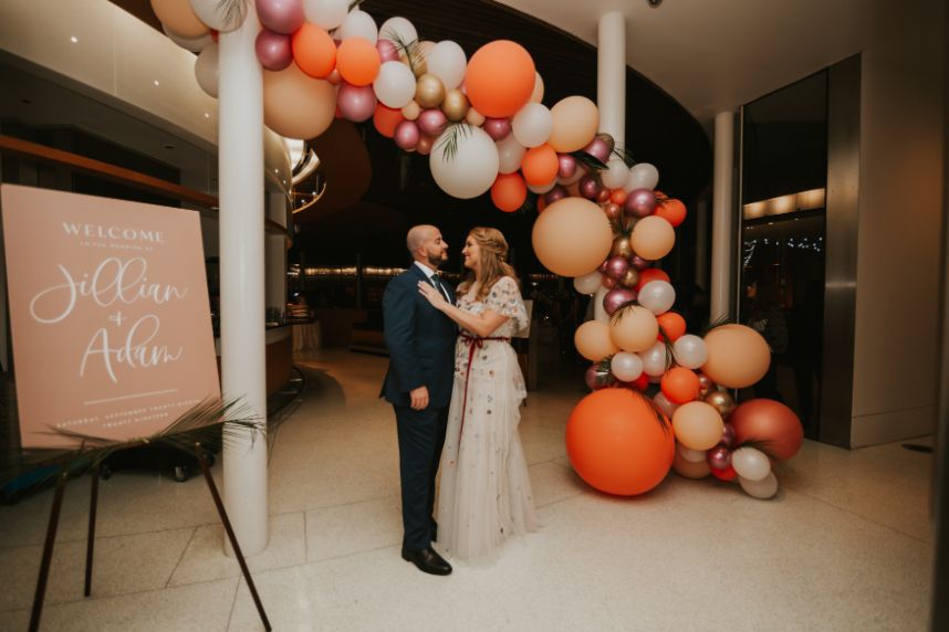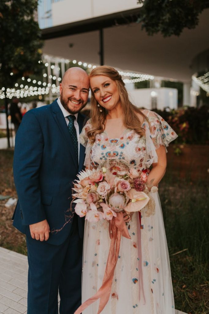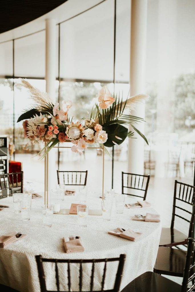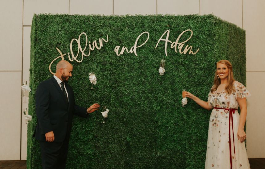 Held at the Park House at Myriad Gardens, we think this couple picked the perfect place to hold their modern tropics wedding! Jillian and Adam’s big day planned and coordinated by Fête is so full of so many trendy elements both modern and retro in style, and we can’t get over how stunning it all looks together! Celebrating their wedding a month after the couple’s intimate elopement, we love how this event has a relaxed and fun vibe carried throughout every wedding scene, filled with proteas and palm leaves, all beautifully arranged by XO by Haleigh Kenney. One of our favorite ones is the vintage lounge area created with retro pieces from Marianne’s Rentals Special Event Solutions, second only to the adorable nuptial neon donning the newlyweds’ shared name! Jillian looks absolutely radiant in a white fit-and-flare gown featuring a colorful scattering of floral embroidery and delicate flutter sleeves from J.J. Kelly Bridal Salon as well as a lovely illusion neckline. On the refreshments front, this wedding had the very best! Abbey Road Catering took care of delicious bites and bartending, while the team at Sparkling Tulips lent a white-gloved hand to this amazing living champagne wall! Talk about wild wedding vendors! These newlyweds radiate pure joy strolling together under the romantic string lighting of their oh-so-stunning modern tropic wedding. Cheers to Jillian and Adam!