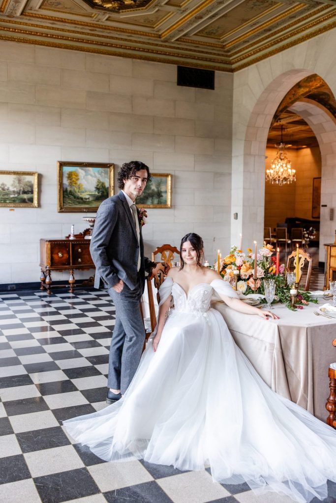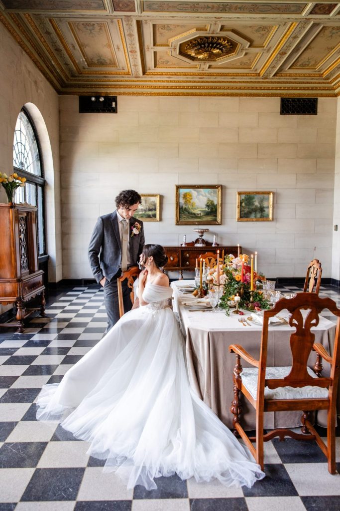 The wedding team dedicated months to crafting every detail for this Marland Mansion styled shoot, aiming to provide the ideal inspiration for Fall and Winter couples. The outcome? We are absolutely obsessed with the combination of Nat King Cole’s “Tis Autumn” and Taylor Swift’s “Love Story” themes that infused magic into this styled shoot. A heartfelt shoutout goes to the incredible vendor team who seamlessly brought this vision to life—Terri Graves Photography + Films, Faithful Events Co., Chantilly Bridal Studio, Mishelle Handy Cakes, Marianne’s Rentals, Ribbon & Blooms Floristry LLC, Chelsey Ann Artistry, The Marland Mansion and Well Told Film Co.!
