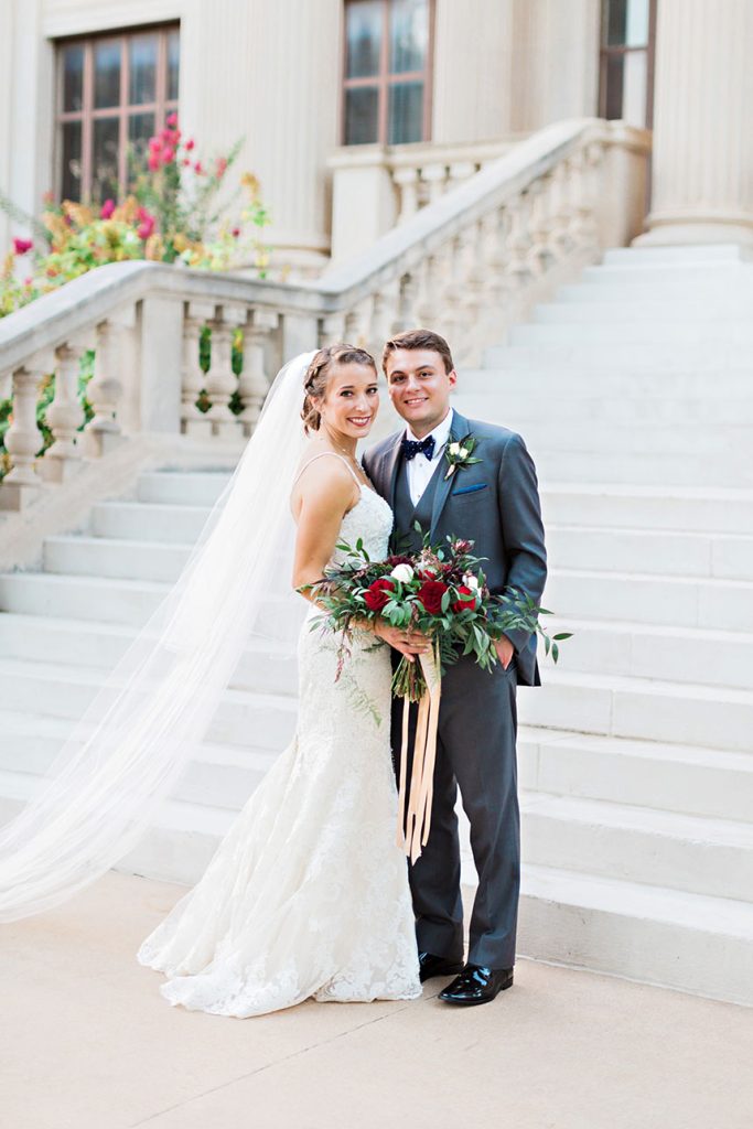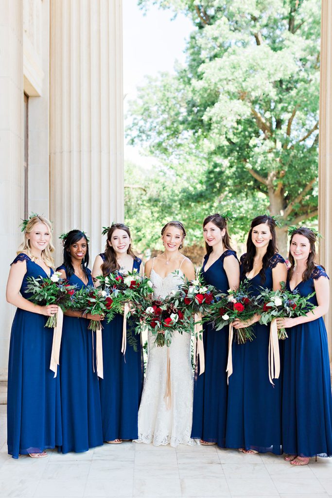 We adore the hues Alaina and Matthew chose for their navy and crimson Oklahoma wedding at the Gaylord-Pickens Museum Home of the Oklahoma Hall of Fame! Wedding Planner extraordinaire Malyn from Malyn Made Weddings designed and handled all the details for their lovely outdoor ceremony and grand indoor reception. Take a look at this gorgeous Oklahoma wedding captured by Kristen Edwards Photography!