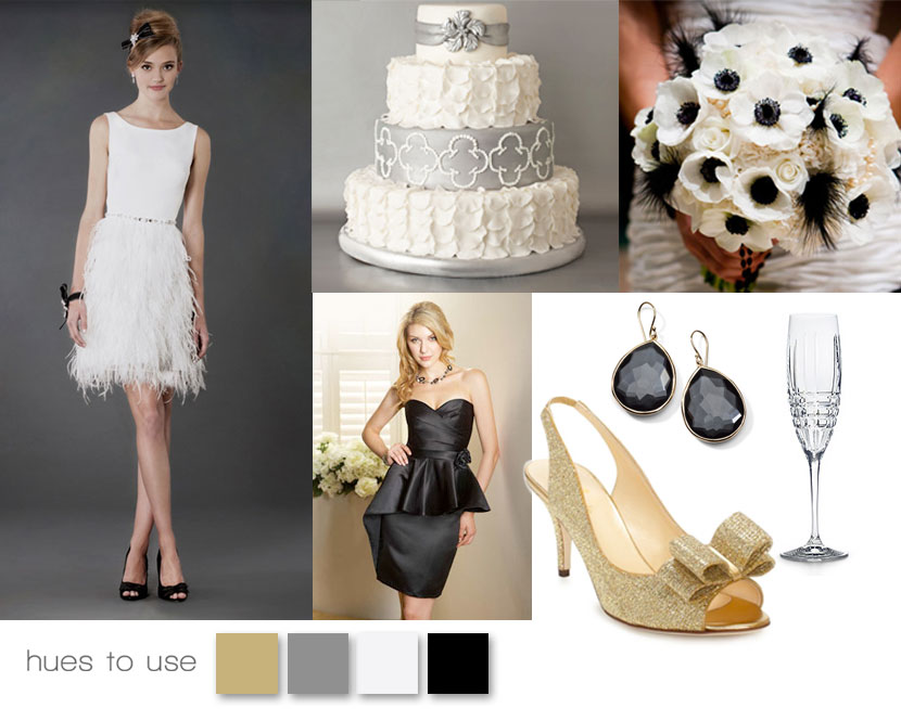 Inspired by New Year’s Eve, we pulled together classic black and white numbers with pops of silver and gold. We can’t get enough of this short feathered cocktail style LWD by Alyne, available locally at BeLoved Bridal Boutique. Pair that with black stone jewelry like these Ippolita teardrop earrings available at B.C. Clark Jewelers, sparkly pumps like these gold Kate Spade bowed beauties and a brilliant white and black bouquet like this one from Rebecca’s Silver Rose (photo by Colorband PhotoArtisans). Your bridesmaids would perfectly complement your fun evening look with a black number like this Belsoie peplum dress found locally at Facchianos and Moliere Bridal. Cut your sparking silver cake like this work of art by Madison’s on Main (photo by Kevin Paul Photography) and toast to the evening in Tiffany’s champagne flutes. Farewell 2012 – Cheers to all the love and happiness 2013 is sure to bring!