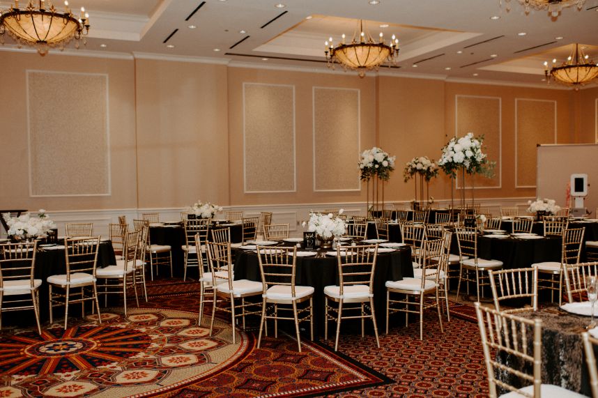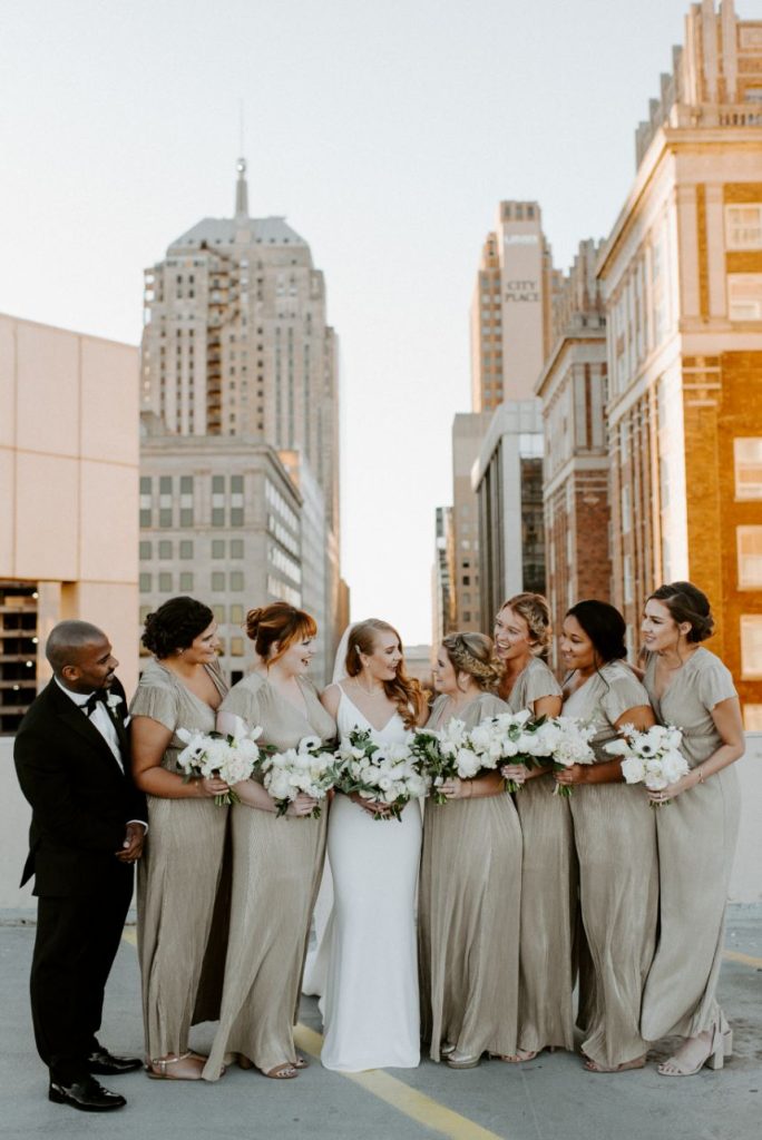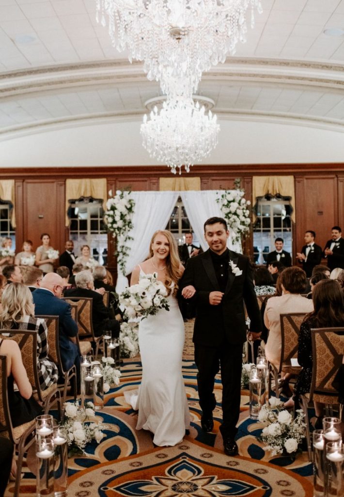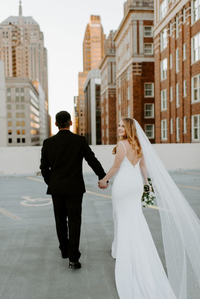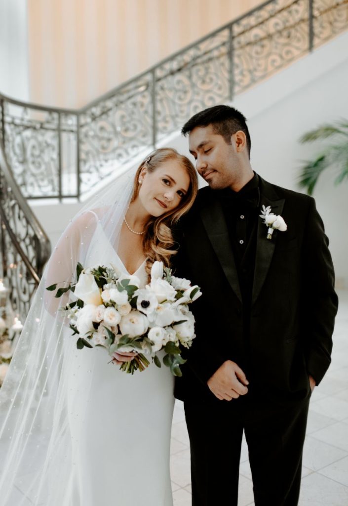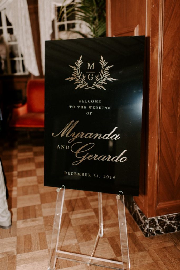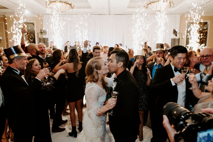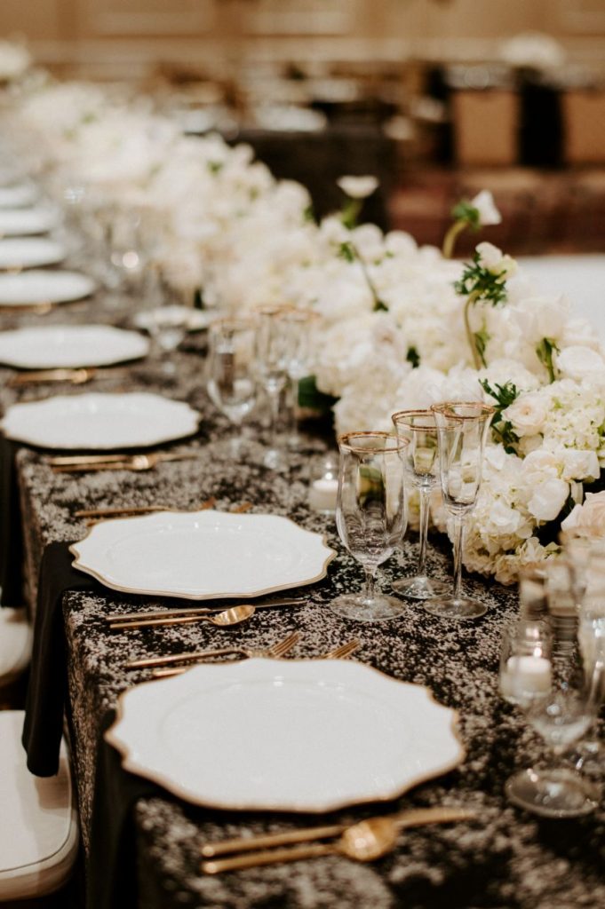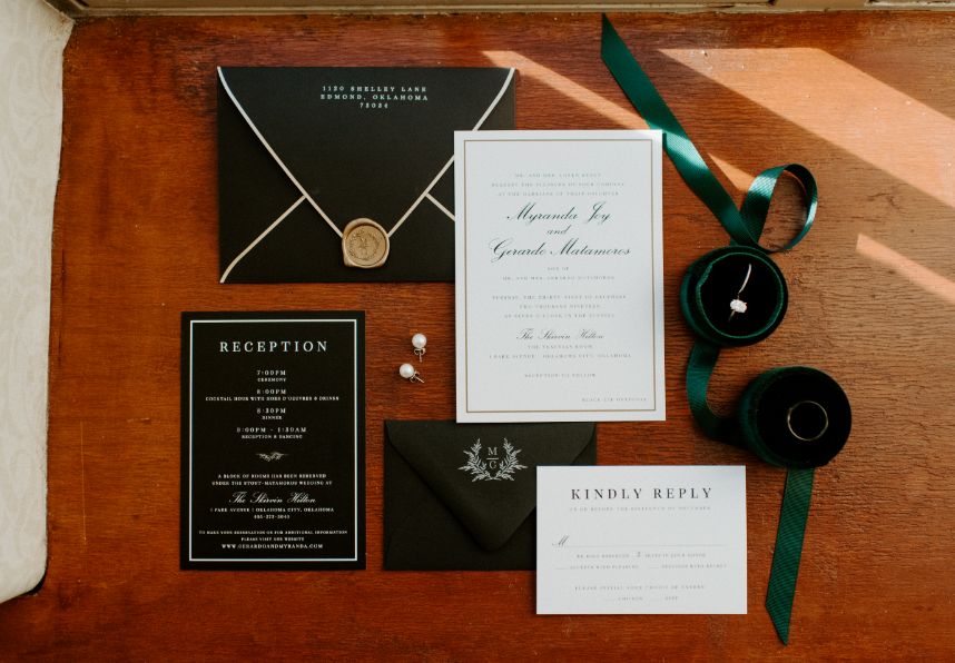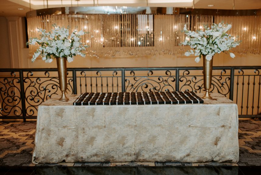 Glitzy pops of black and gold was the perfect color palette for this Gatsby inspired New Year’s Eve extravaganza. The stunning Skirvin Hilton Hotel gave this wedding celebration just the right amount of glamour to go with the overall Art Deco theme of this day. Planned by Fête, this wedding went off with a bang with every detail planned to a tee. Tablescapes lined with sparkly gold accents from Mood Party Rentals bring in that classic Roaring 20’s vibe to the reception space, and blooms in crisp white from XO by Haleigh Kenney truly elevated the space. Myranda was glowing in her sleek silk gown from Chantilly Couture with delicate spaghetti straps and a plunging V-neck. After cocktails were sipped and food was enjoyed, the guests tore it up on the dance floor to smooth jazz from Box Talent’s band, The Wavetones. To finish this wedding off on a sweet note, Amy Cakes created an oh-so lavish four-tier cake with gold icing topped with fresh white flowers. Scroll to read the bride’s favorite wedding day memory and to see all the classically glam Gatsby details that got the bride, groom and their guests in the New Year’s Eve spirit! Cheers to Mr. and Mrs. Matamoros!