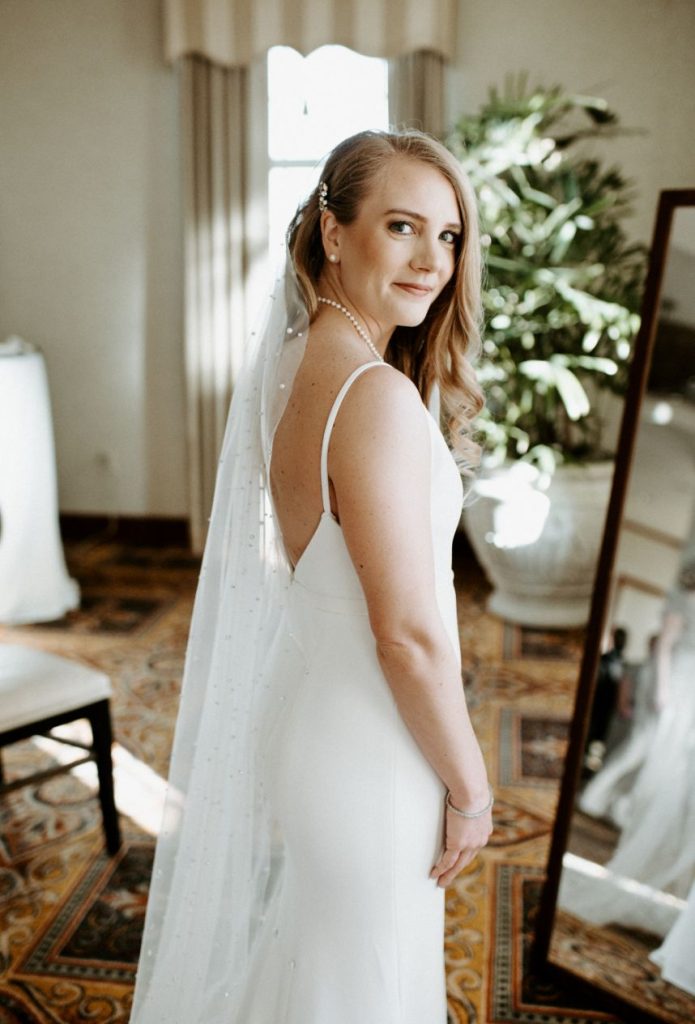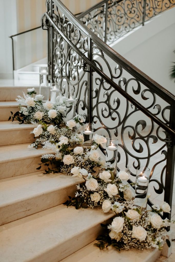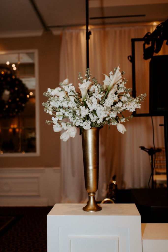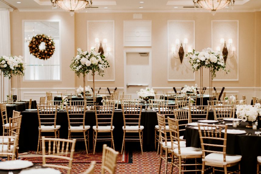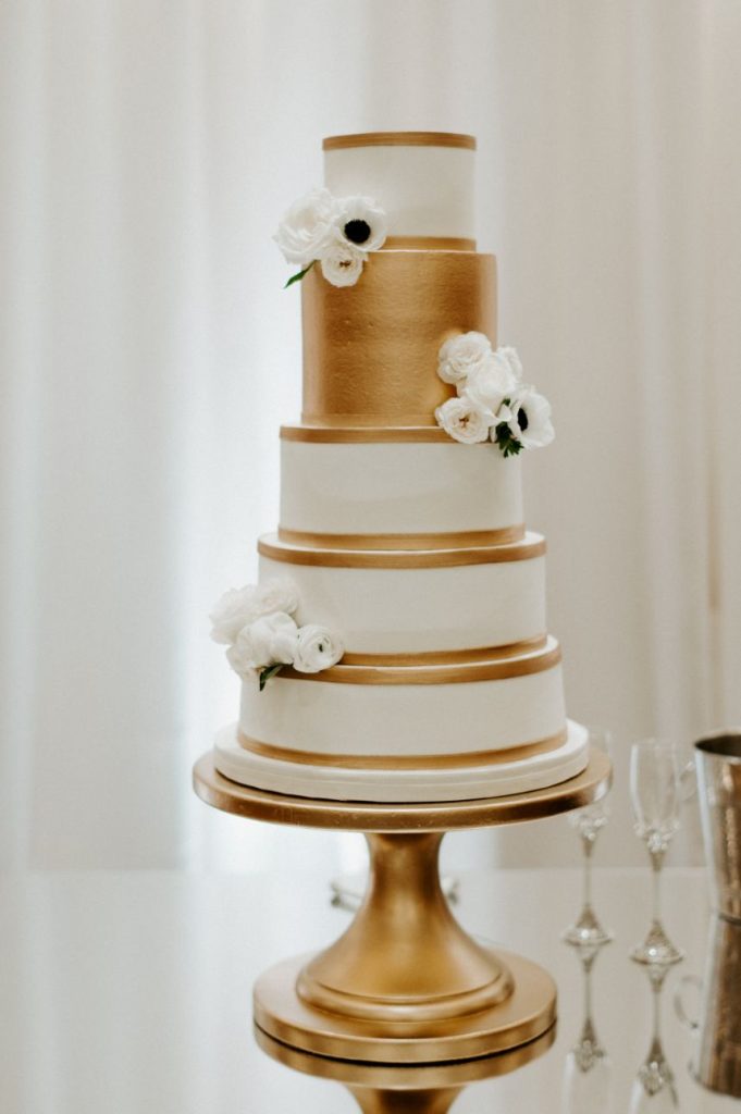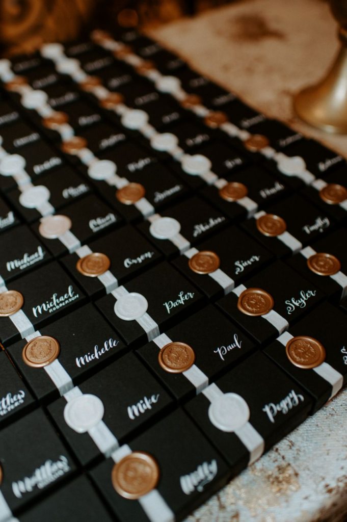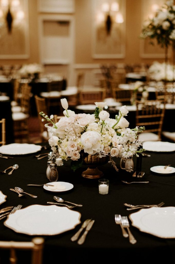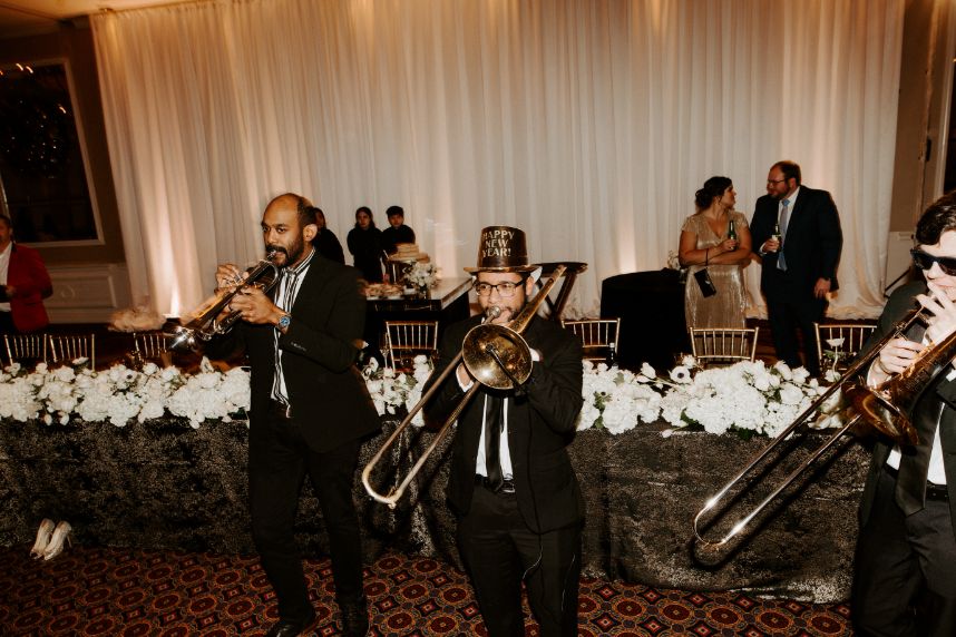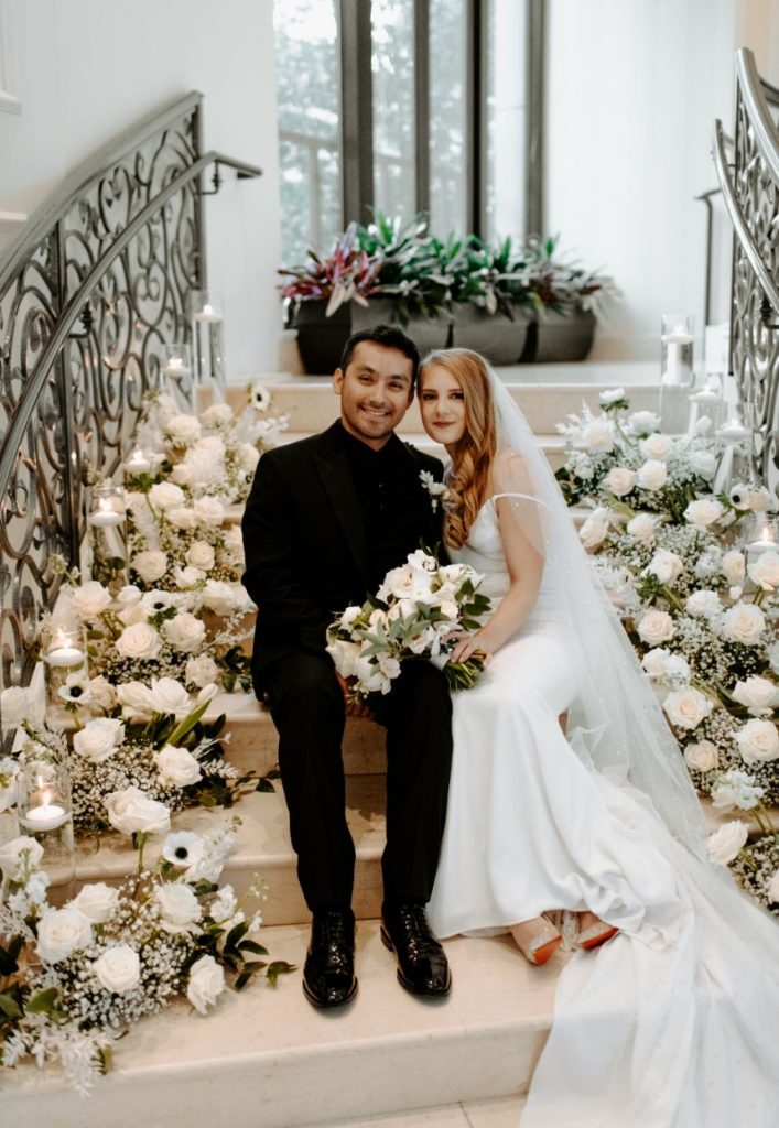 Glitzy pops of black and gold was the perfect color palette for this Gatsby inspired New Year’s Eve extravaganza. The stunning Skirvin Hilton Hotel gave this wedding celebration just the right amount of glamour to go with the overall Art Deco theme of this day. Planned by Fête, this wedding went off with a bang with every detail planned to a tee. Tablescapes lined with sparkly gold accents from Mood Party Rentals bring in that classic Roaring 20’s vibe to the reception space, and blooms in crisp white from XO by Haleigh Kenney truly elevated the space. Myranda was glowing in her sleek silk gown from Chantilly Couture with delicate spaghetti straps and a plunging V-neck. After cocktails were sipped and food was enjoyed, the guests tore it up on the dance floor to smooth jazz from Box Talent’s band, The Wavetones. To finish this wedding off on a sweet note, Amy Cakes created an oh-so lavish four-tier cake with gold icing topped with fresh white flowers. Scroll to read the bride’s favorite wedding day memory and to see all the classically glam Gatsby details that got the bride, groom and their guests in the New Year’s Eve spirit! Cheers to Mr. and Mrs. Matamoros!
