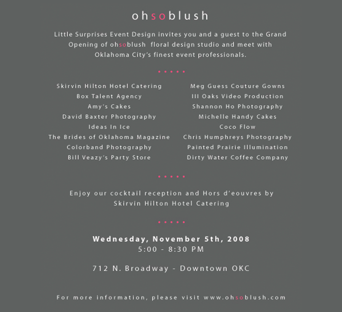 Little Surprises Event Design is hosting the grand opening of its sister company, Oh So Blush Floral Design Studio, this Wednesday, November 5, 2008 from 5-8:30 p.m. Bring a friend and come see and experience the amazing talent of Rebecca Thai and her team of professionals. Don’t miss the celebration with cocktails and Hors d’ oeuvres by the Skirvin Hilton Hotel Catering! Oh So Blush is located at 712 N. Broadway in downtown Oklahoma City. For more information, visit www.ohsoblush.com.