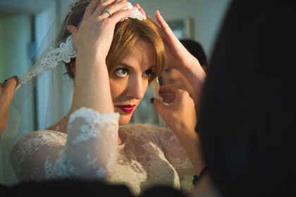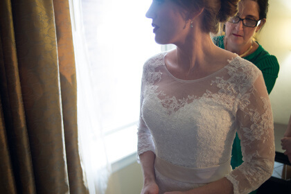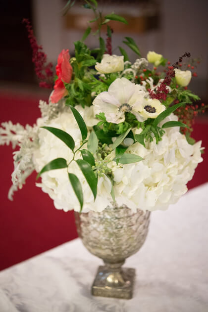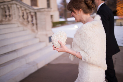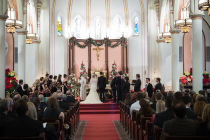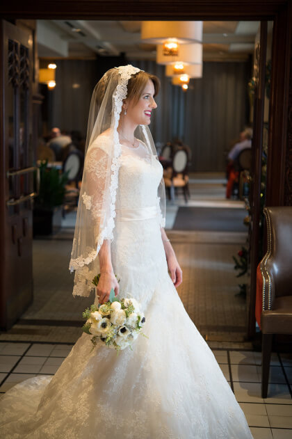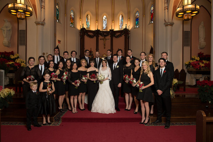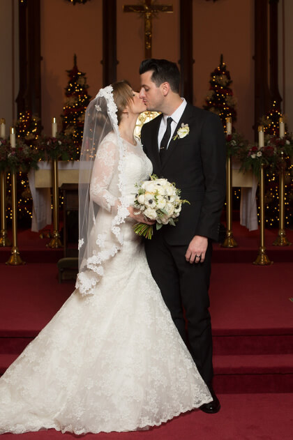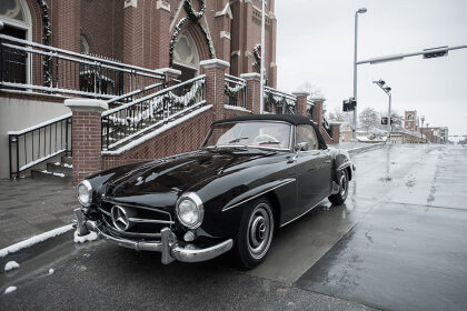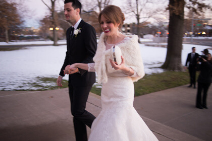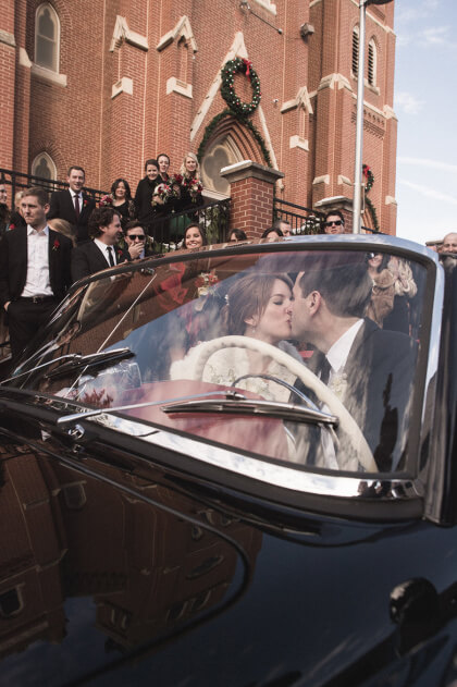 Lauren had always dreamed of a winter wedding, so they set the date for the following December. Oklahoma City will always be home to the couple, so they were married at St. Joseph Old Cathedral and held their reception at the Gaylord-Pickens Oklahoma Heritage Museum. It snowed more than three inches on their wedding day, which made for a romantic, sparkling setting. Because of the blankets of snow, the couple won BC Clark’s “Pray for Snow” contest. Lauren wore her mother’s beautiful vintage lace veil and heirloom fur over a customized Claire Kennedy Design gown. Her bridesmaids wore black cocktail dresses of their choice. Kevin and his groomsmen wore black suits with Oklahoma City Thunder-themed dress socks. Following the ceremony, the couple made their exit in a 1961 Mercedes-Benz roadster borrowed from dear friends.