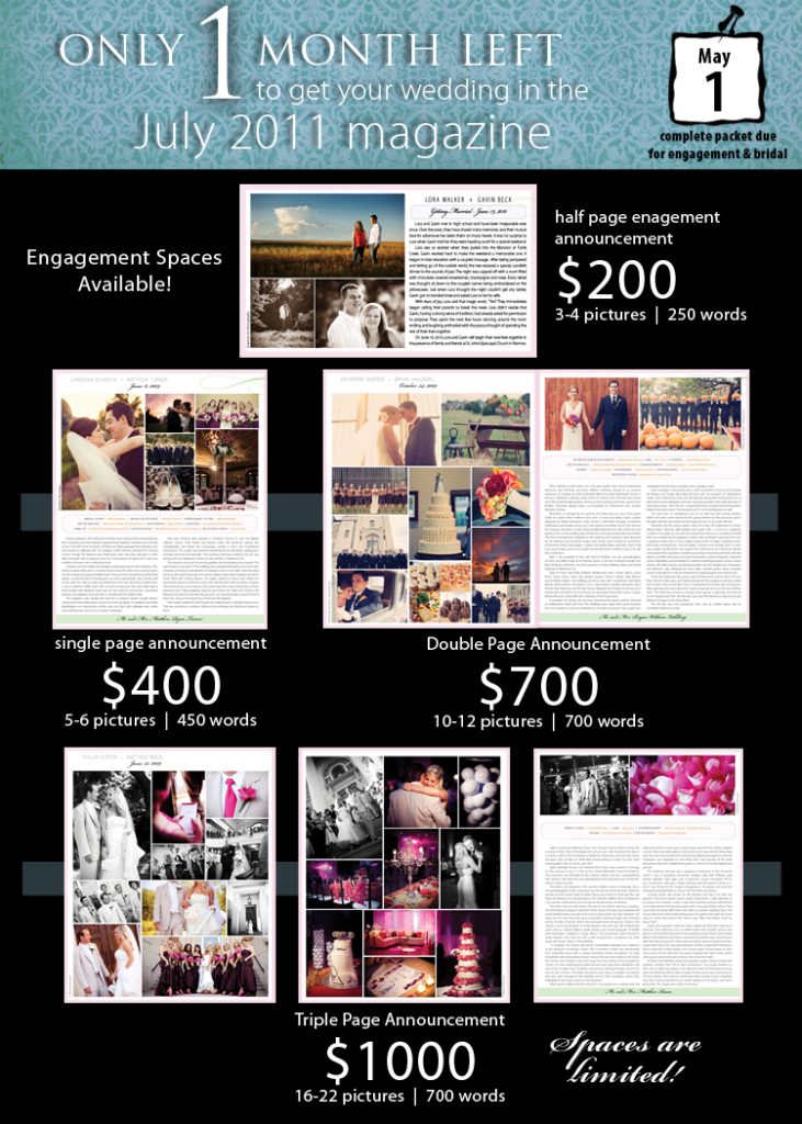 Time is running out! There is only one month left to announce your wedding or engagement in the upcoming July issue of Brides of Oklahoma. If you’re looking for the perfect keepsake and a great way to commemorate your big day, be sure to check out our wedding and engagement announcements! All announcements are full-color and include several pictures along with a write-up! Brides can choose from a single or double page wedding announcement or an engagement announcement! Limited triple page wedding announcement space is also available. The deadline to submit your completed engagement or wedding announcement packet is coming up quickly on May 1. Be sure to reserve your spot online right away — space is limited! Reserve your wedding announcement space online by following this link. To download the bridal packet, click here. To reserve your engagement announcement and to download the engagement packet, click here. To make things even easier, you can now fill out the information portion of the packet online — www.thebridesofoklahoma.com/online-bridal-packet or www.thebridesofoklahoma.com/online-engagement-packet! If you have any questions, email Alli at [email protected] or call 405.607.2902. Happy Friday!
