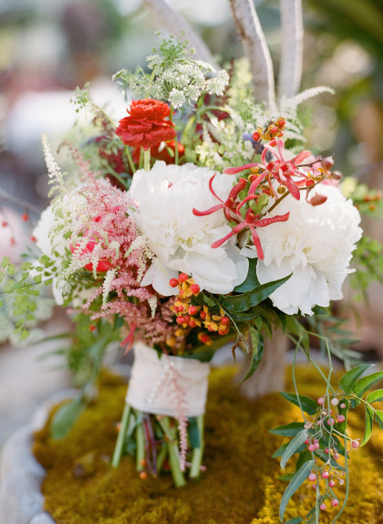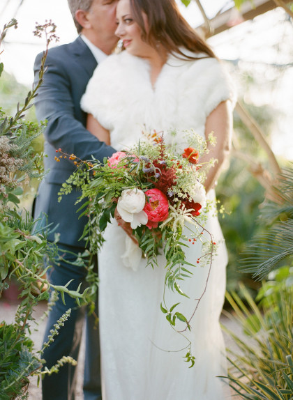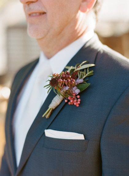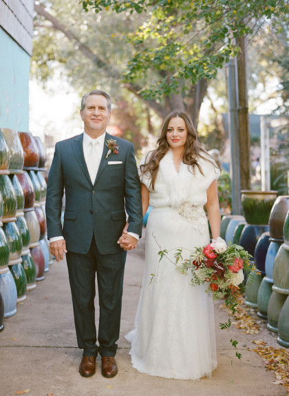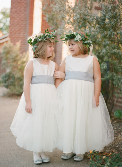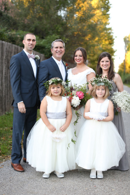 The bride carried a stunning bouquet composed of flowers in all shades of autumn that was a large, wild mix reflecting the fall garden theme of the event. Florals included olive branches, passion vine, red and terracotta ranunculus, pepper berries, ivory garden roses, Queen Anne’s lace, willow seeded eucalyptus, navy berries and seasonal peonies. In addition to her bundle of blooms, Lacy had her sister, Bethany Nissen, by her side as her maid of honor. She wore a grey floor-length silk chiffon dress from J. Crew Wedding with a one-shoulder neckline. Bethany carried a bouquet composed entirely of baby’s breath. Lacy’s cousins, Charli and Jasmyn Floyd, served as flower girls wearing darling flower crowns and carrying flower petals in the same baskets the bride’s parents used on their wedding day. Mark’s dashing son, Brian Cejda, stood by his father’s side as the best man.