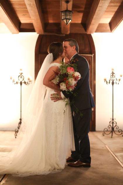 Location was everything for the couple when planning their nuptials. The ceremony was held at The Chouse in Norman, formerly the St. Thomas More University Parish where the groom attended church as a boy. Lacy Dawn Tyndall married Mark Jerome Cejda on November 2, 2013, in front of an intimate group of family and friends. Rod Macllvaine, the bride’s childhood pastor from Grace Community Church in Bartlesville, officiated the ceremony. The bride was escorted down the aisle by her father, Michael Tyndall, in a beautiful white gown by Maggie Sottero. Lacy adorned her outfit with a flower sash and cathedral-length veil made of white tulle. She wore her grandmother’s wedding ring and handkerchief, as well as the earrings her parents gave her as a wedding gift.